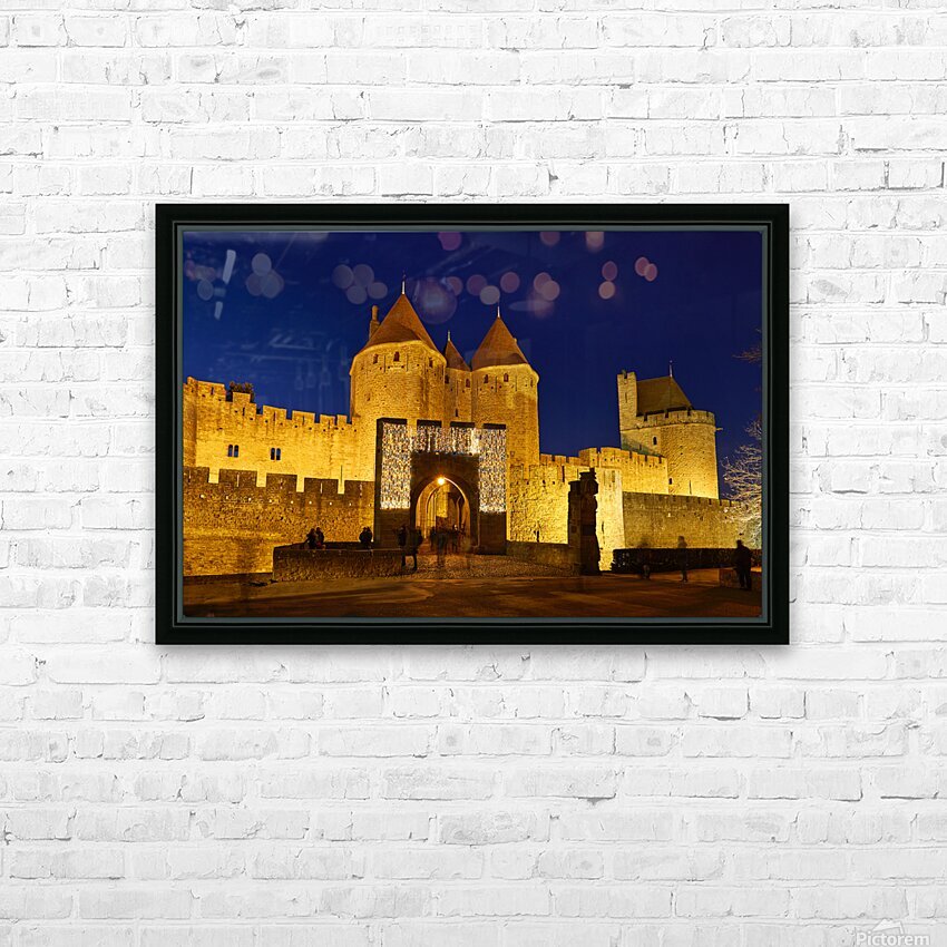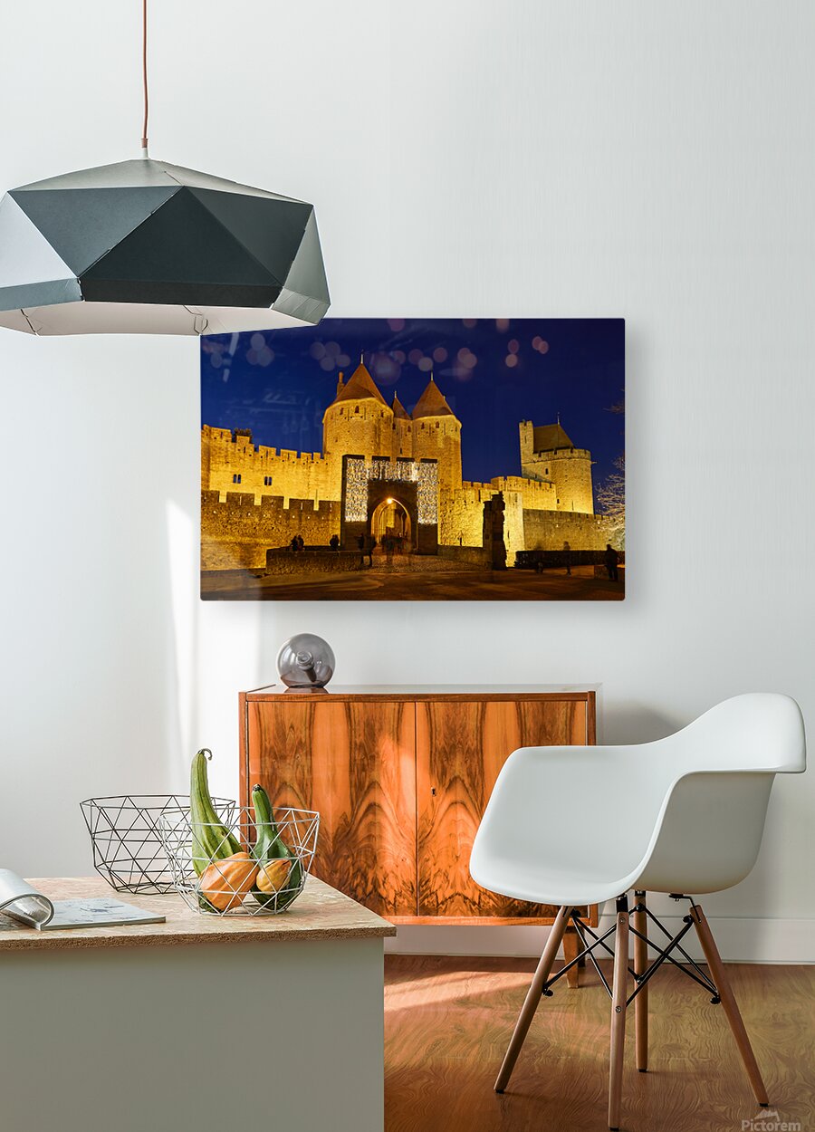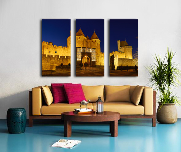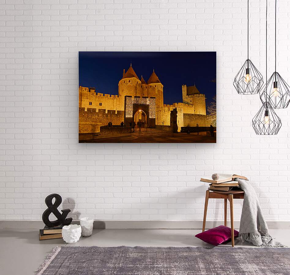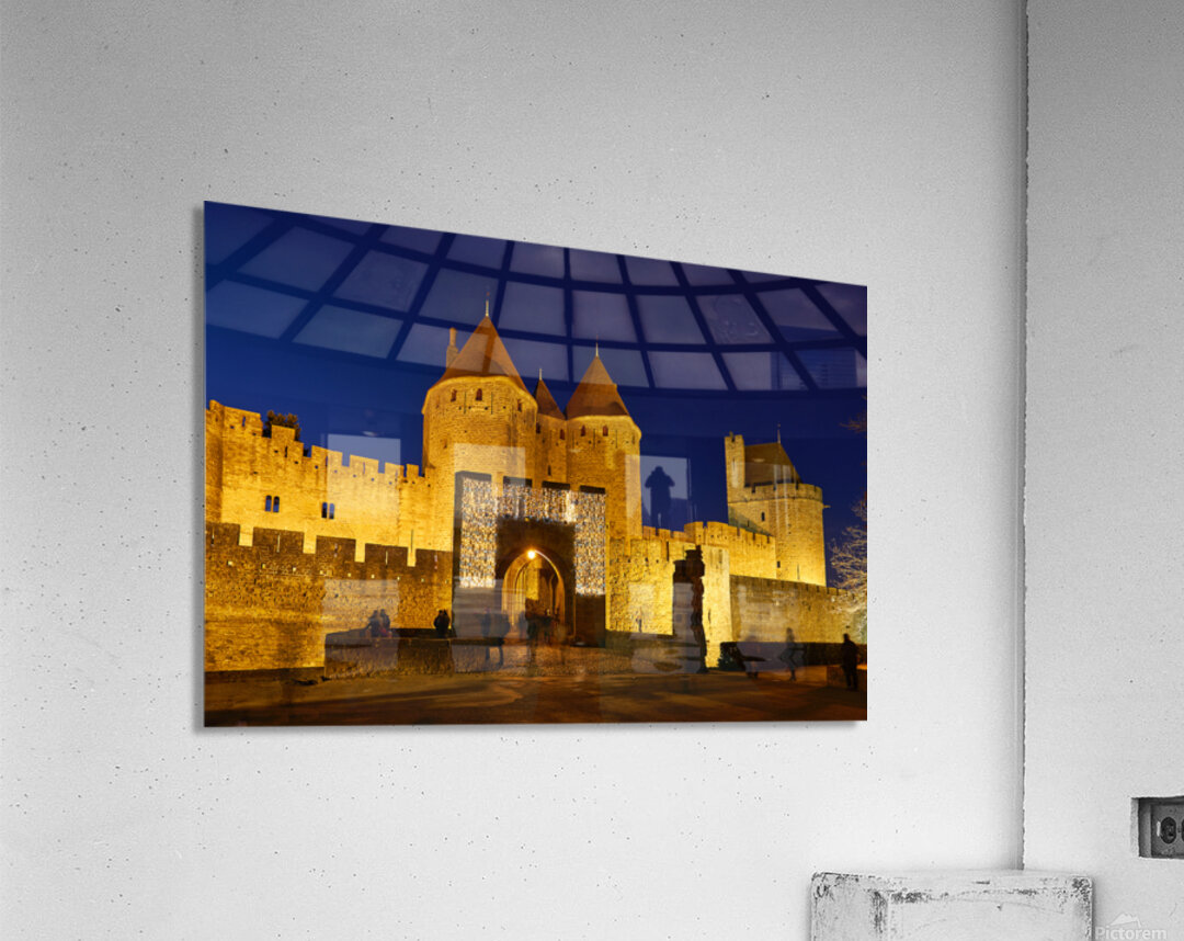 People walk near the bright entrance of Carcassonne castle at night. The lights add a festive look to the historic structure.