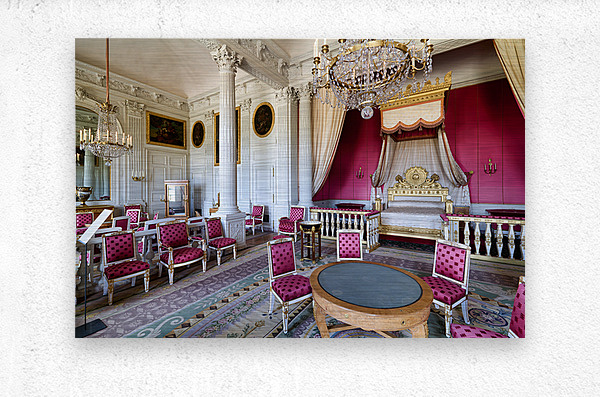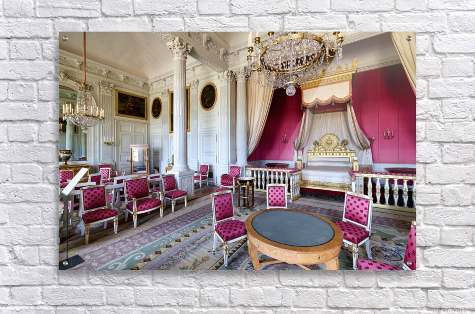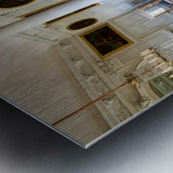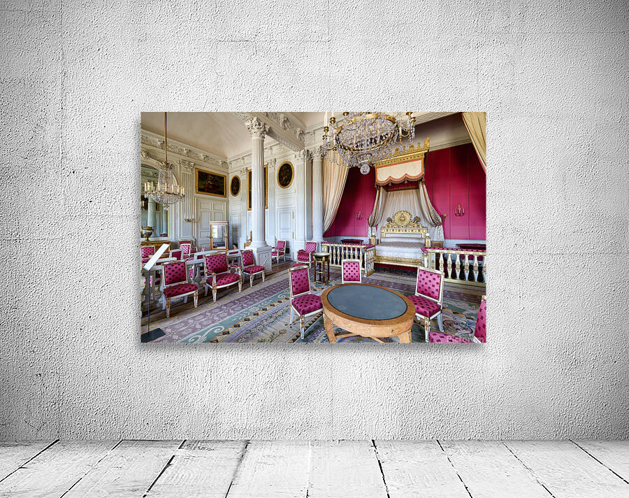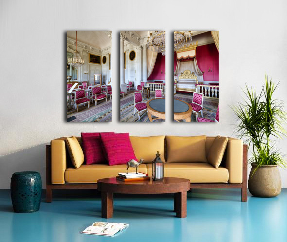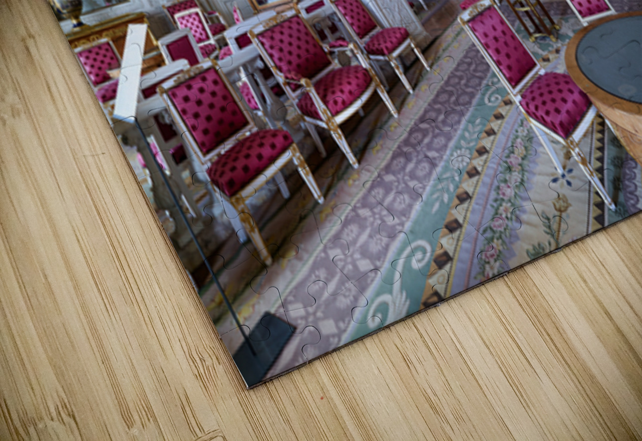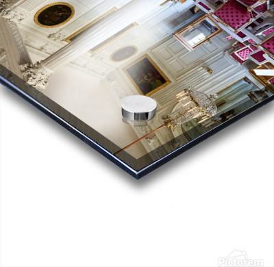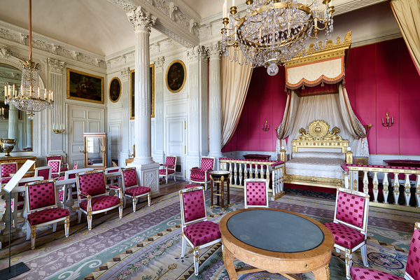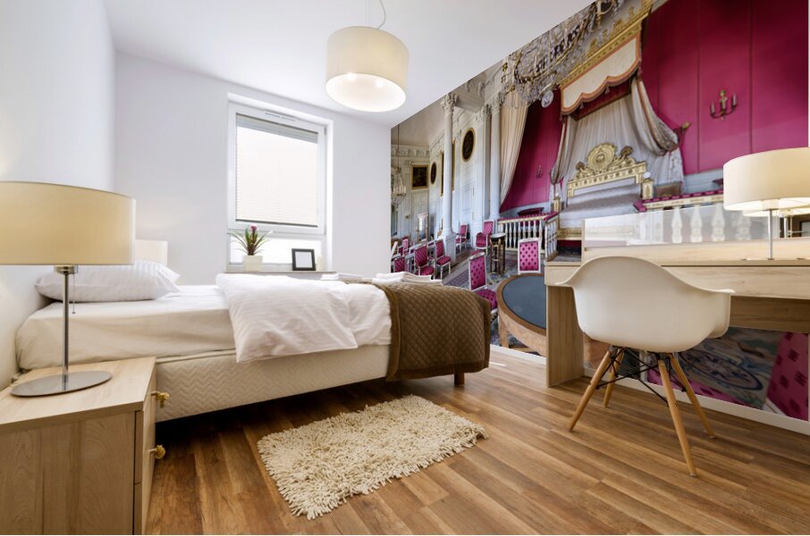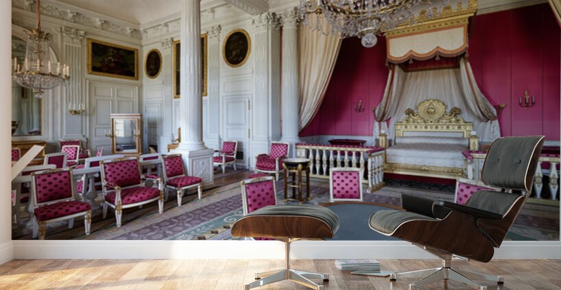 Visitors admire the interior of the Grand Trianon a historic building in the Palace of Versailles Paris during a guided tour.