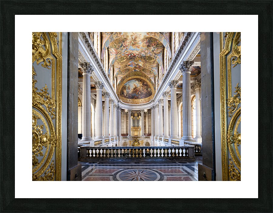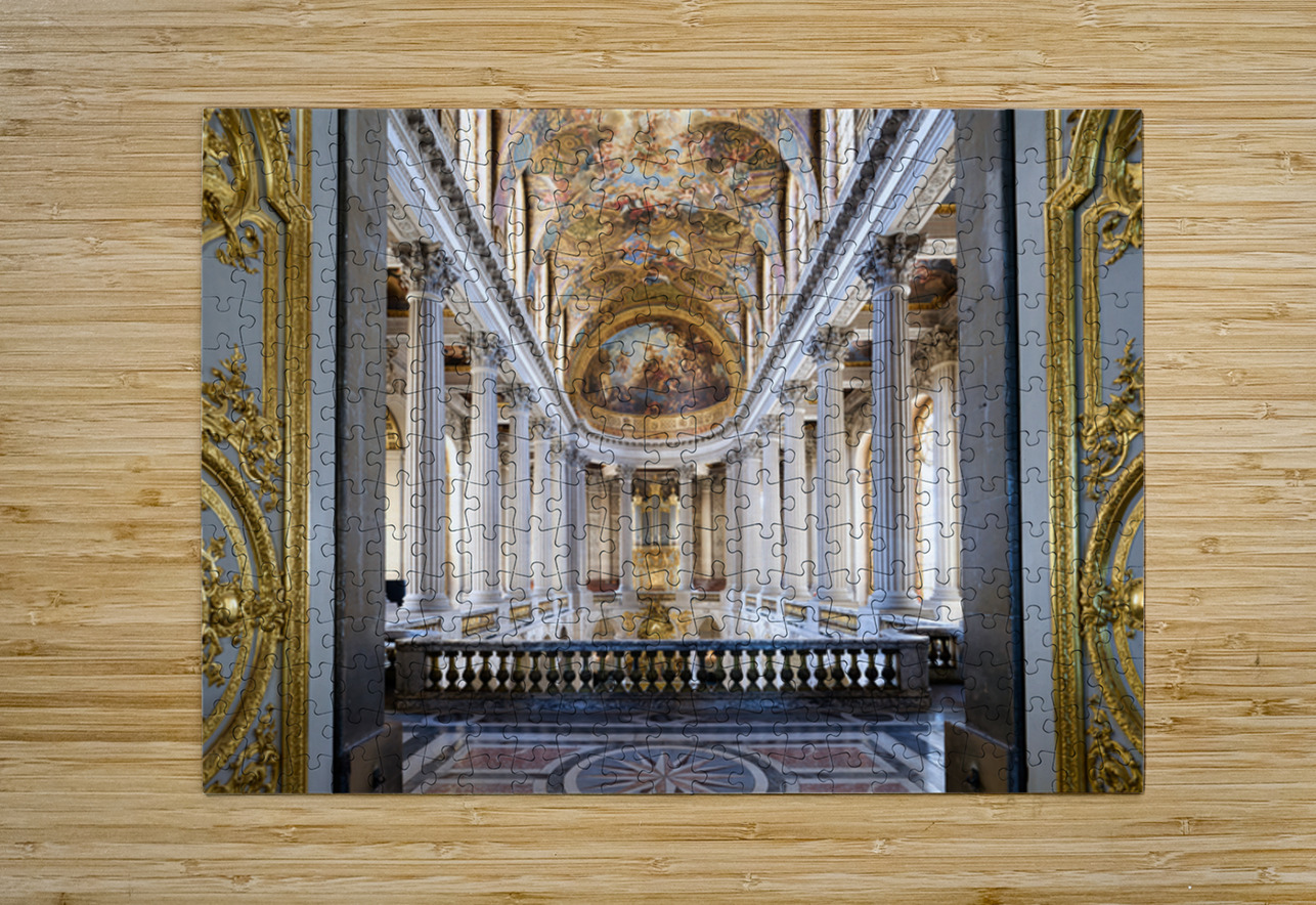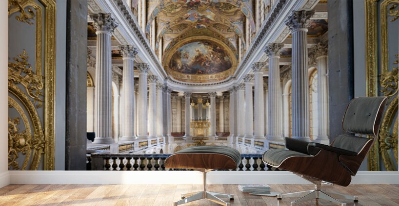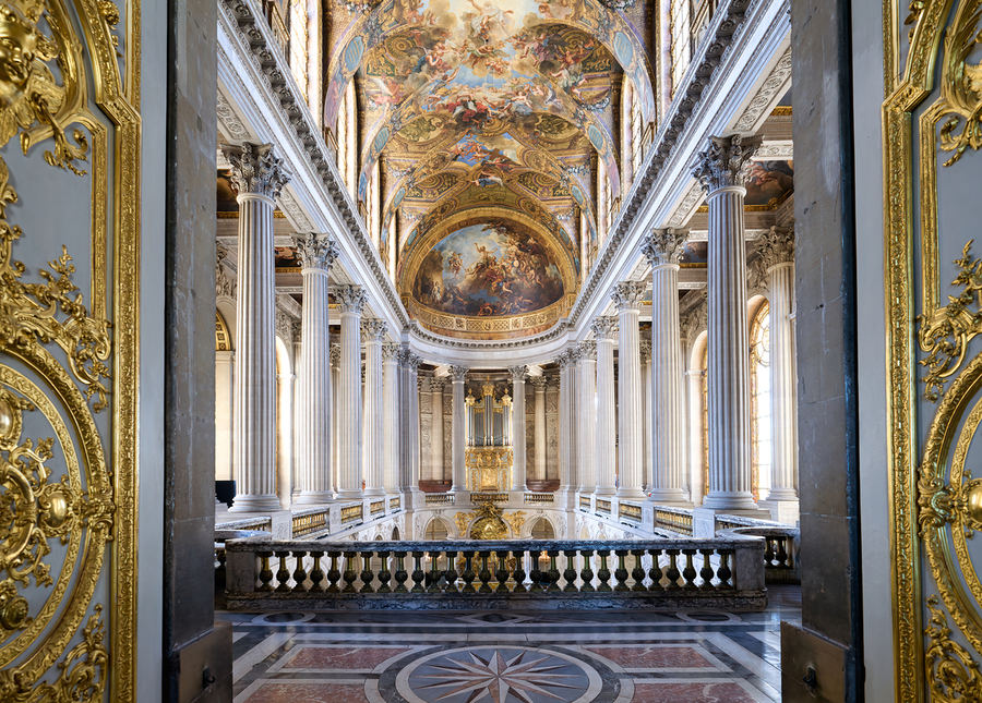 Tourists explore the Royal Chapel in the Palace of Versailles. The space features grand architecture and detailed artwork on the ceiling.