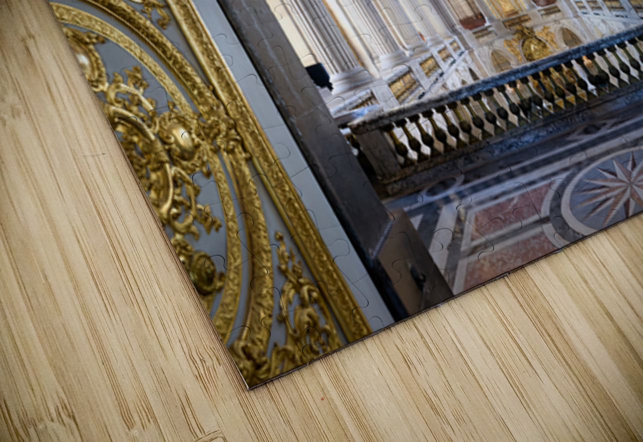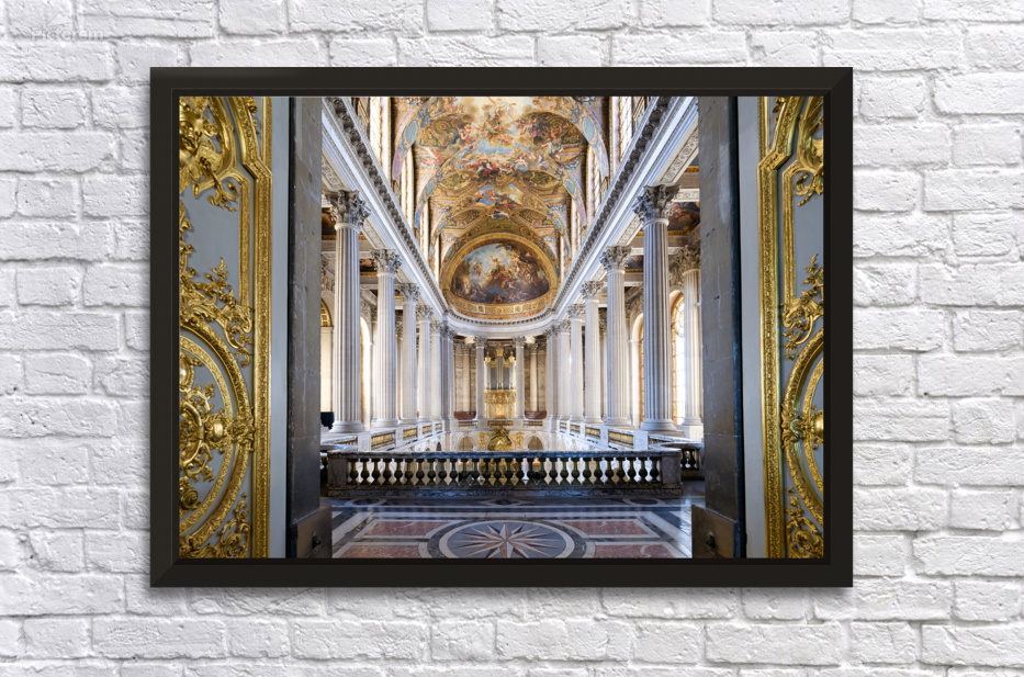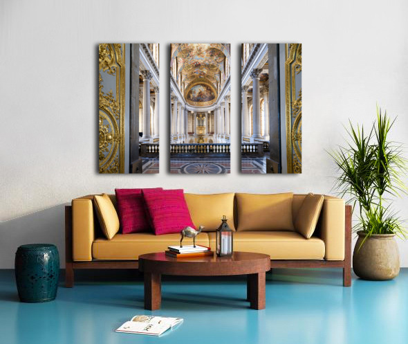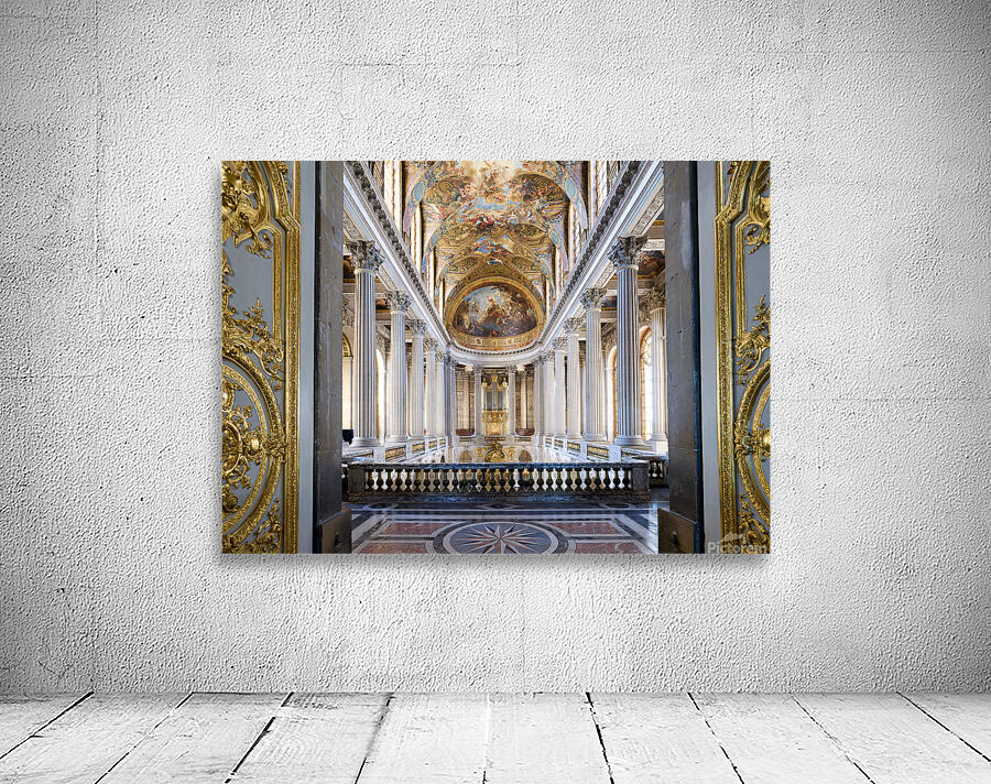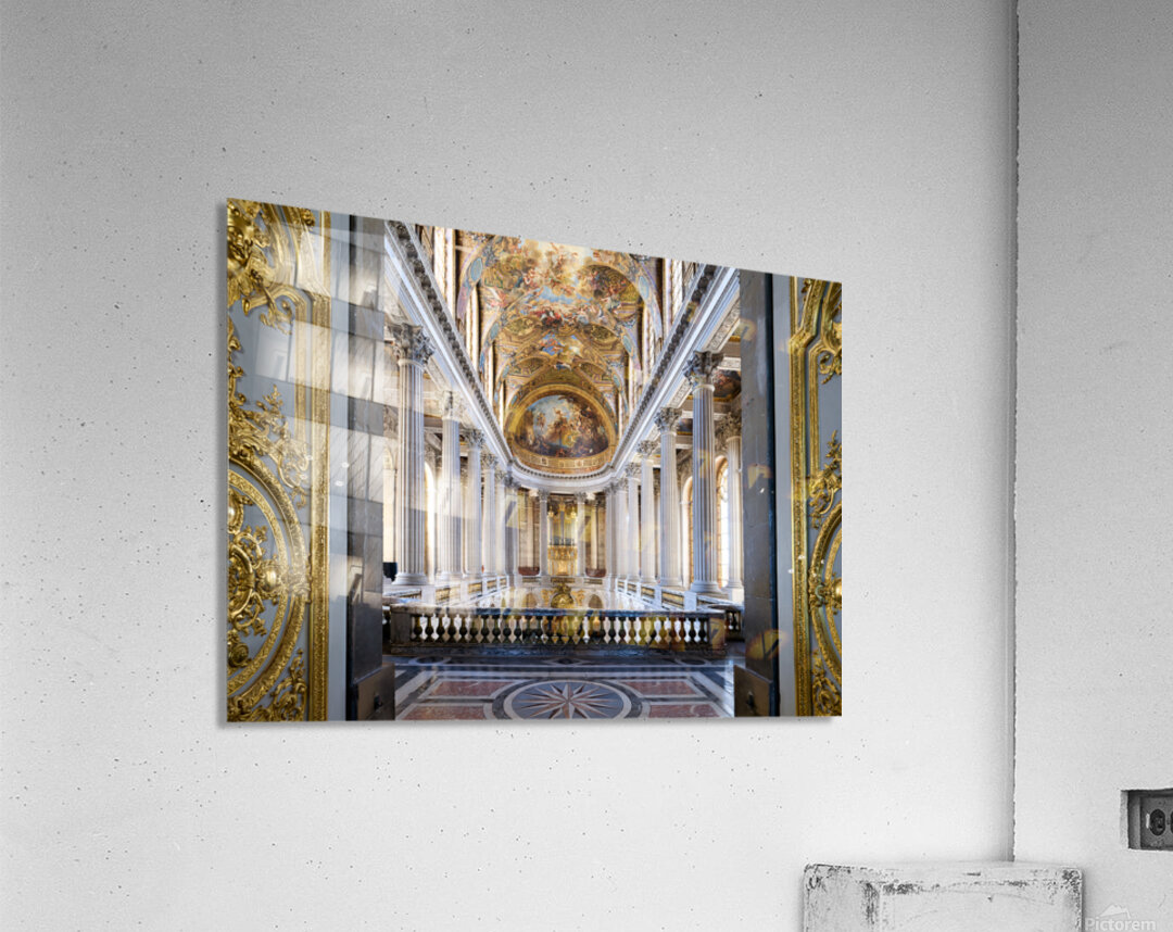 Tourists explore the Royal Chapel in the Palace of Versailles. The space features grand architecture and detailed artwork on the ceiling.