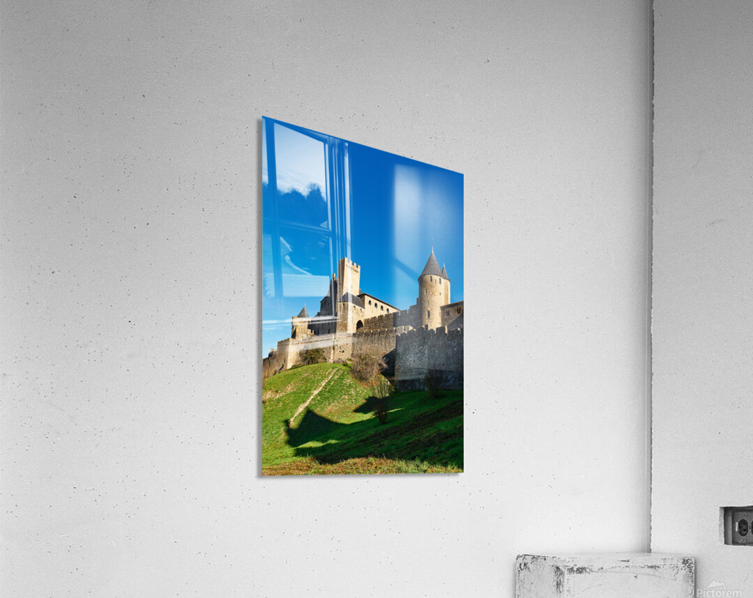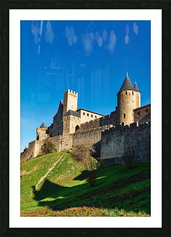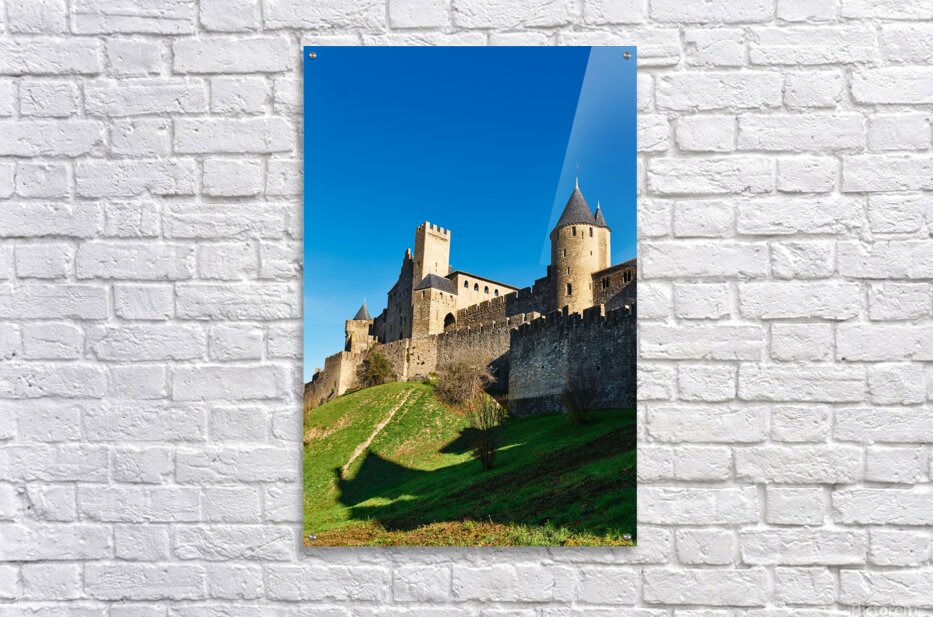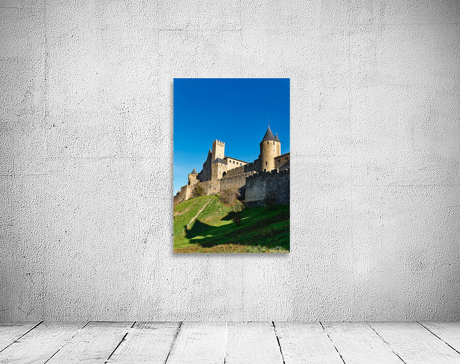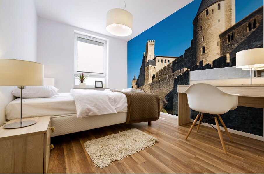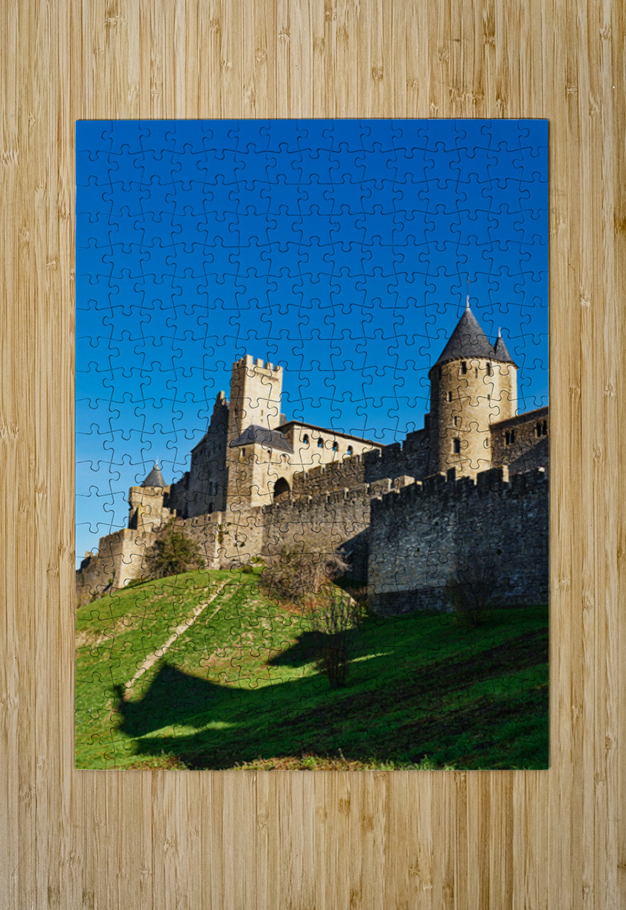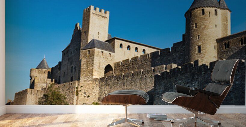 Tourists explore the ancient fortress of Carcassonne in France under clear blue skies while enjoying the views of the old stone walls.