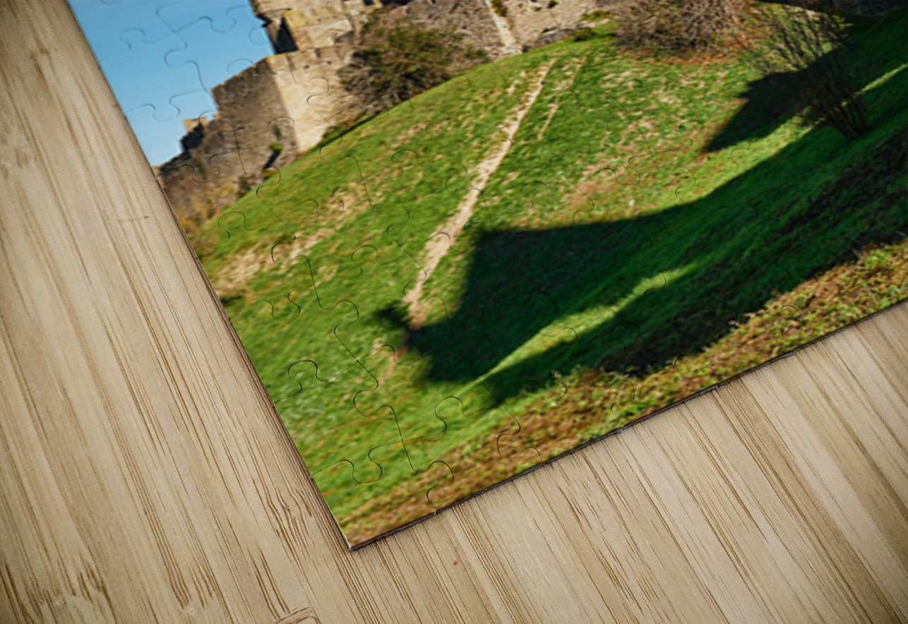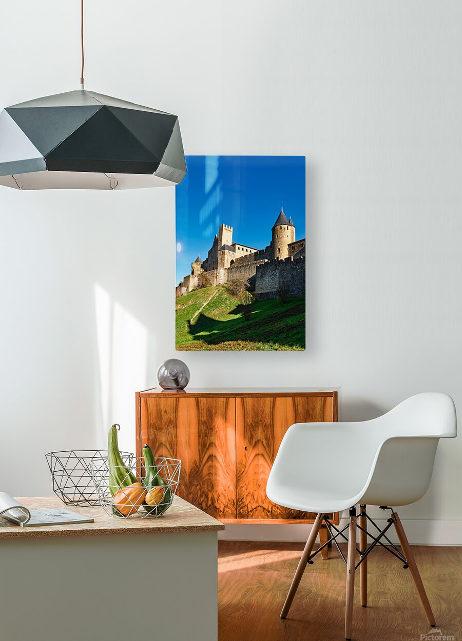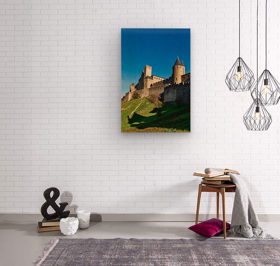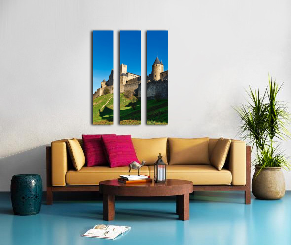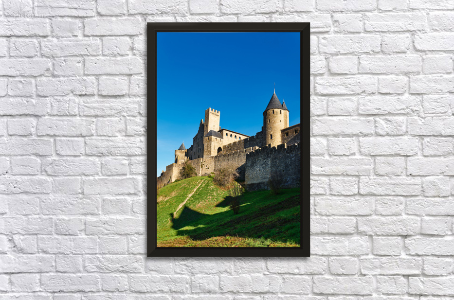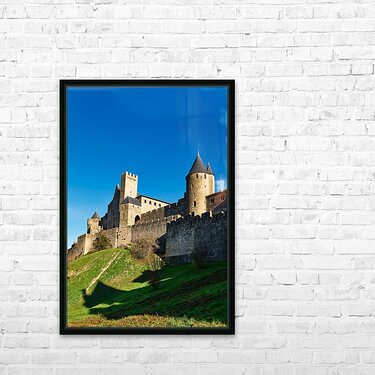 Tourists explore the ancient fortress of Carcassonne in France under clear blue skies while enjoying the views of the old stone walls.