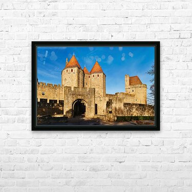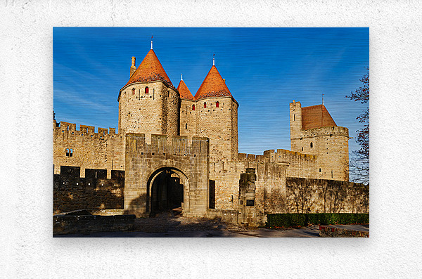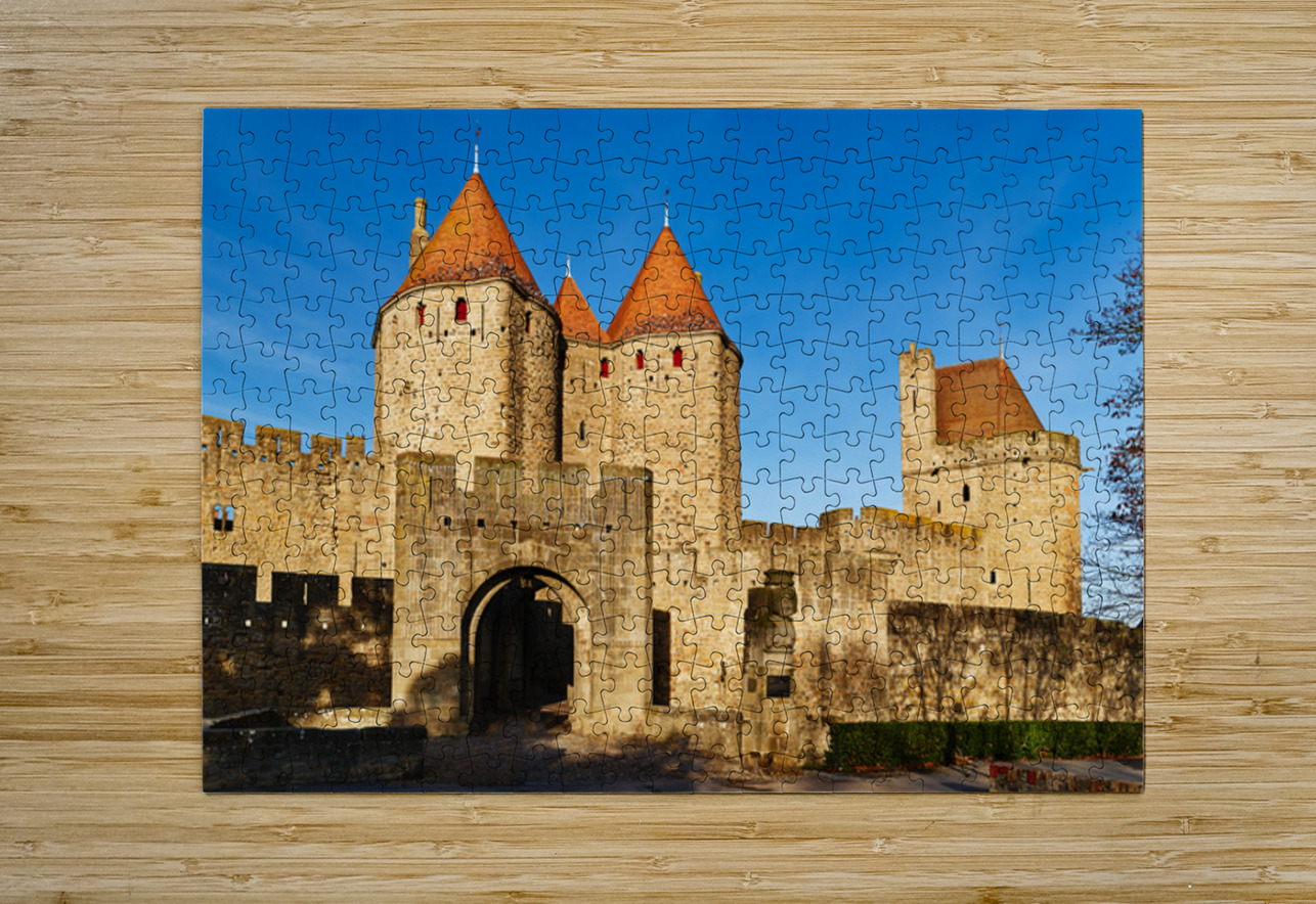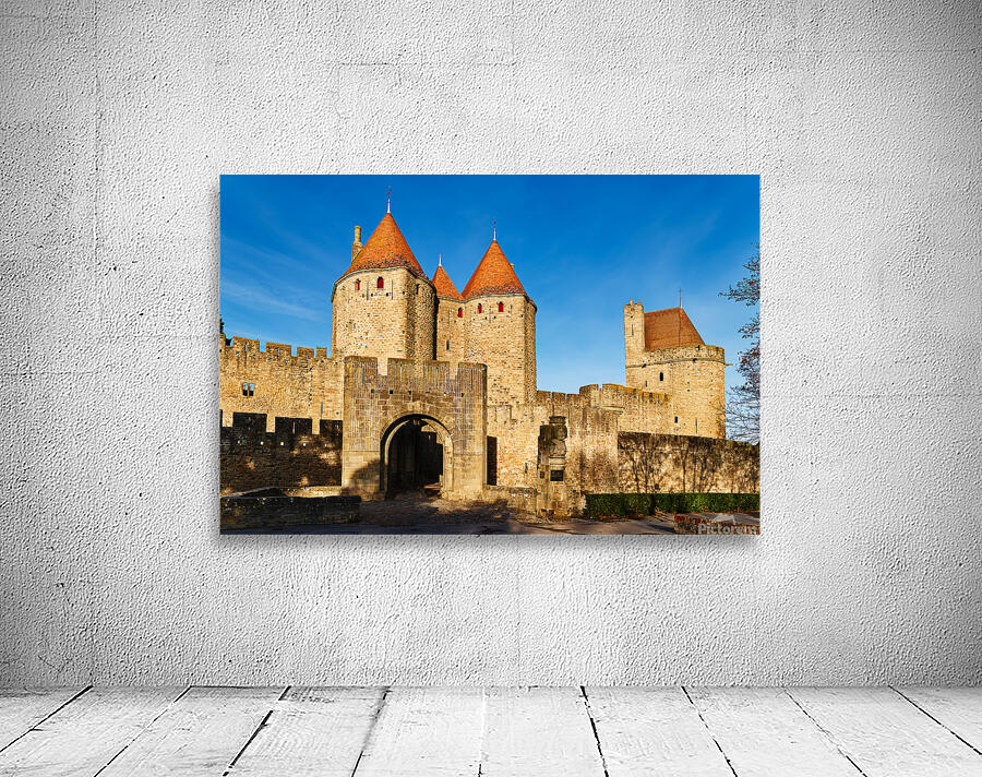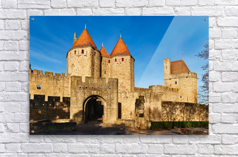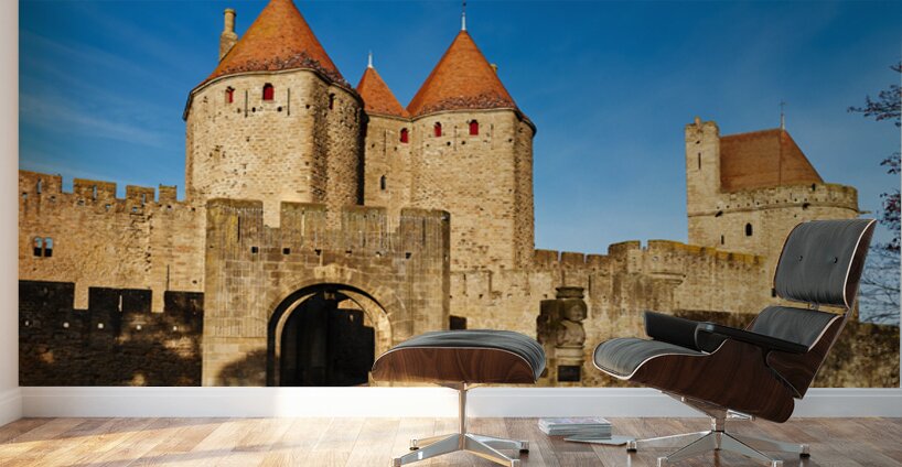 Tourists explore the ancient stone walls and towers of Carcassonne in France. The sun shines bright highlighting the craftsmanship of the structure.