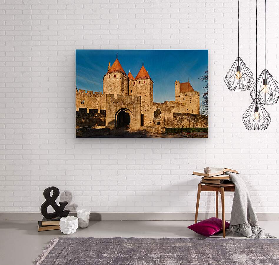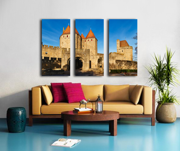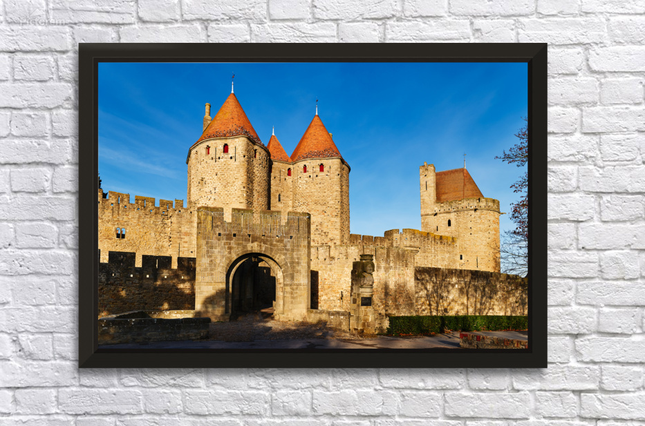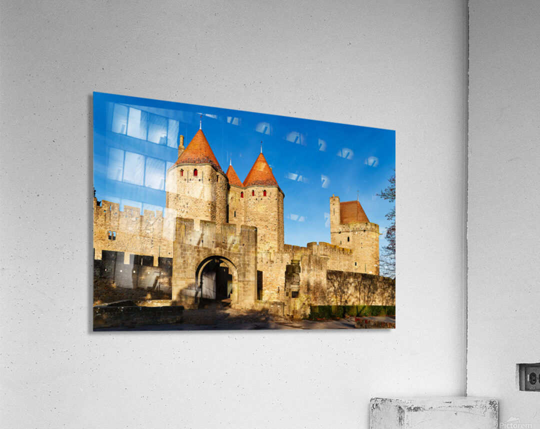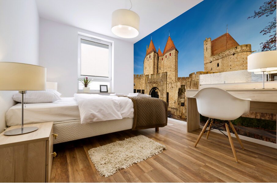 Tourists explore the ancient stone walls and towers of Carcassonne in France. The sun shines bright highlighting the craftsmanship of the structure.
