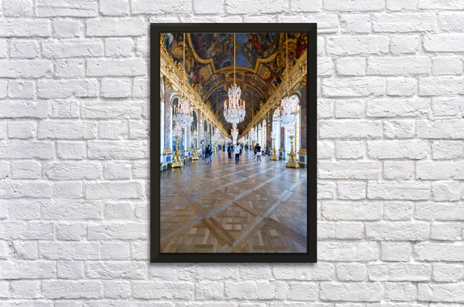 Crowds walk through the Hall of Mirrors looking at chandeliers and artwork. The grand space reflects the history of the Palace of Versailles.