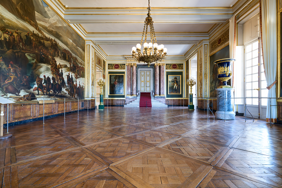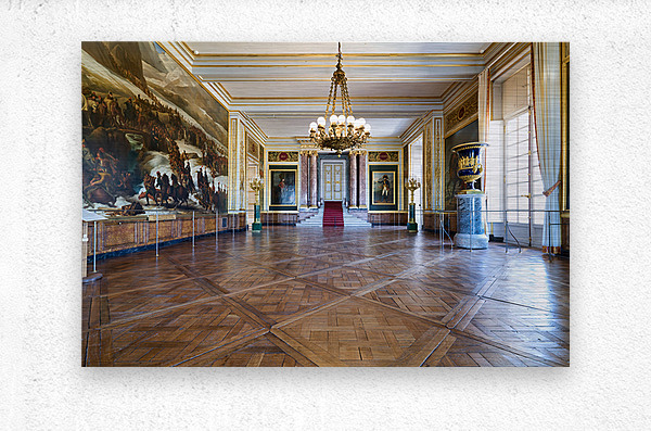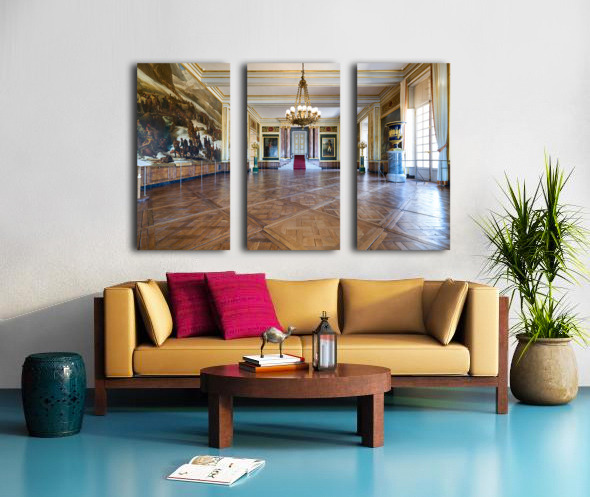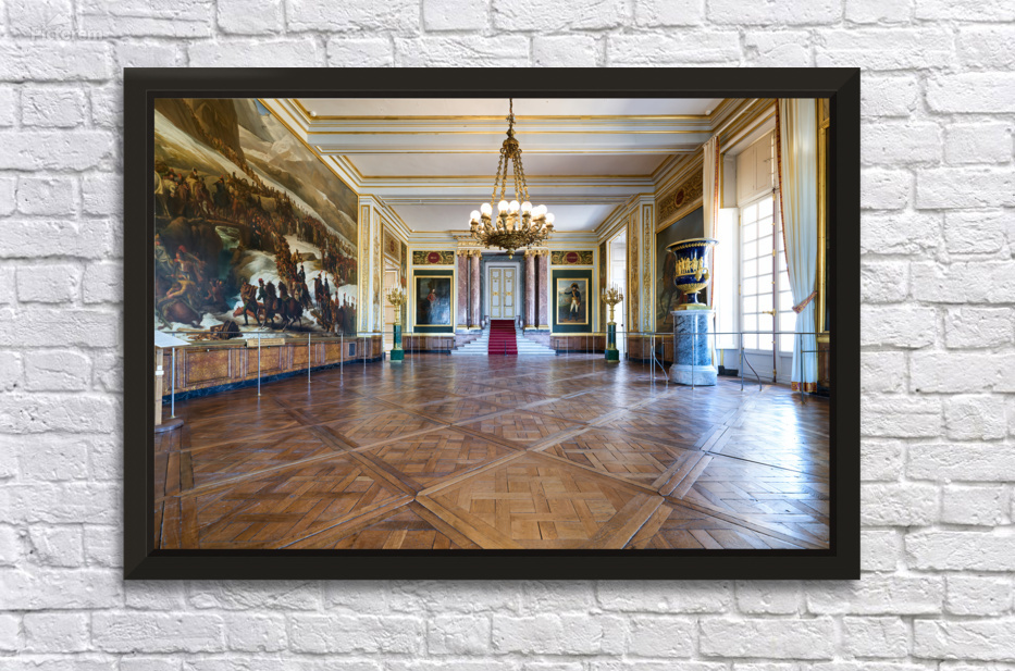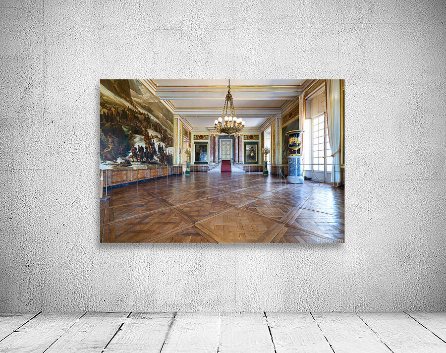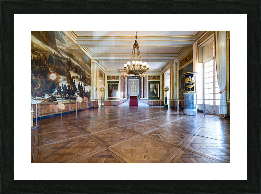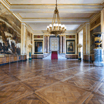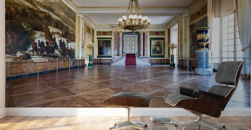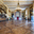 The room shows a large space with wooden floors and paintings on the walls. There are chandeliers and a grand staircase.