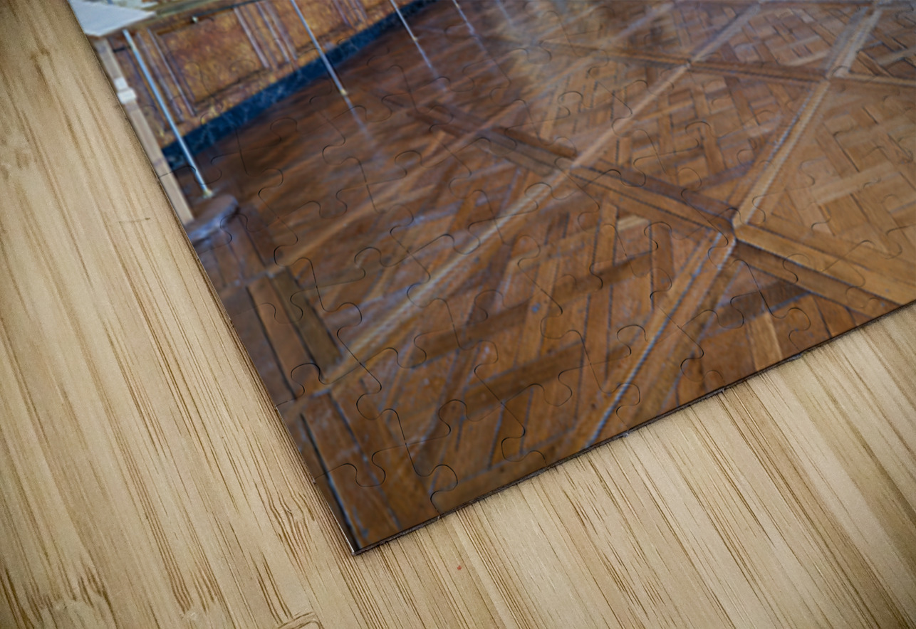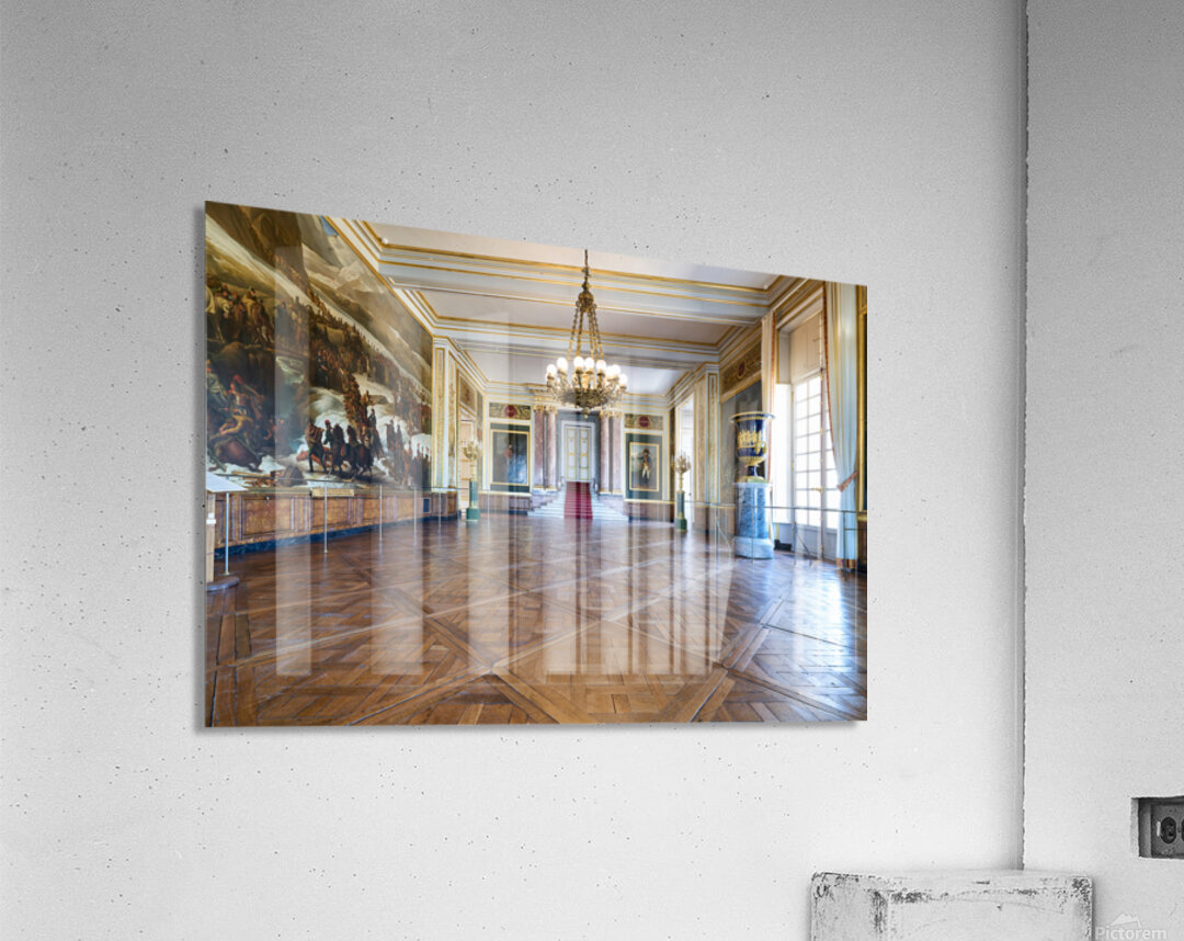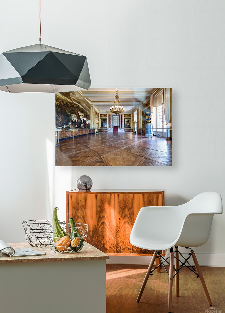 The room shows a large space with wooden floors and paintings on the walls. There are chandeliers and a grand staircase.