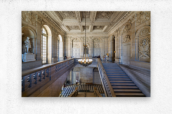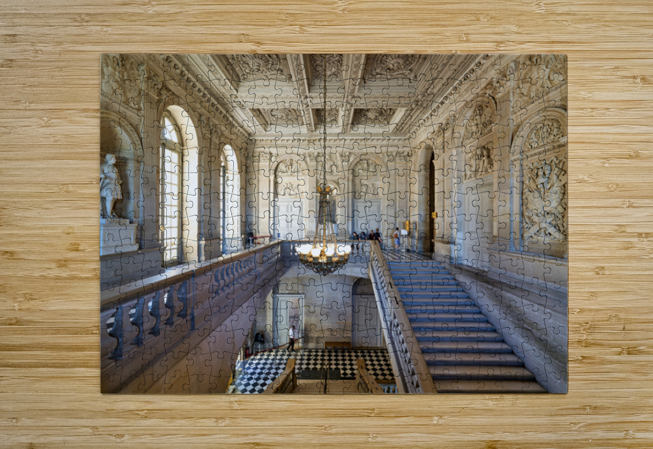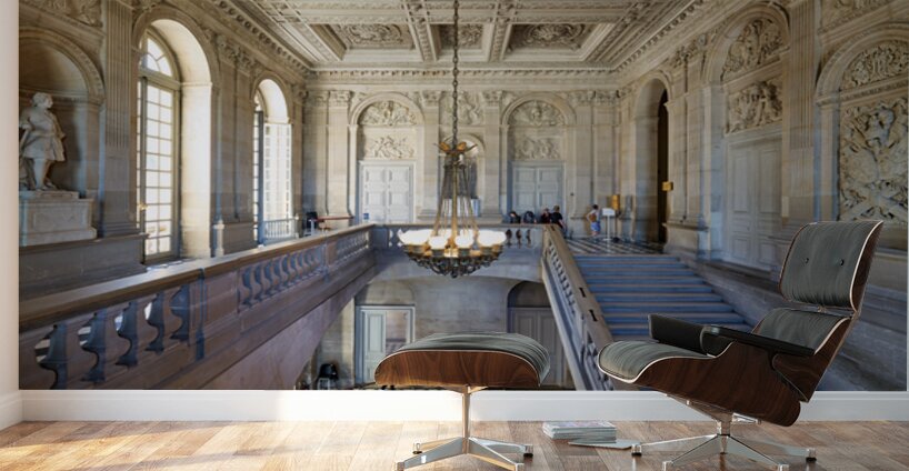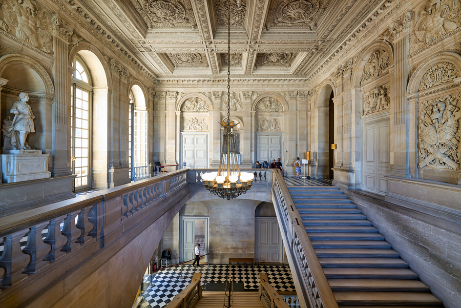 People walk through the grand staircase area of the Palace of Versailles. Elaborate decorations and high ceilings are visible throughout.