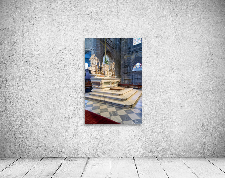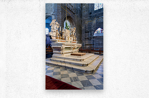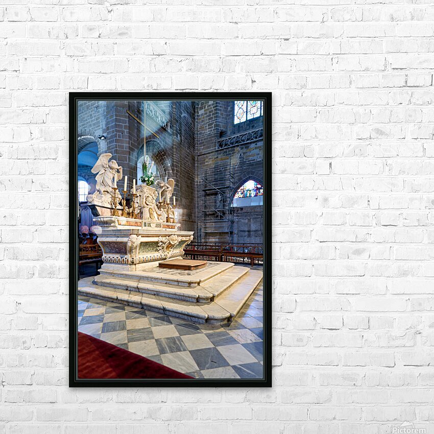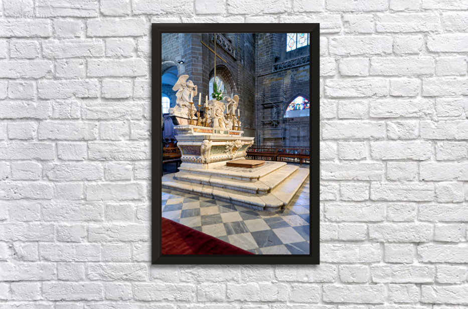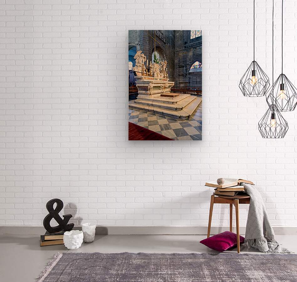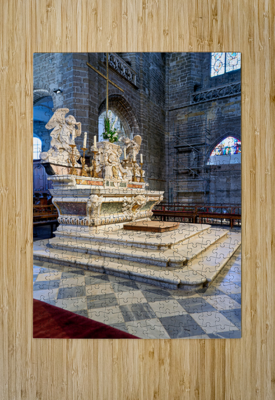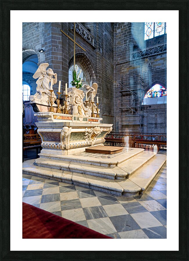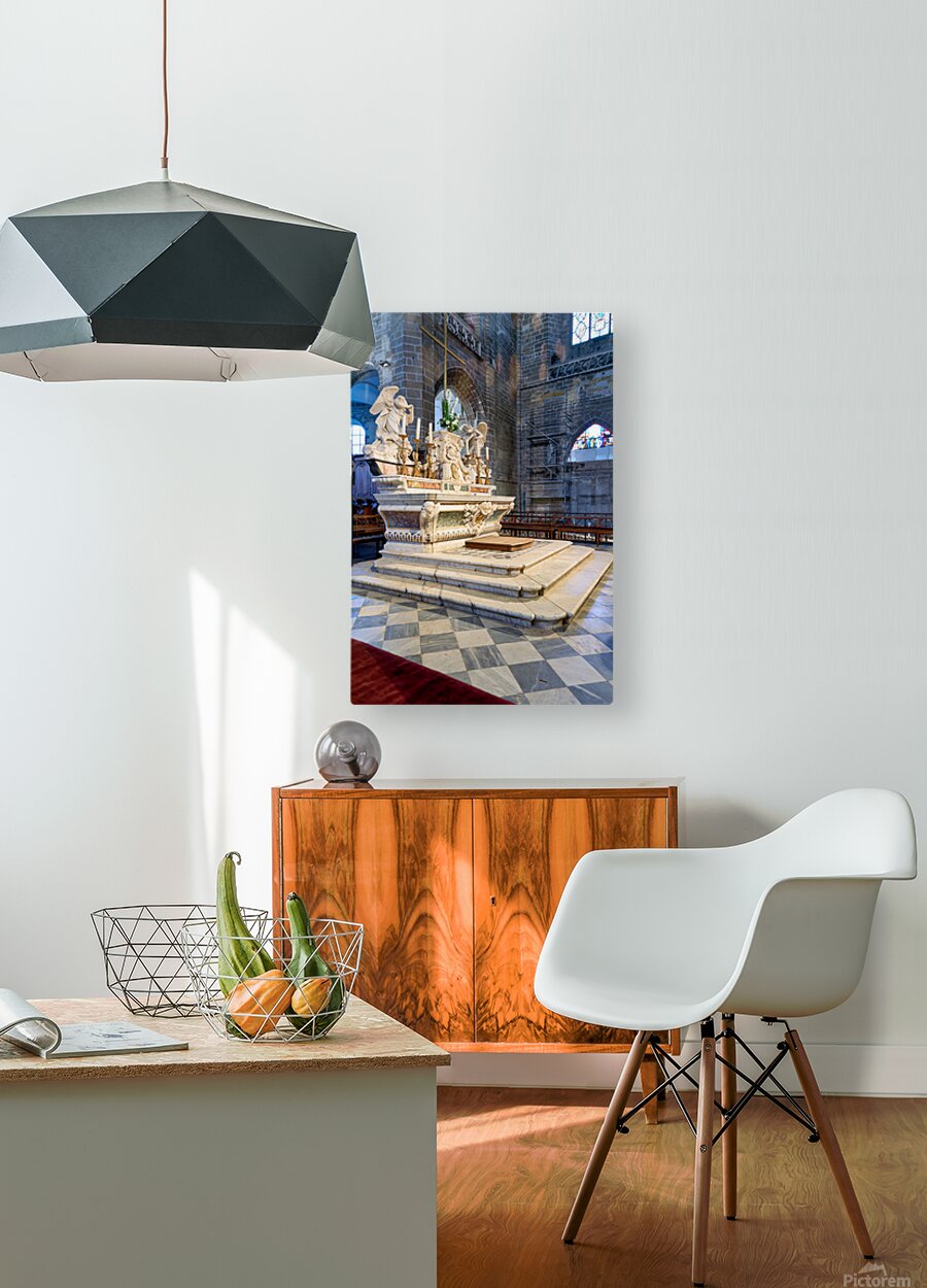 The altar in Saint Pierre Cathedral features ornate designs. The light shines through the stained glass windows highlighting the details.