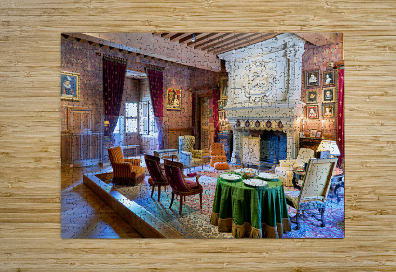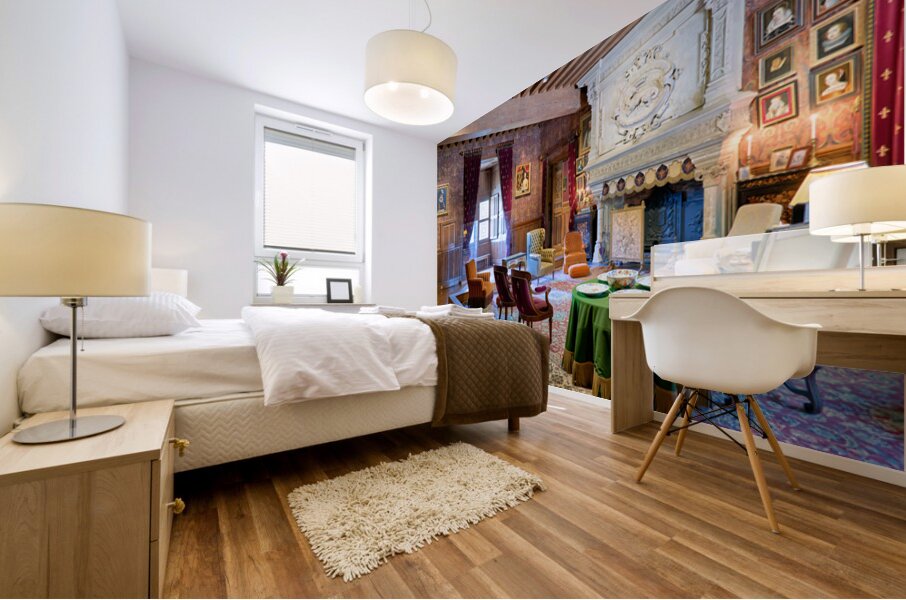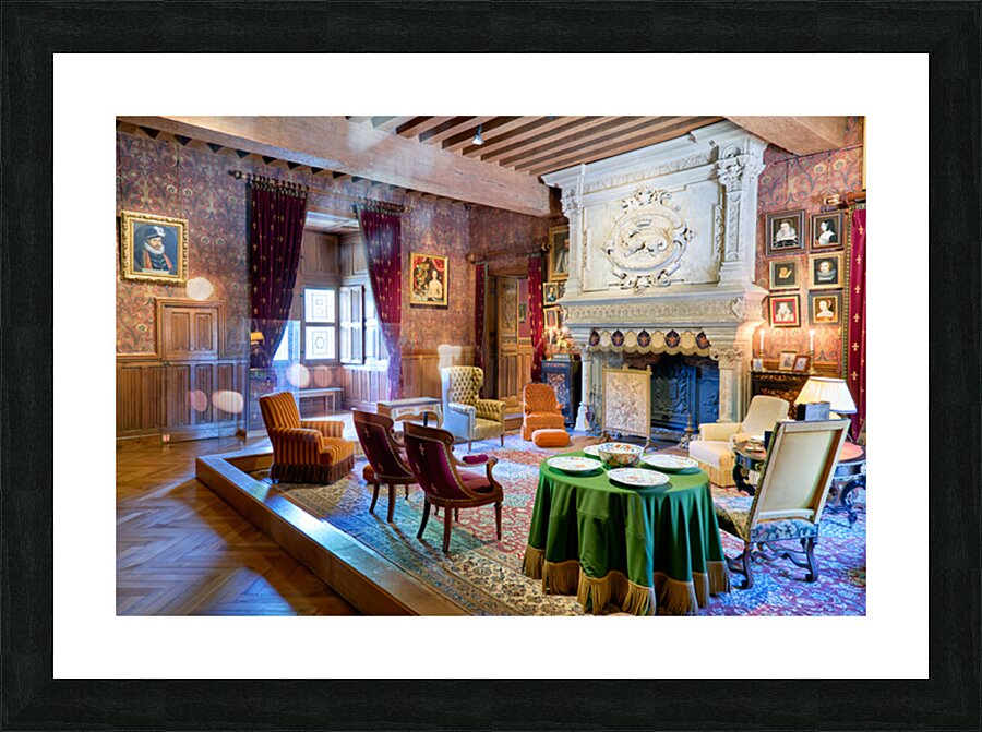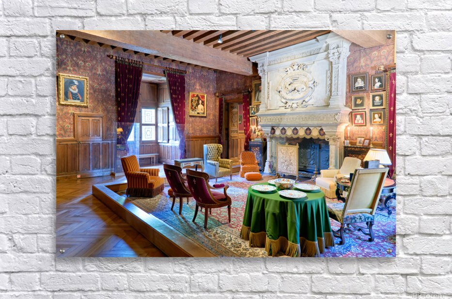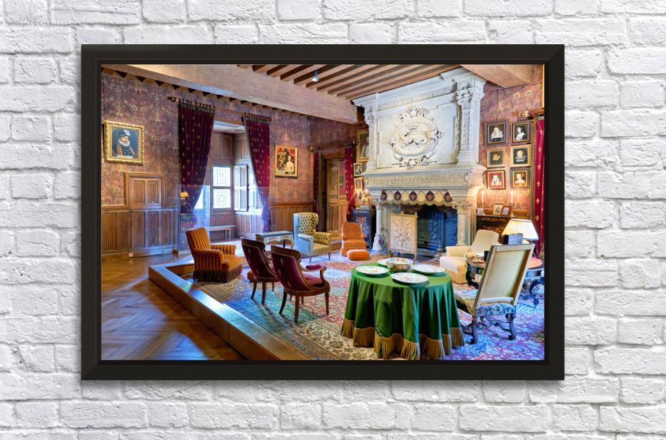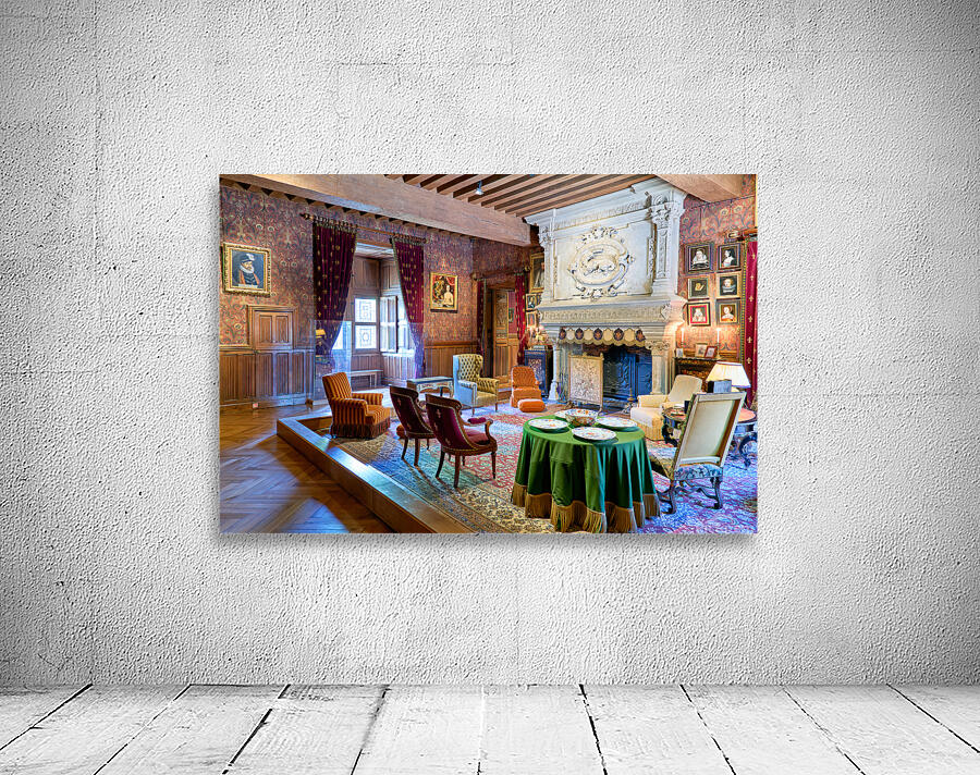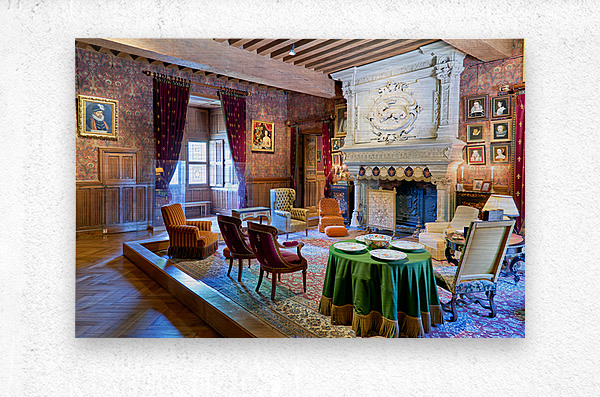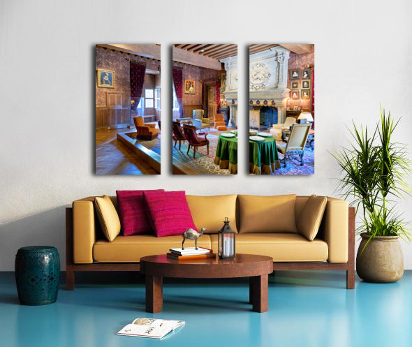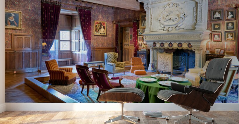 Visitors explore the interior of Chateau dAzay le Rideau in the Loire Valley. The room shows unique decorations and historic furniture.