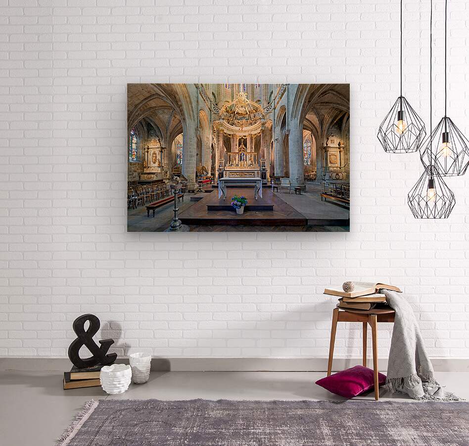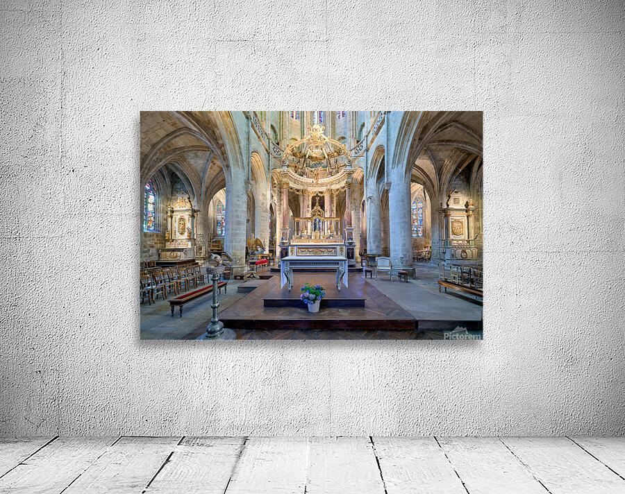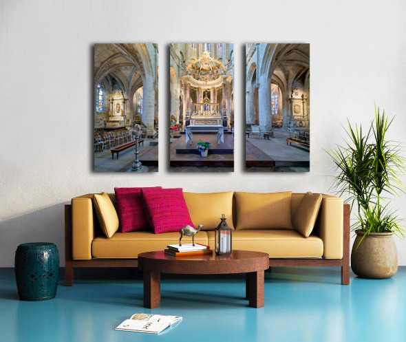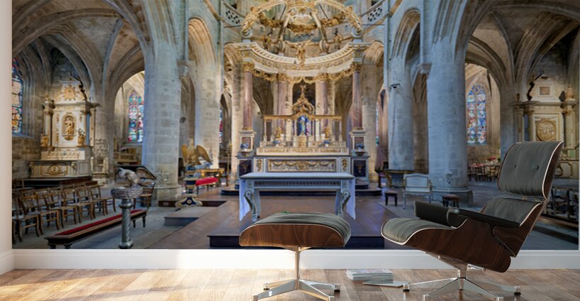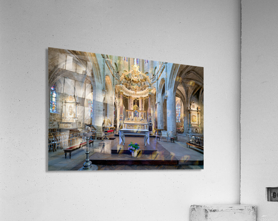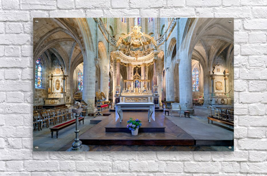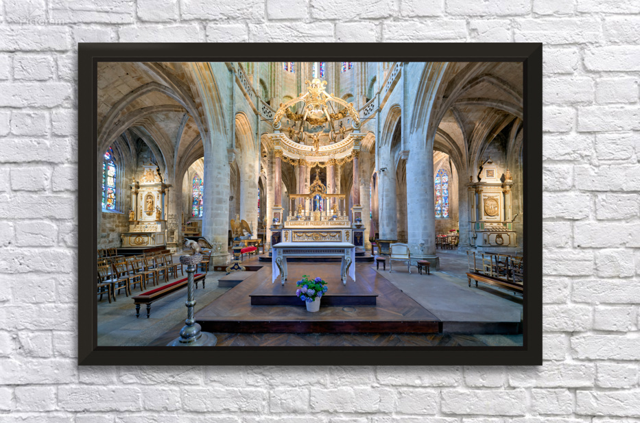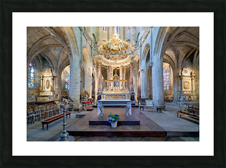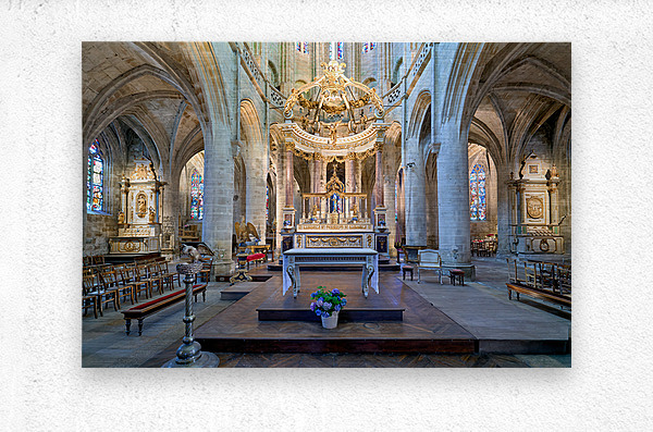 Visitors see the altar and architecture inside the Basilica of St Saviour in Dinan France during daylight hours. The church features tall arches.
