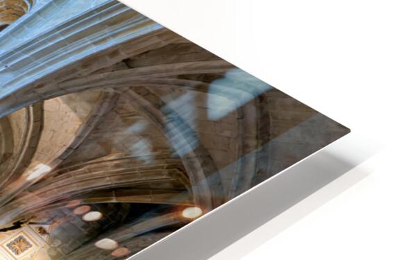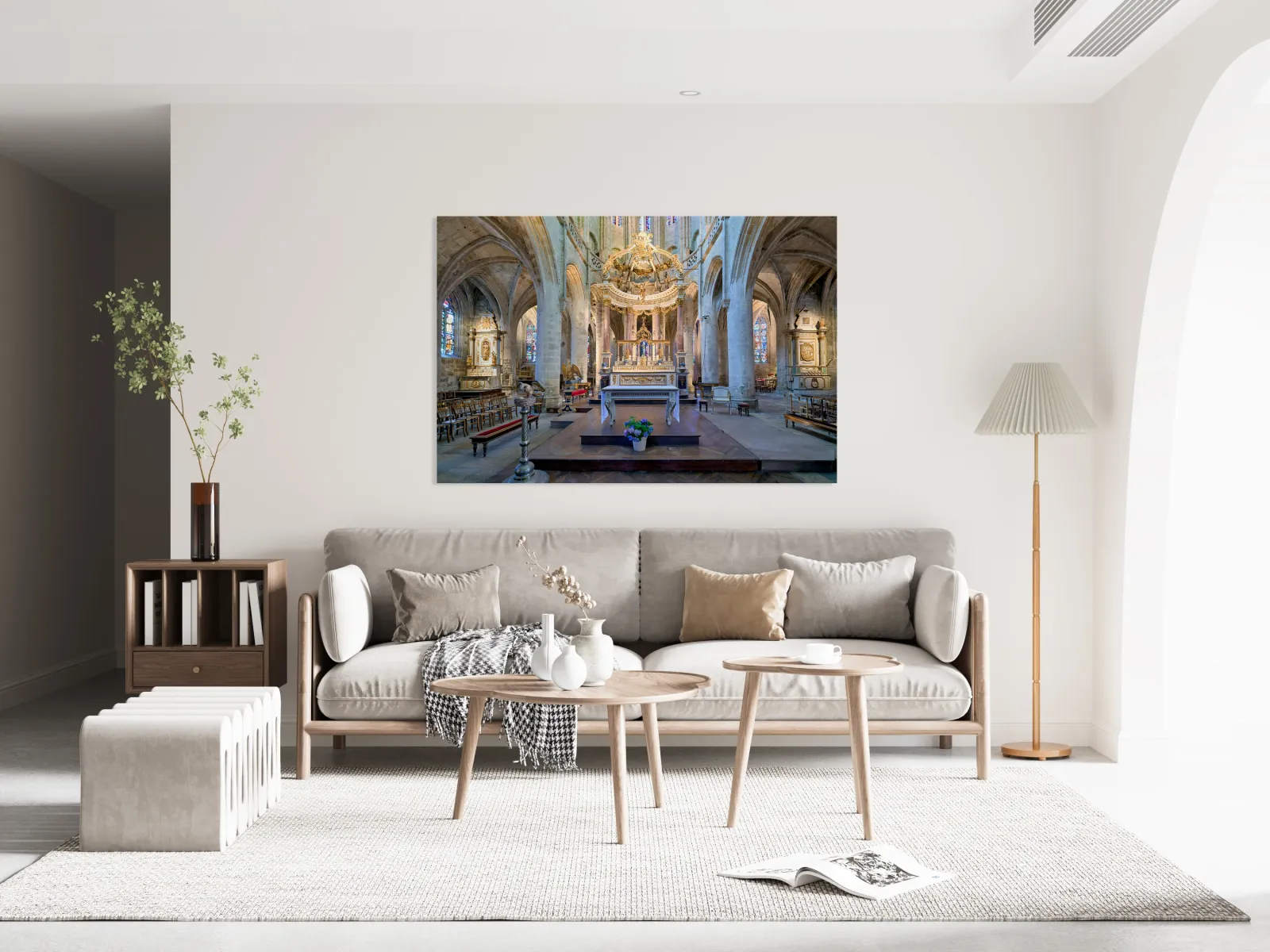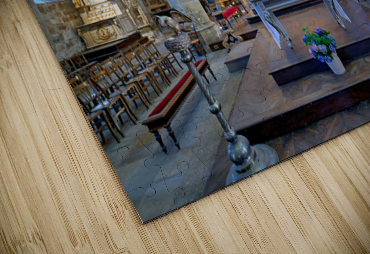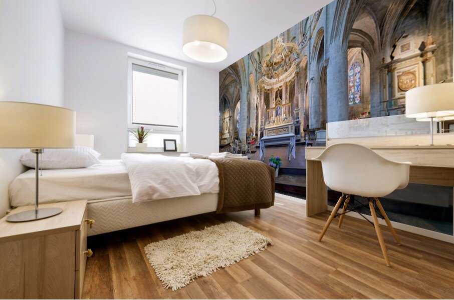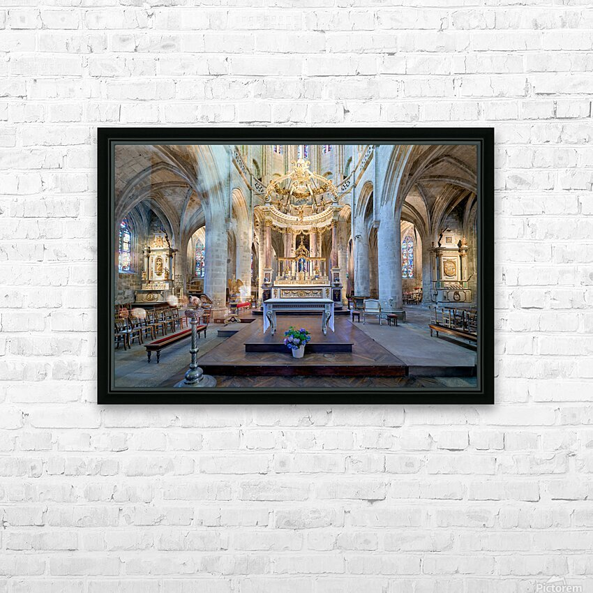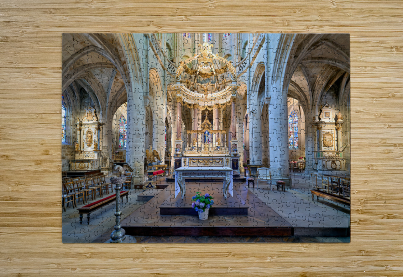 Visitors see the altar and architecture inside the Basilica of St Saviour in Dinan France during daylight hours. The church features tall arches.
