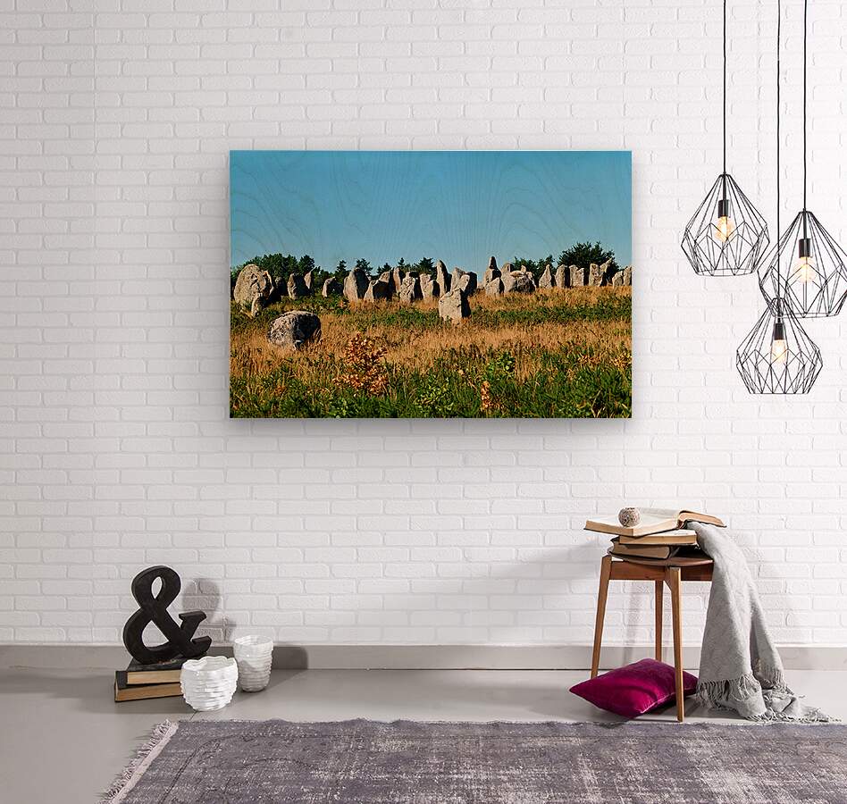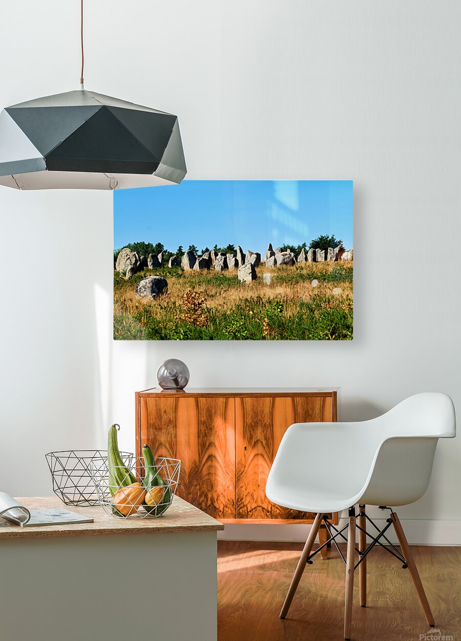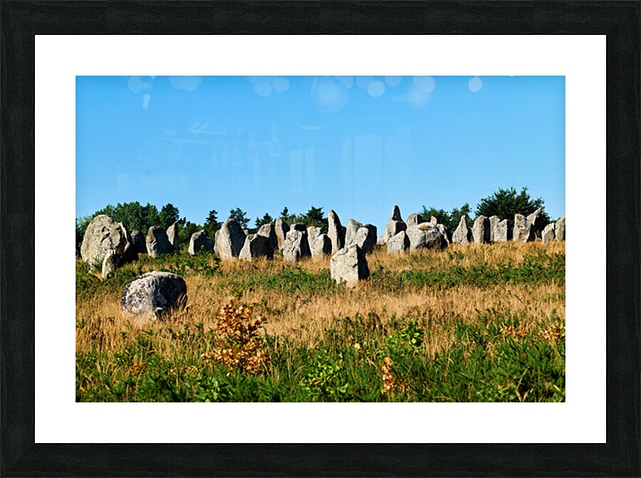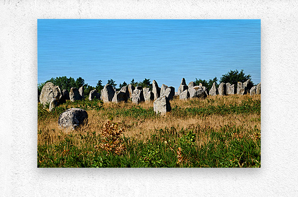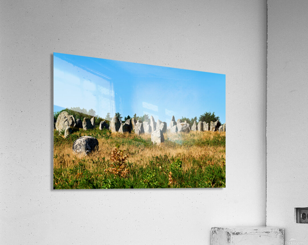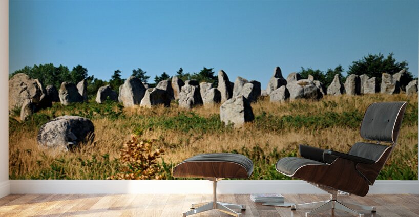 The neolithic menhir standing stones are located in Carnac Brittany France surrounded by grass and trees under a clear sky.