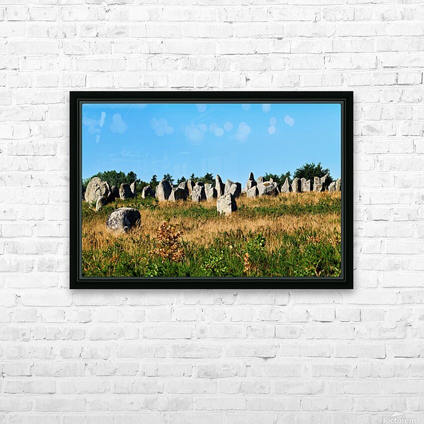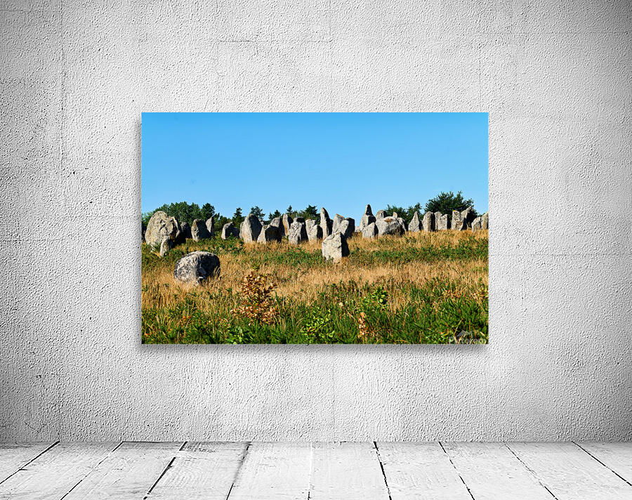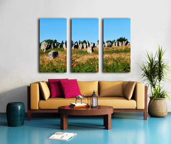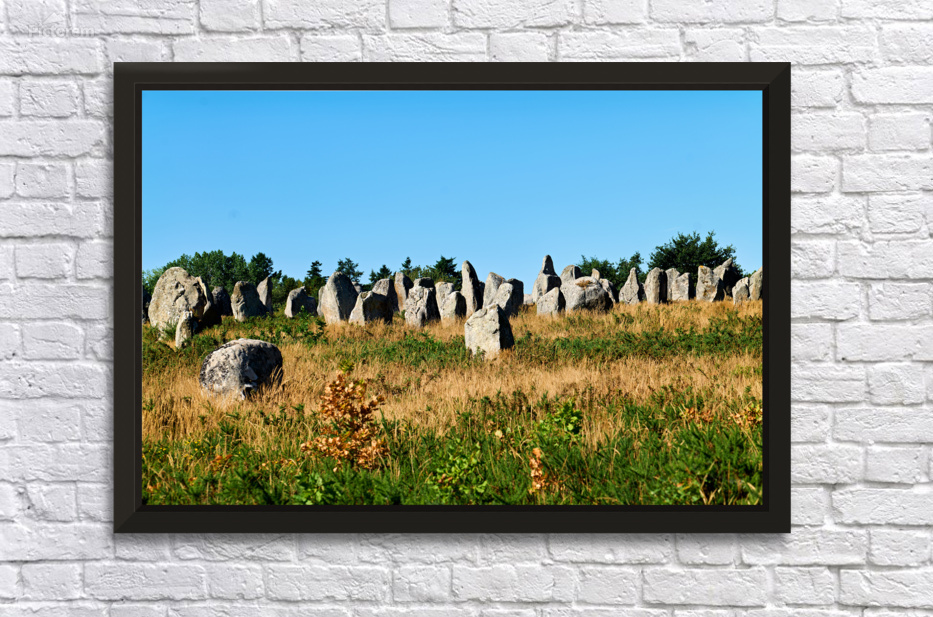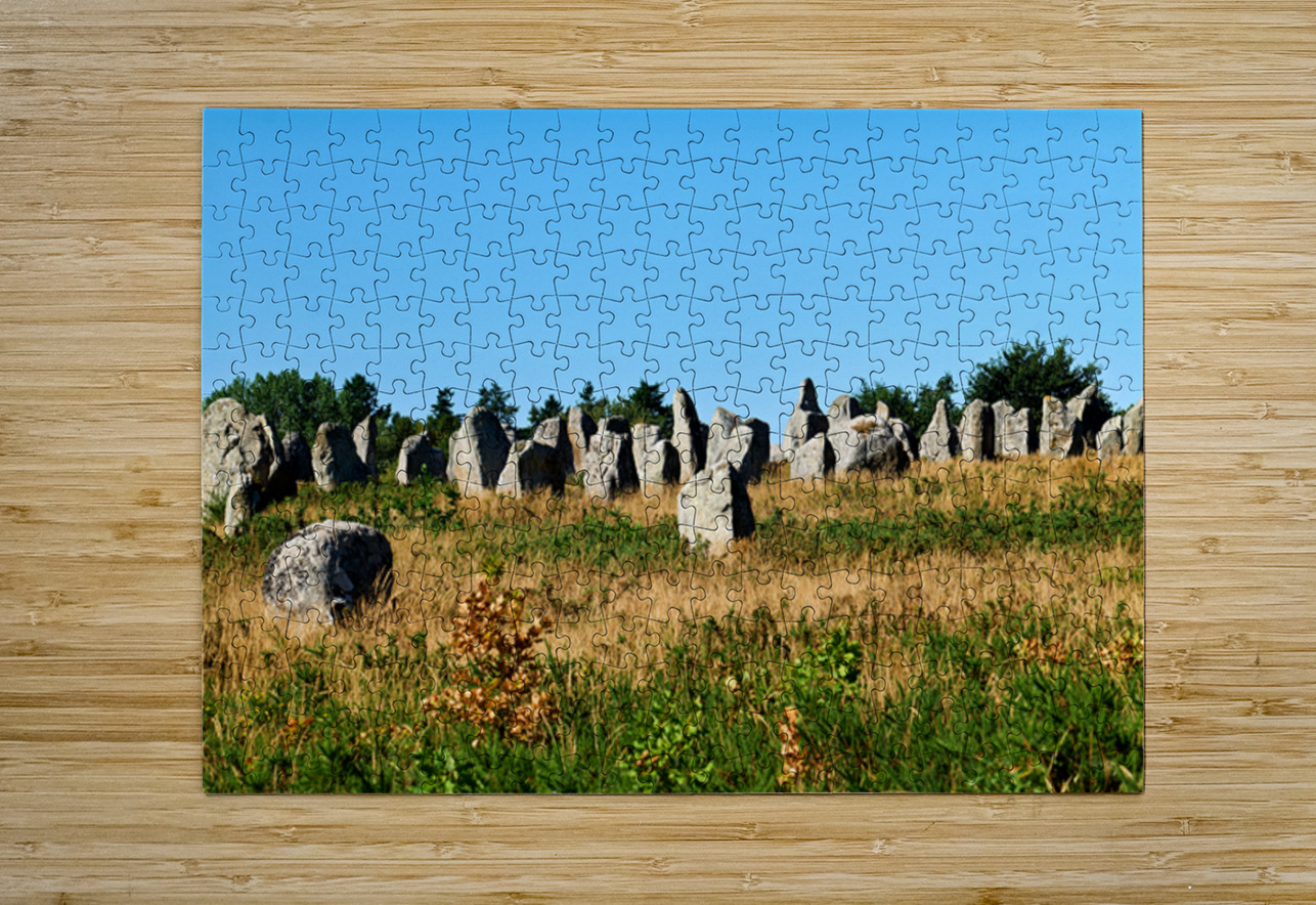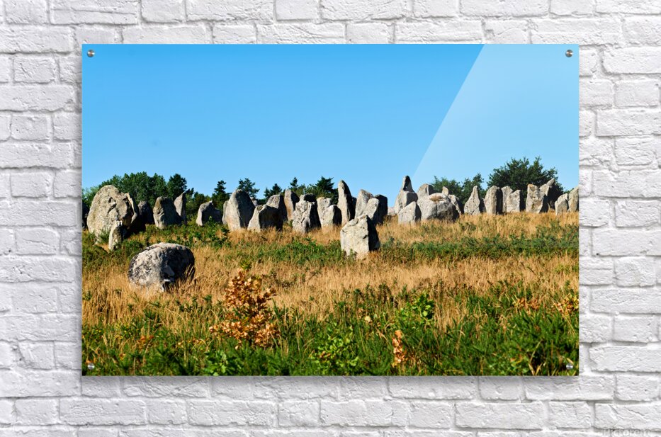 The neolithic menhir standing stones are located in Carnac Brittany France surrounded by grass and trees under a clear sky.