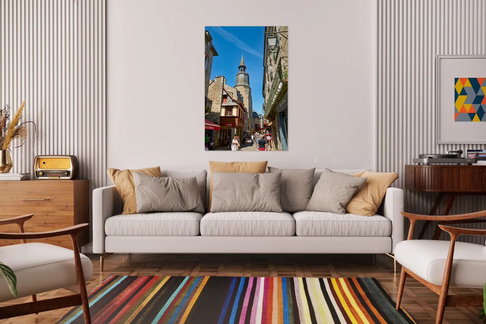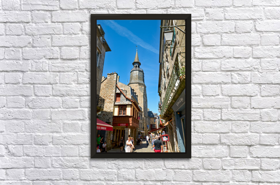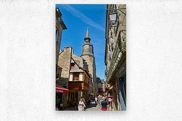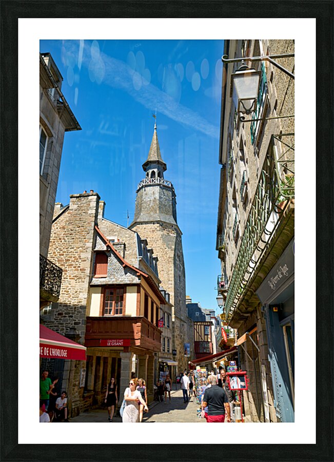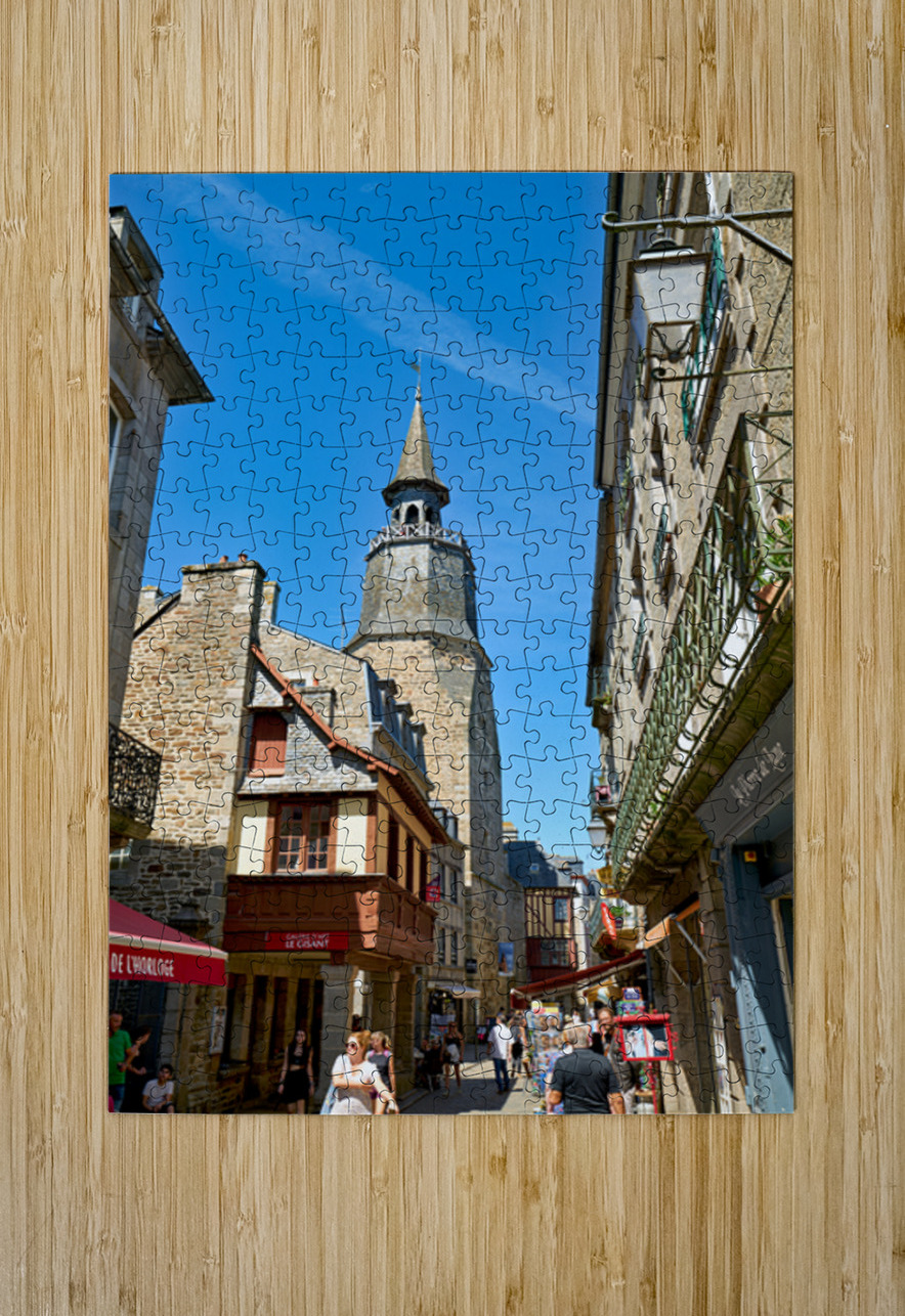 People walk along the narrow street in Dinan Brittany with the clock tower in view under a clear blue sky.