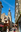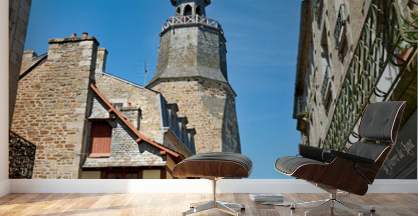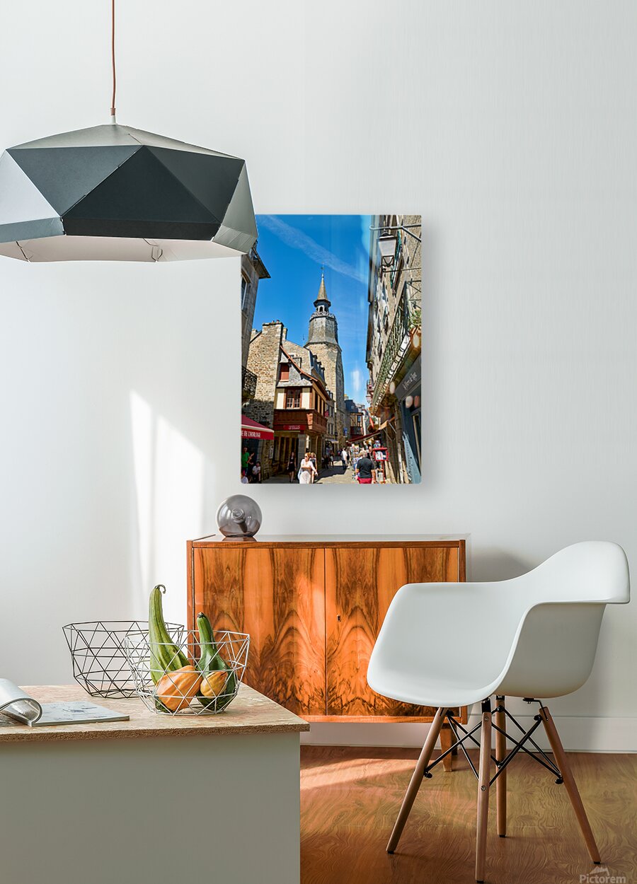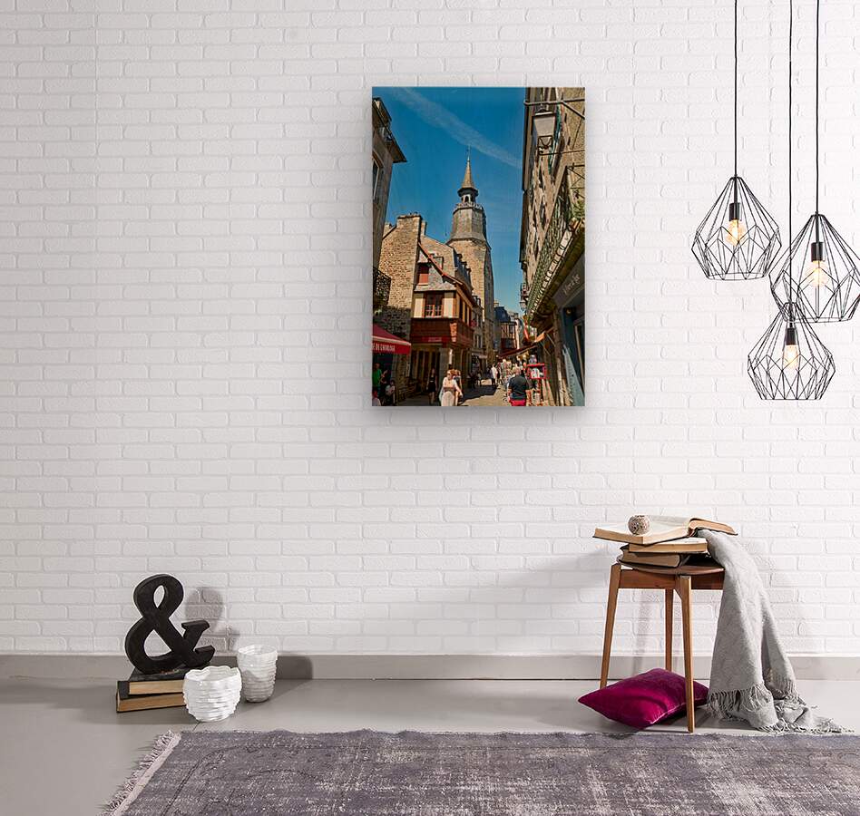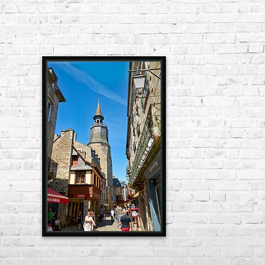 People walk along the narrow street in Dinan Brittany with the clock tower in view under a clear blue sky.