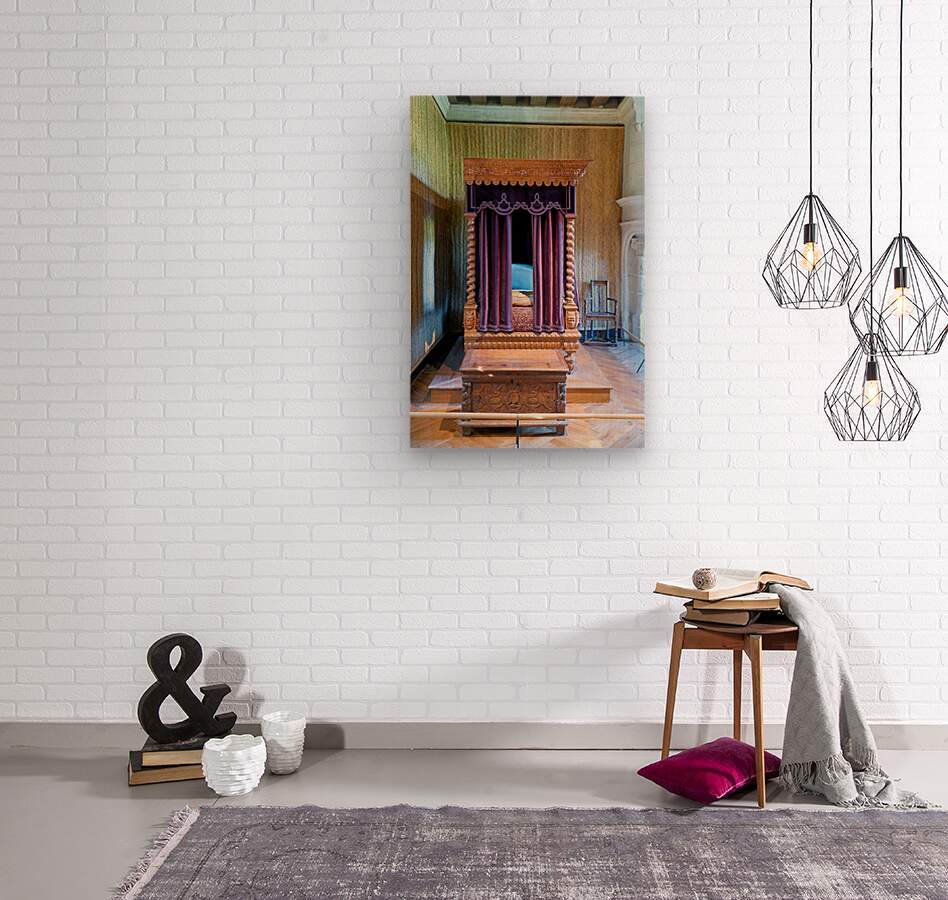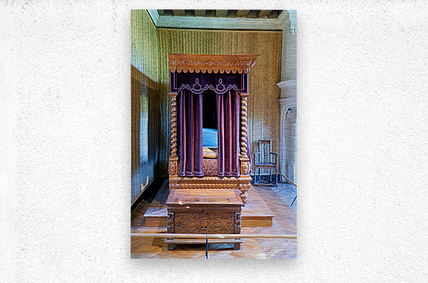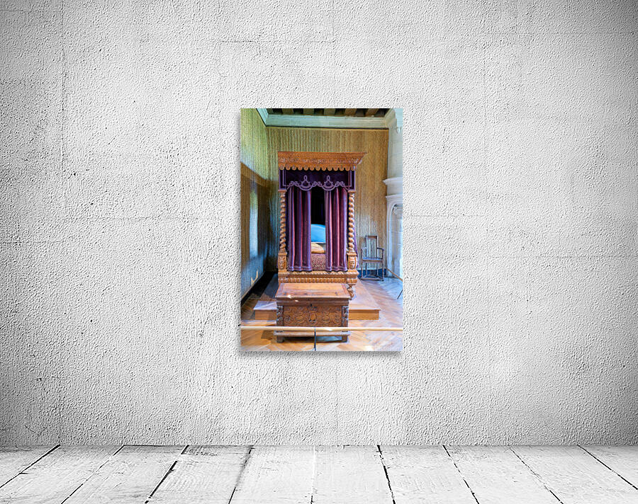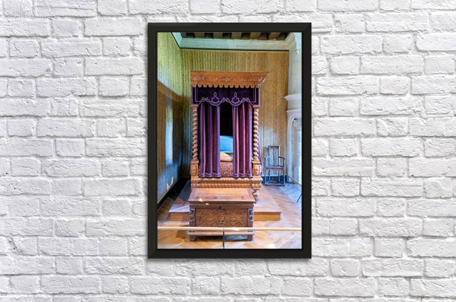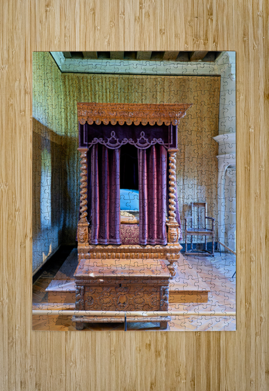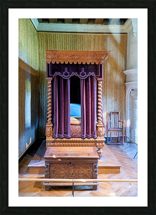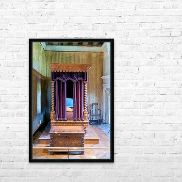 A wooden bed with curtains stands in the Chateau dAzay le Rideau.