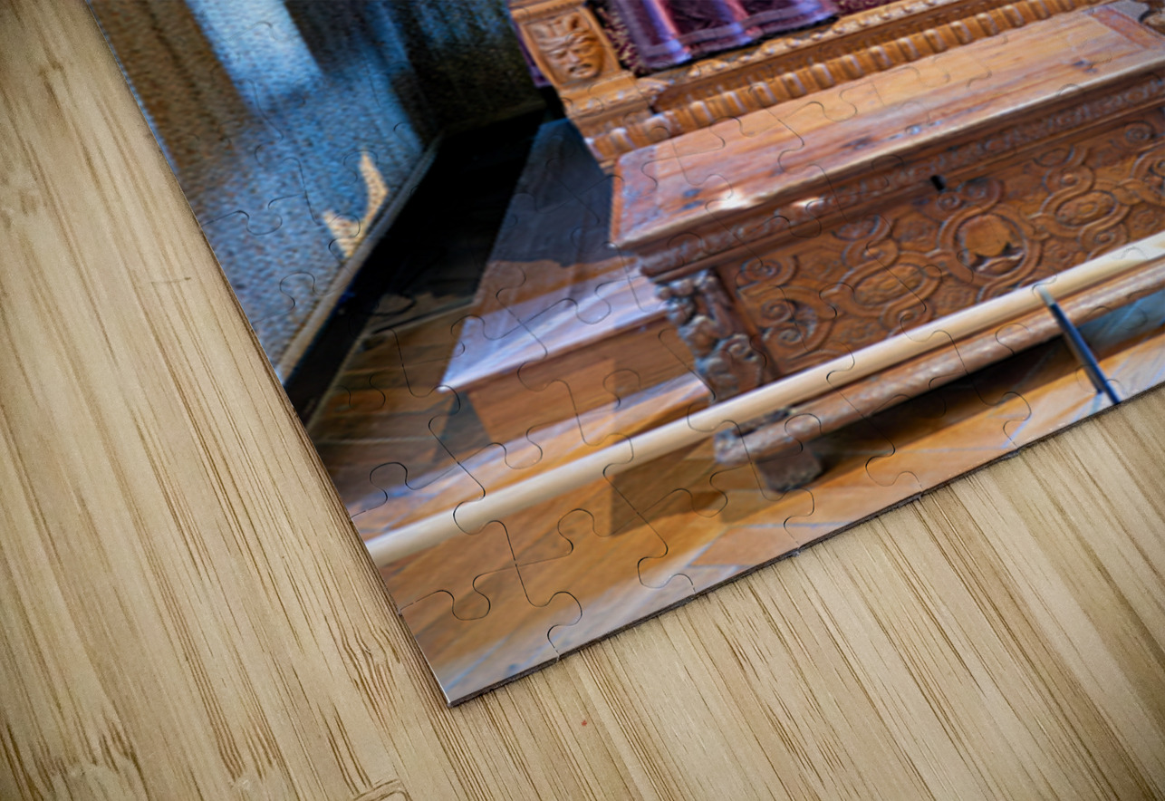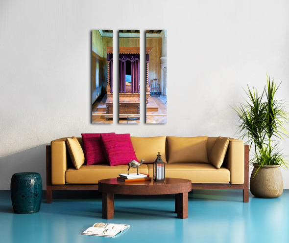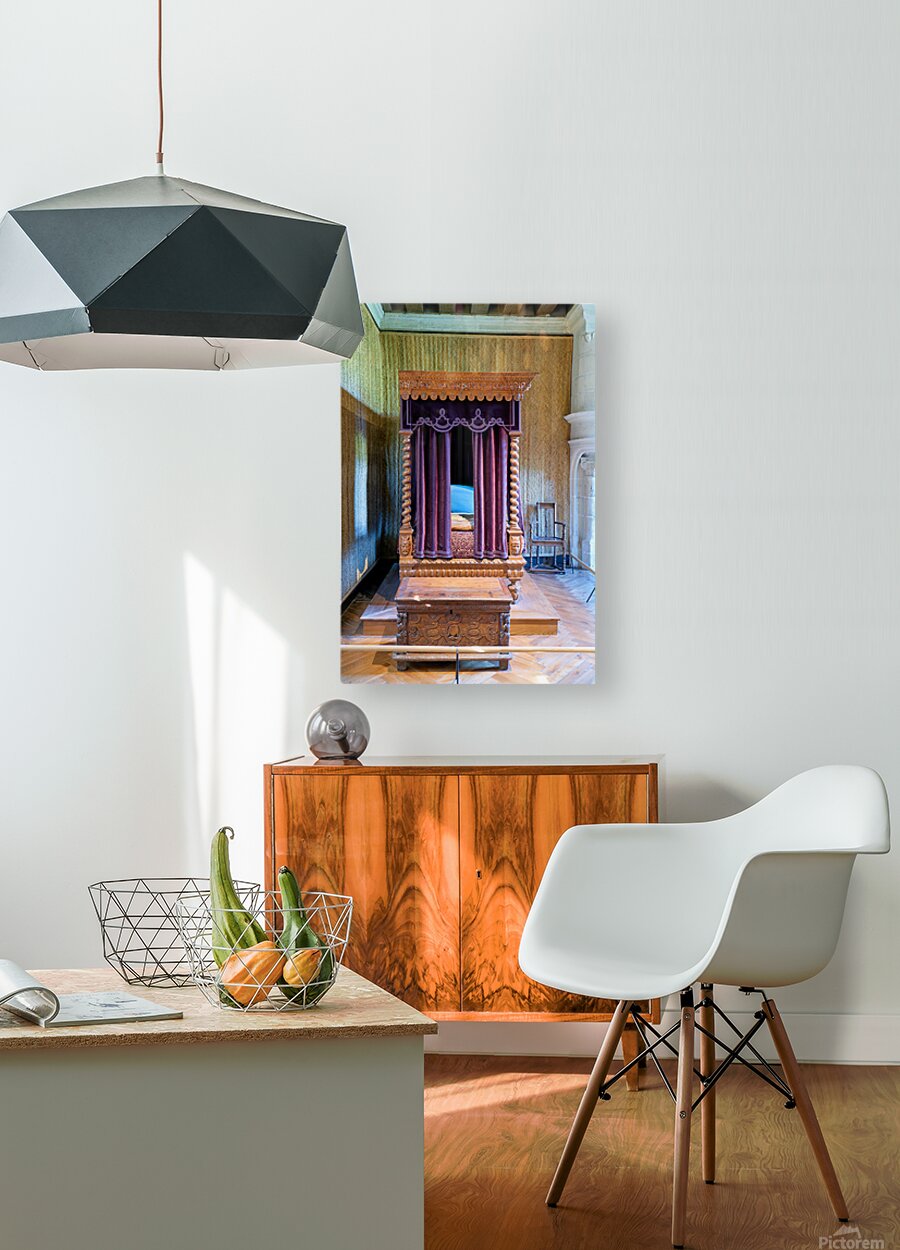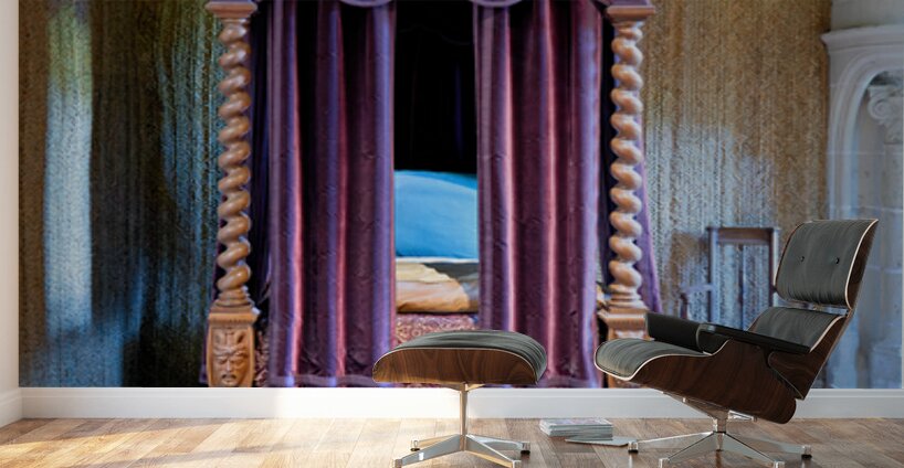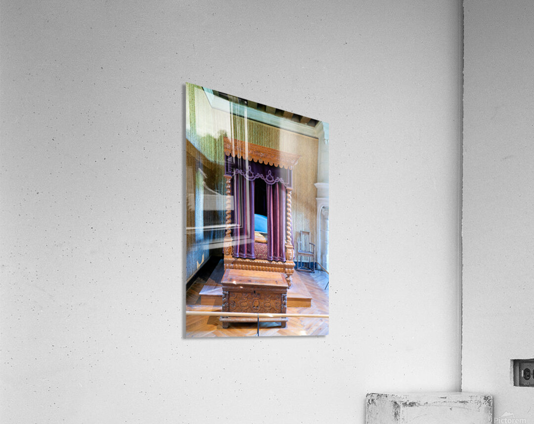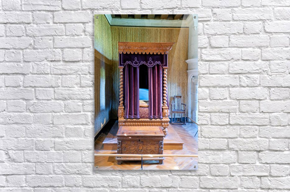 A wooden bed with curtains stands in the Chateau dAzay le Rideau.