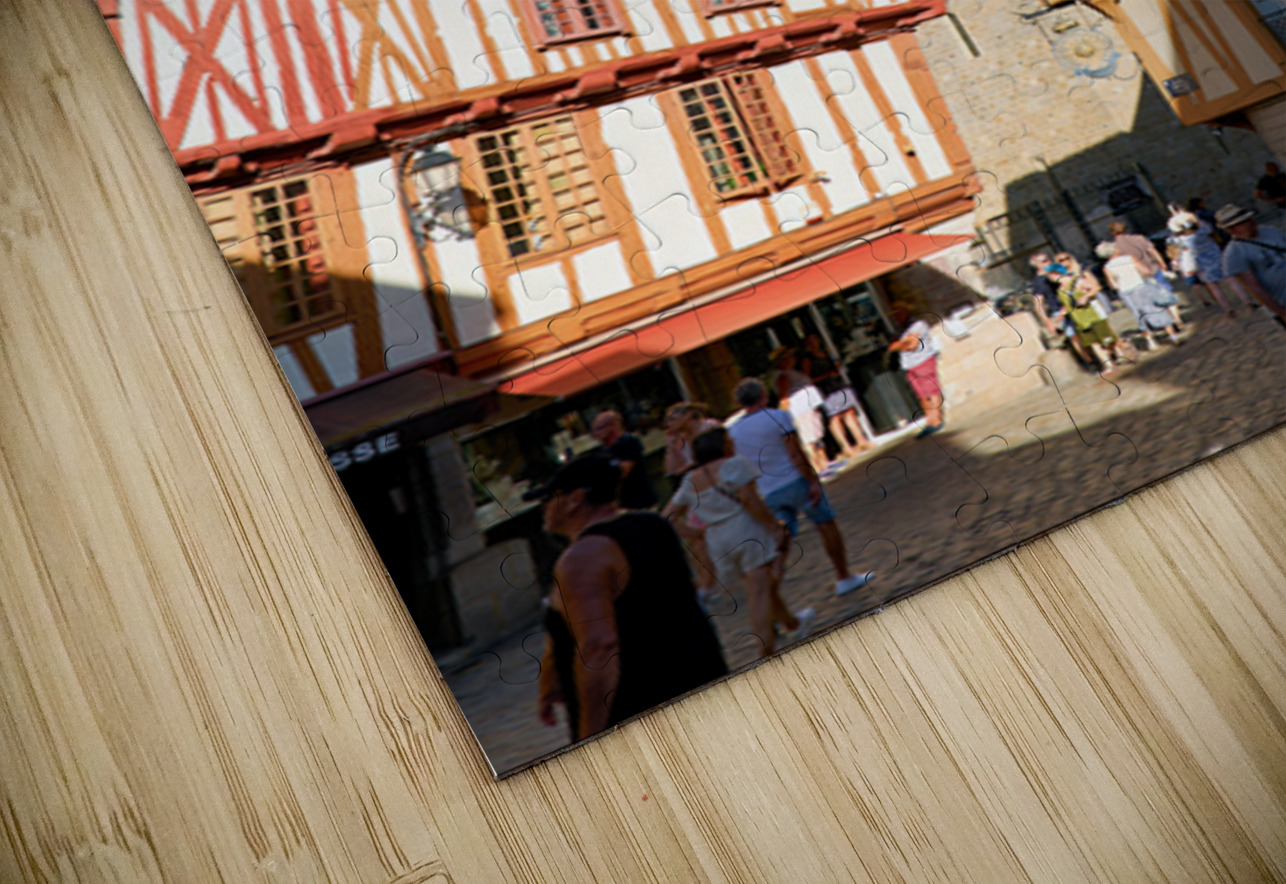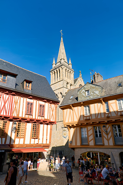 People walk and gather in Henry IV square near Saint Pierre Cathedral in Vannes Brittany. The sun shines down on the historic buildings.