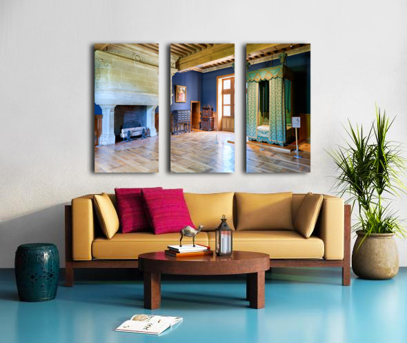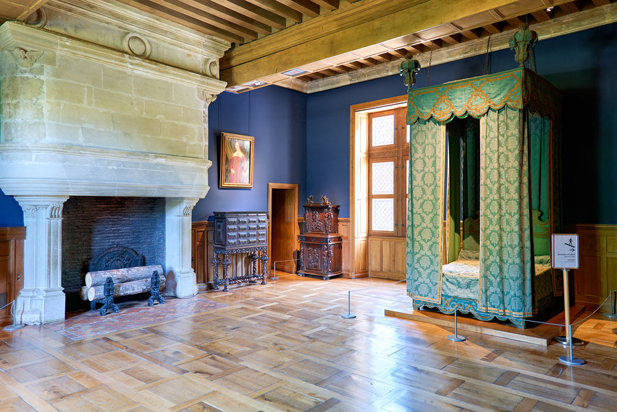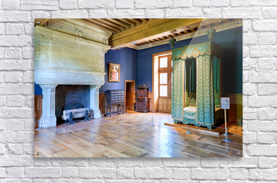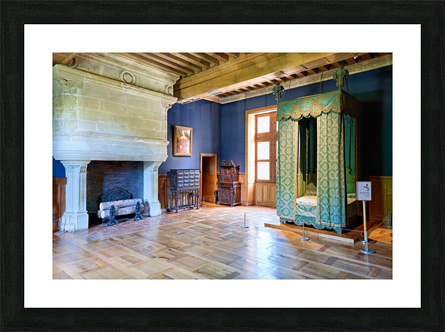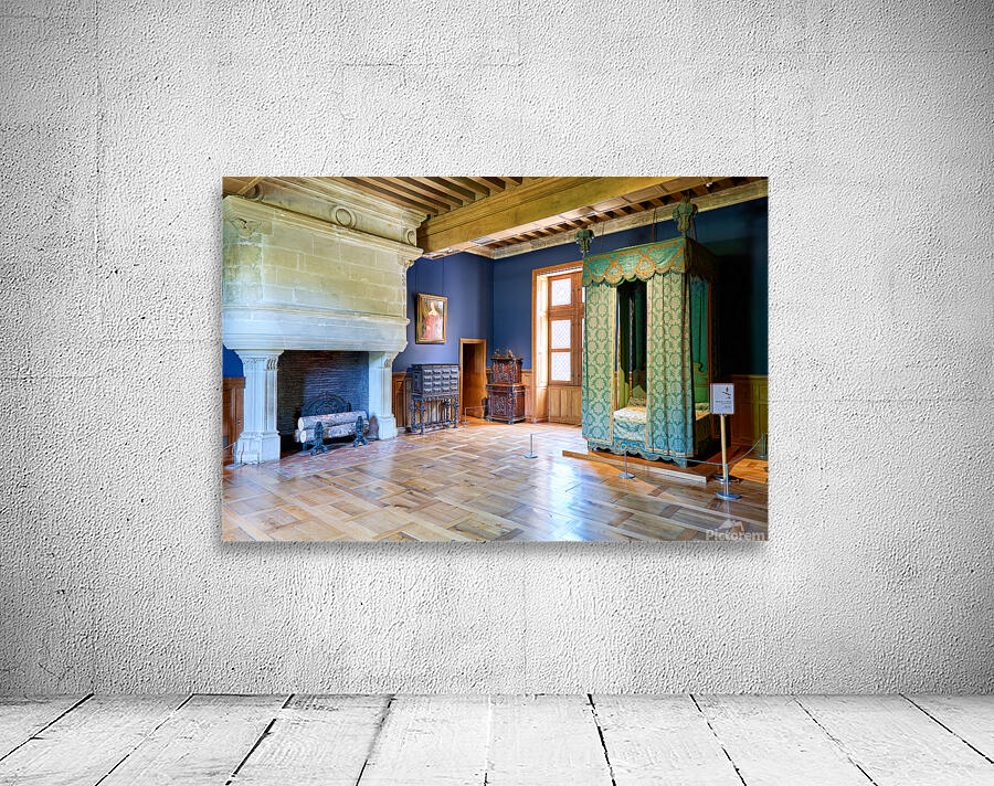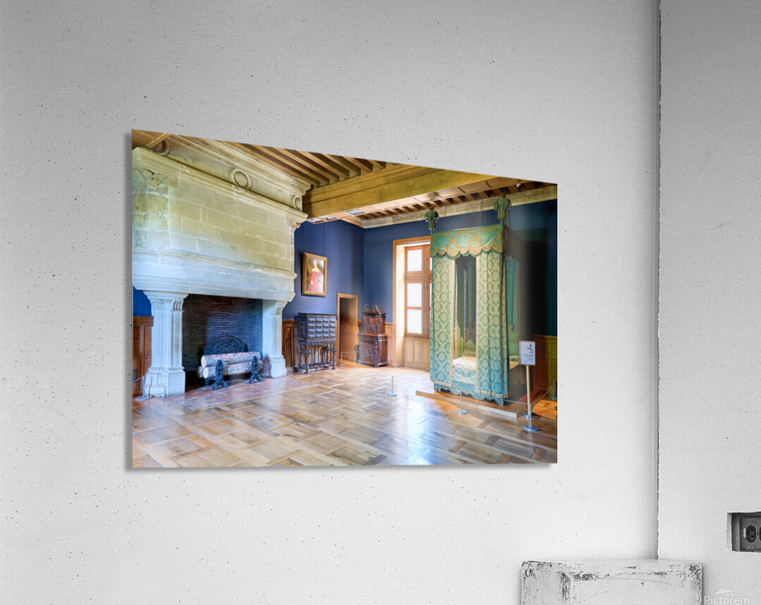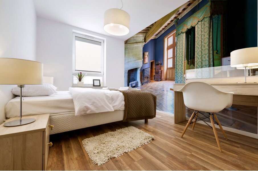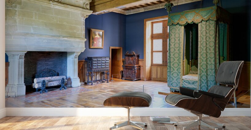 Visitors can see the inside of Chateau dAzay le Rideau with historic furniture and a large fireplace. The room has blue walls and wooden floors.