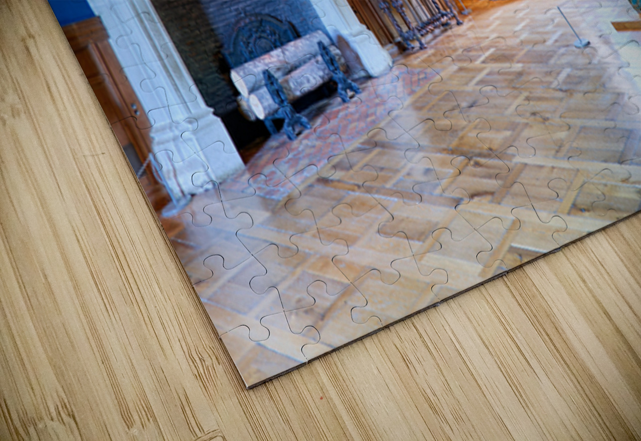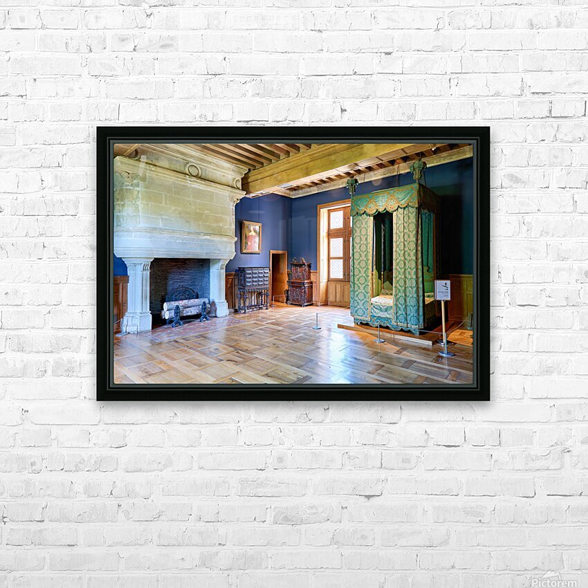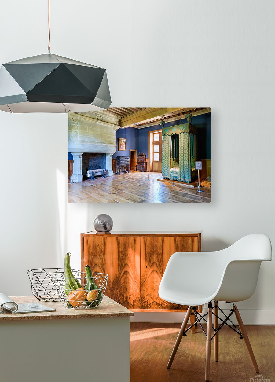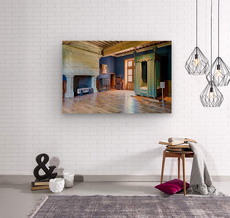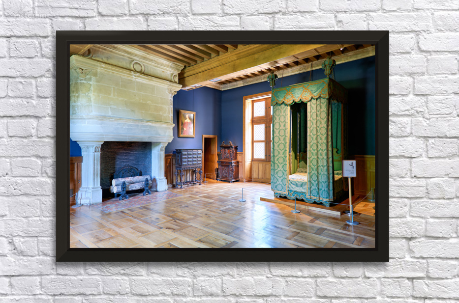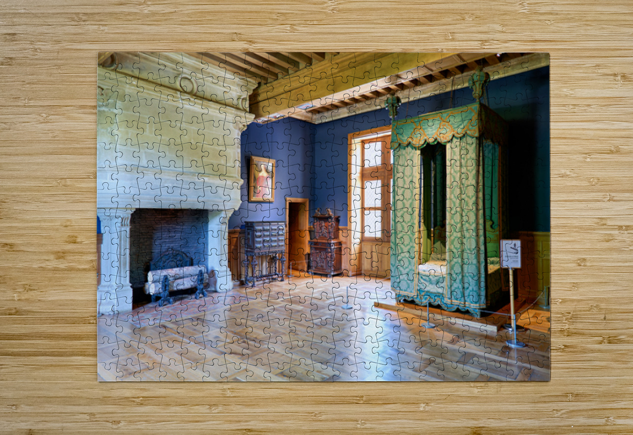 Visitors can see the inside of Chateau dAzay le Rideau with historic furniture and a large fireplace. The room has blue walls and wooden floors.