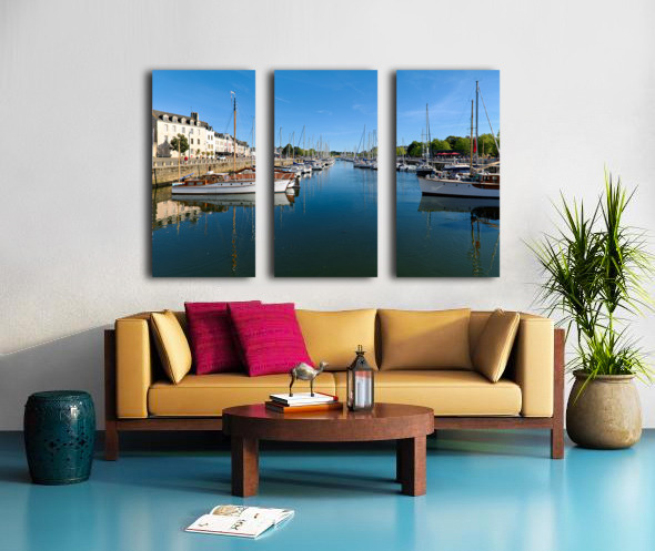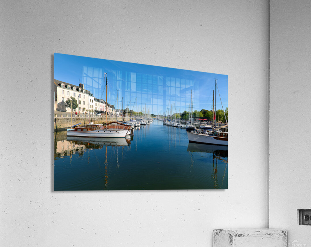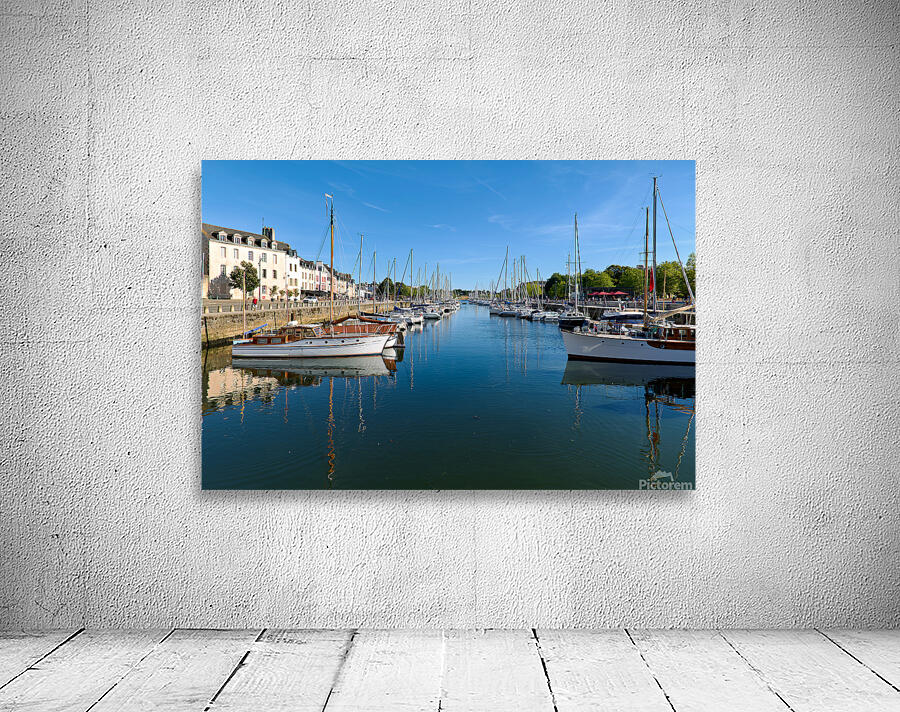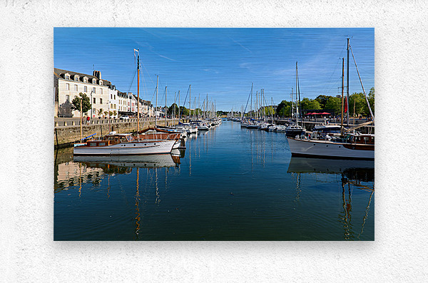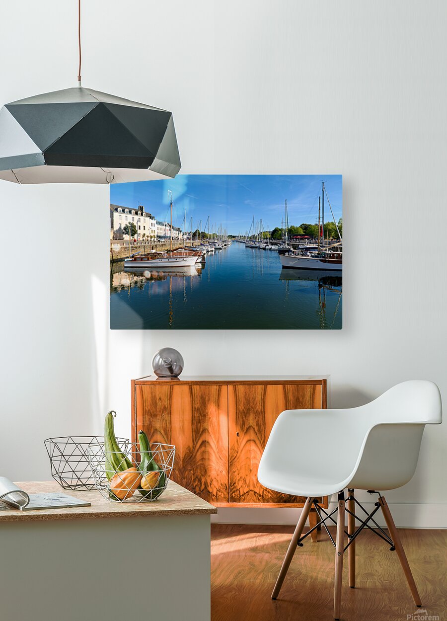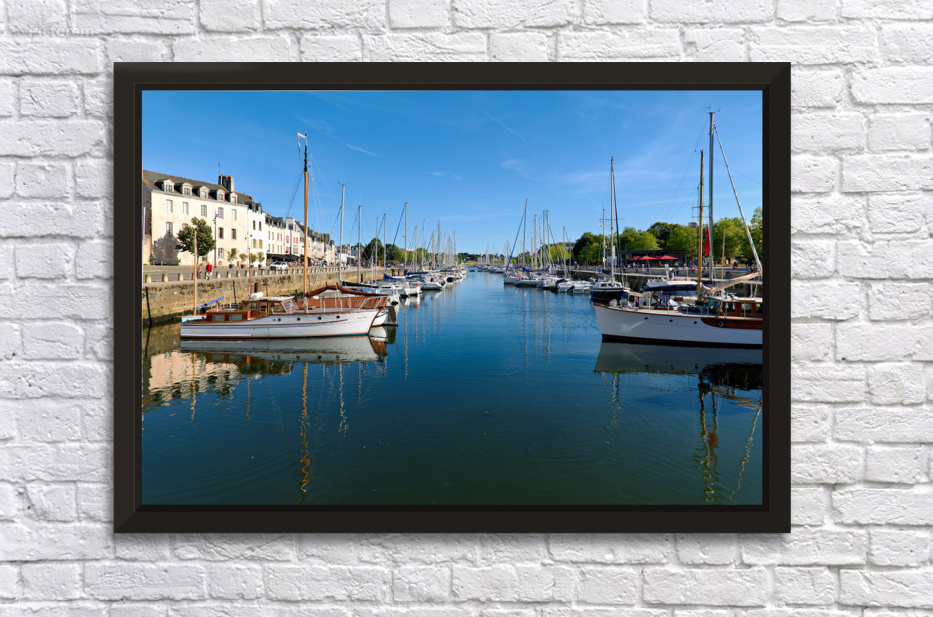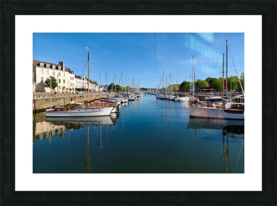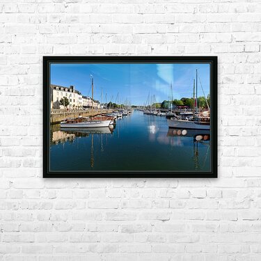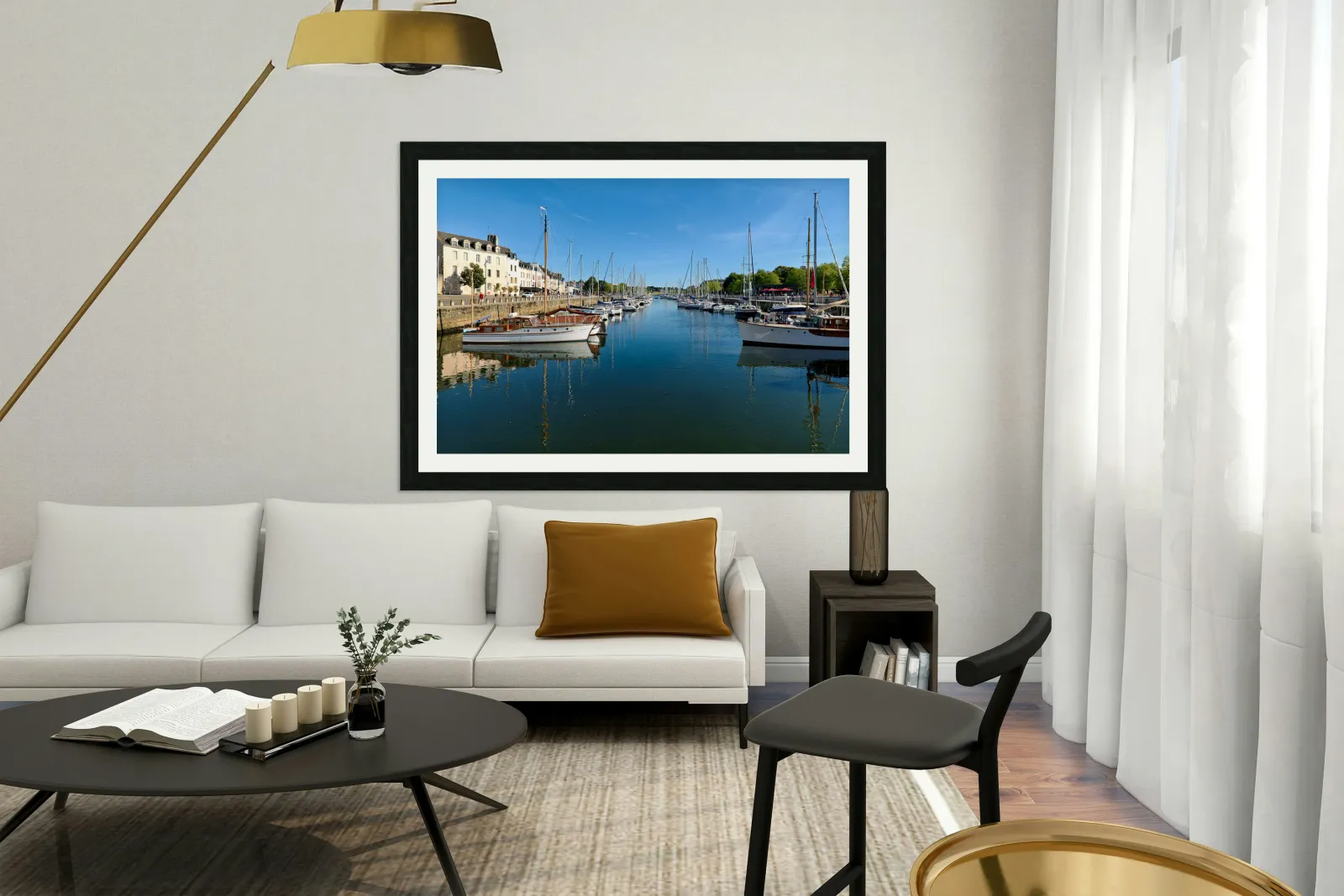 "Boats moored in Vannes port on a clear day in Brittany France" in a framed print.