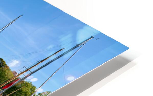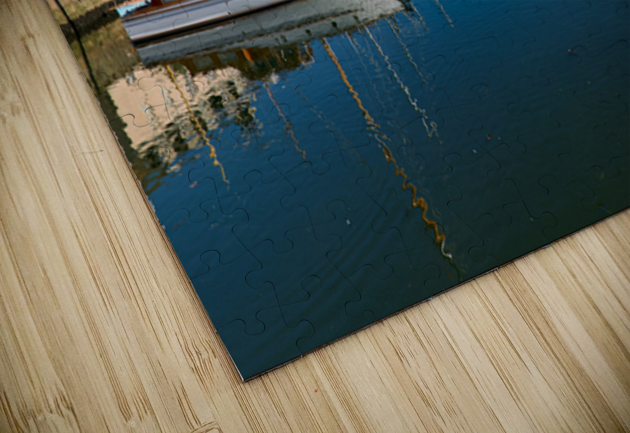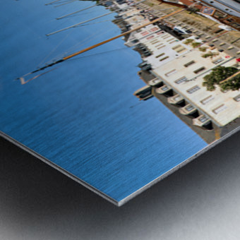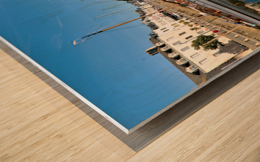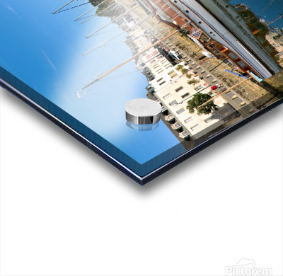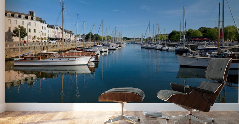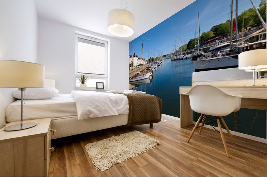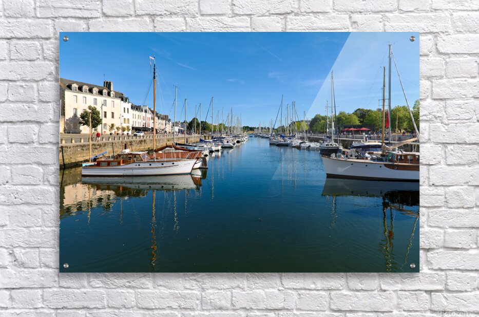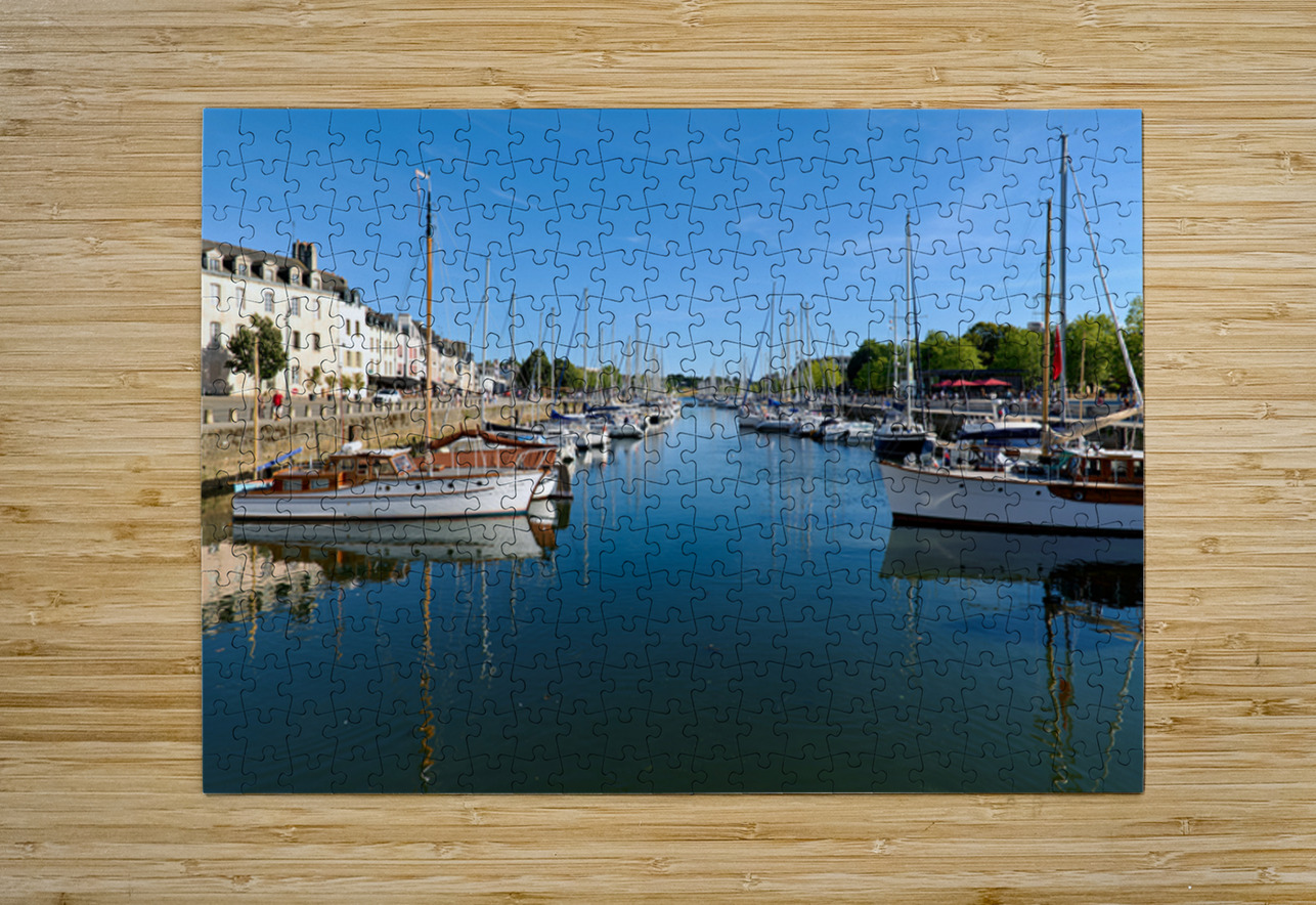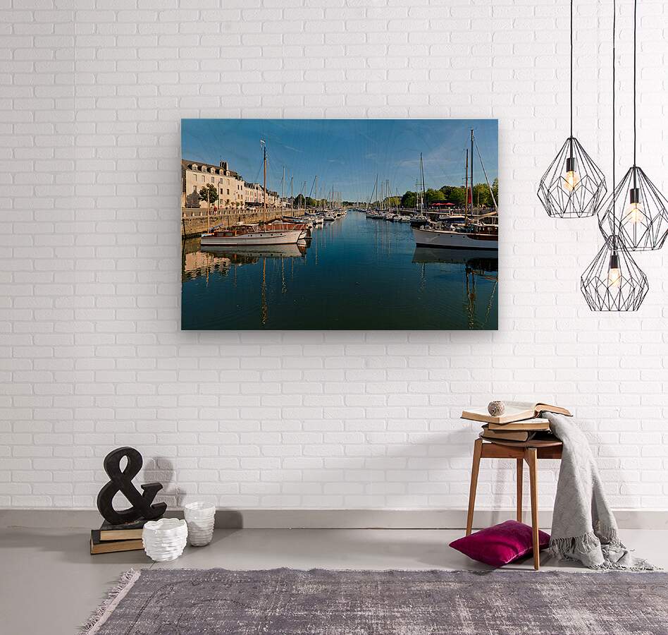 "Boats moored in Vannes port on a clear day in Brittany France" in a framed print.