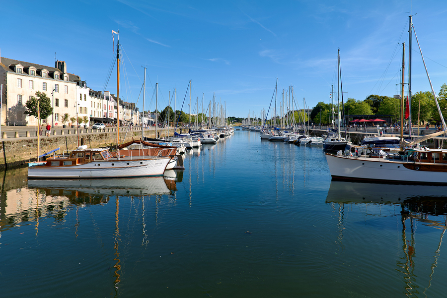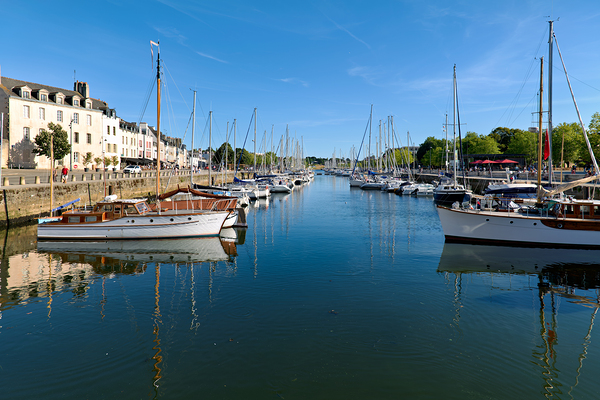 Boats are lined up at the port in Vannes Brittany France. The water reflects the boats and buildings under a bright blue sky.