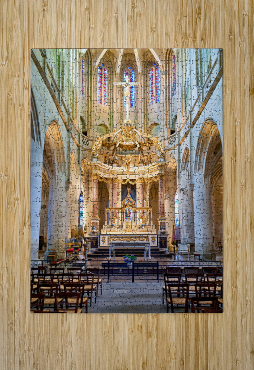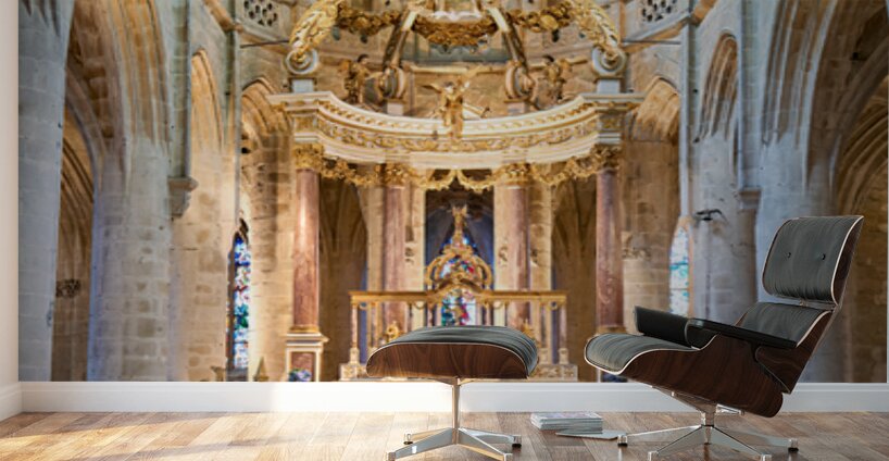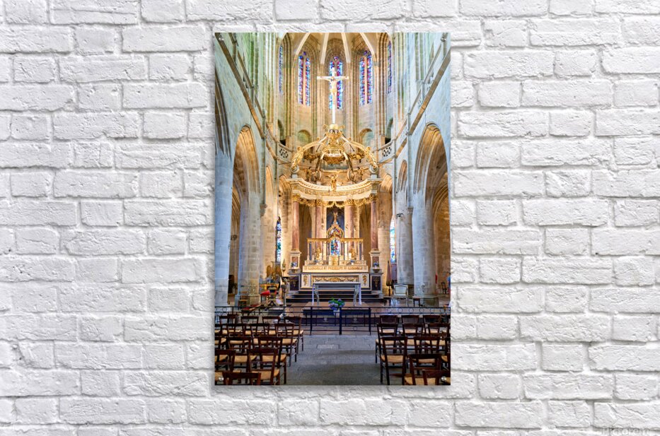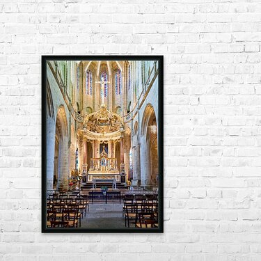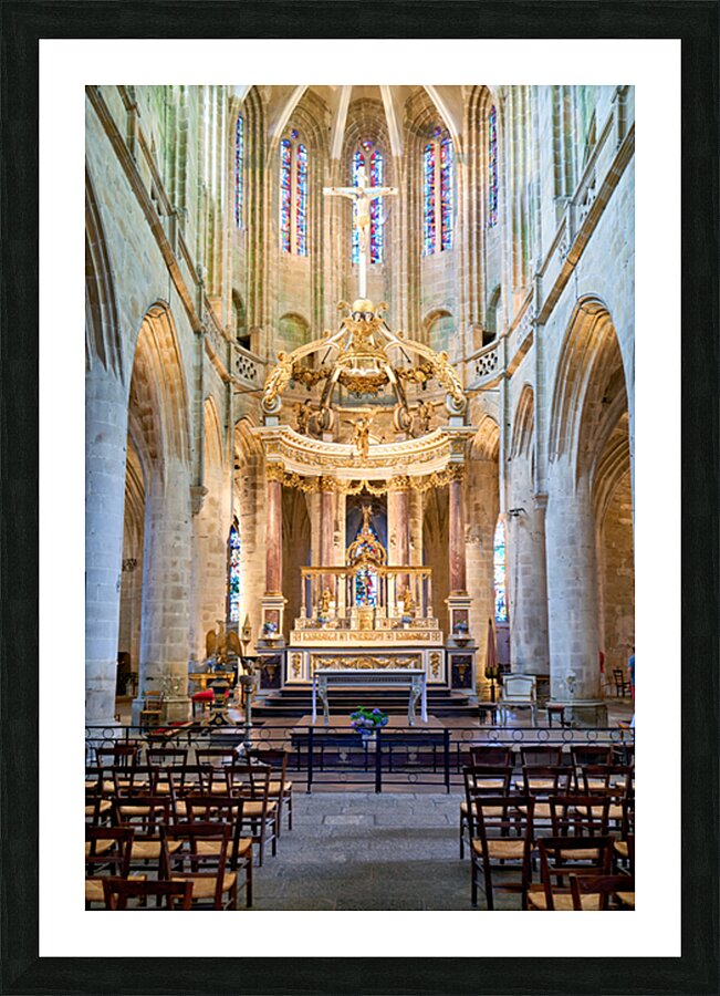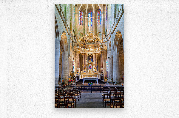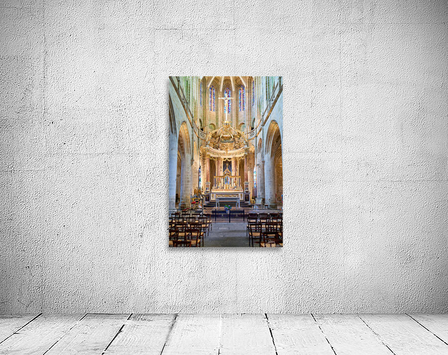 A view inside the Basilica of St Saviour in Dinan France. The church features a wooden altar and rows of wooden chairs for worshippers.