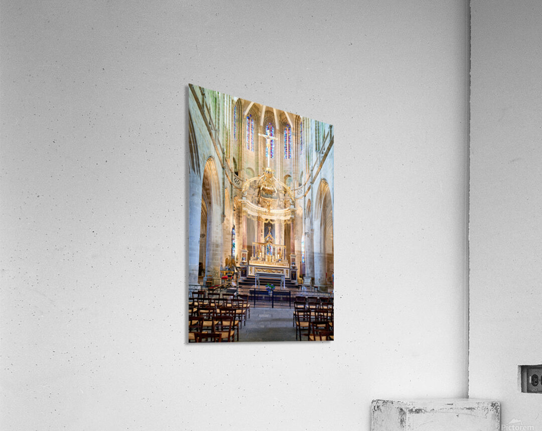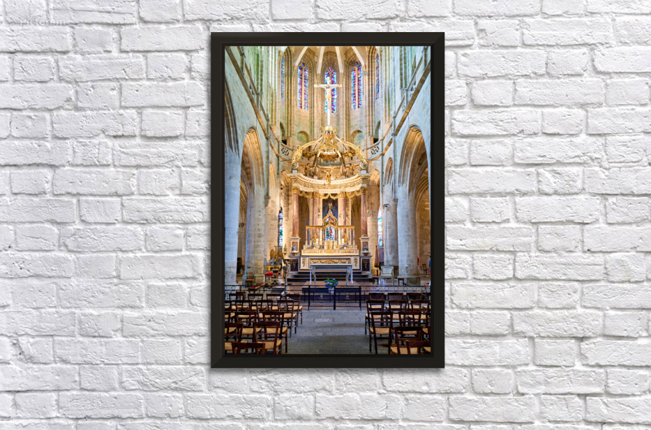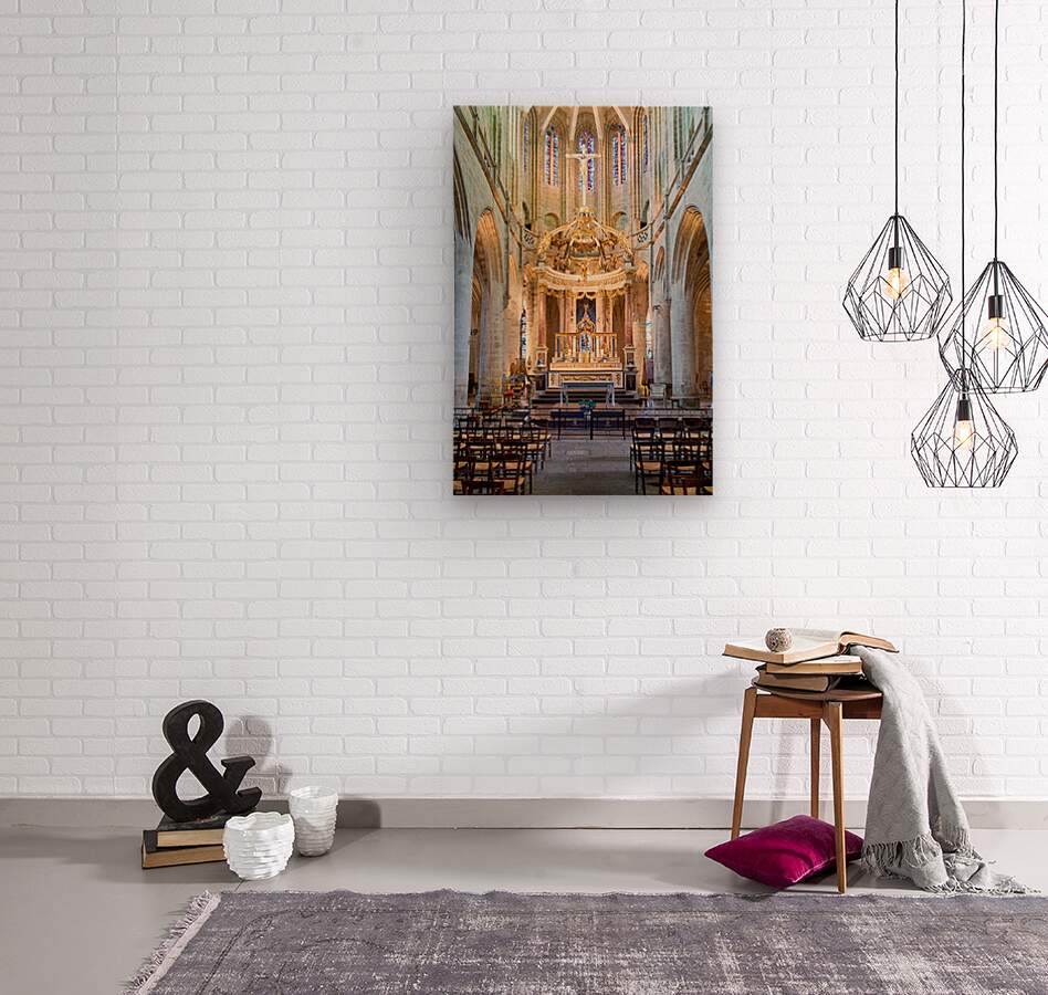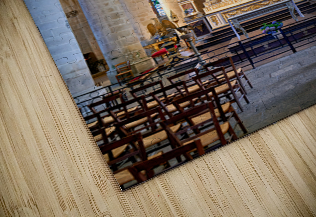 A view inside the Basilica of St Saviour in Dinan France. The church features a wooden altar and rows of wooden chairs for worshippers.
