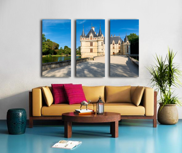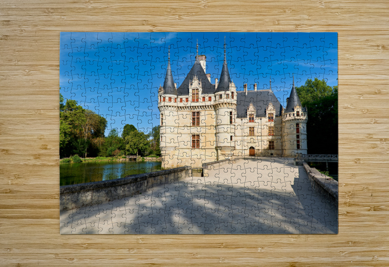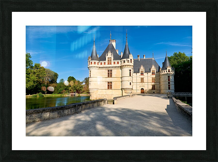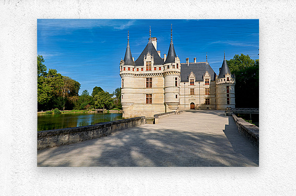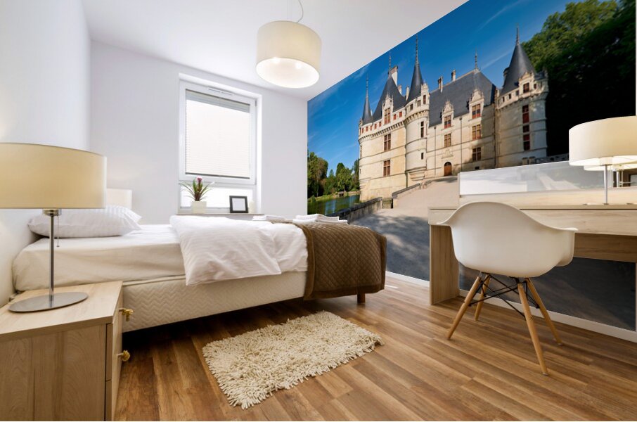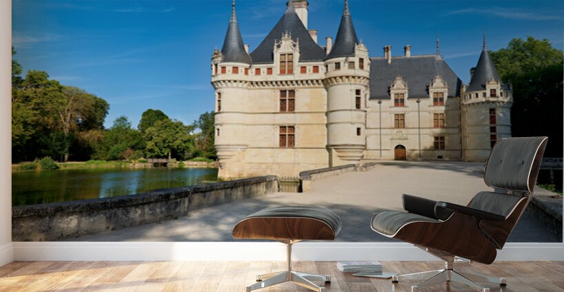 Visitors explore the grounds of Chateau dAzay le Rideau as trees surround the building. The sun shines bright in the clear blue sky.