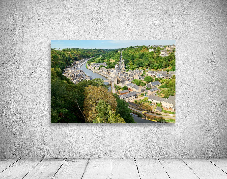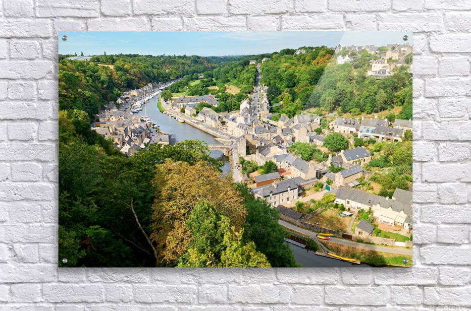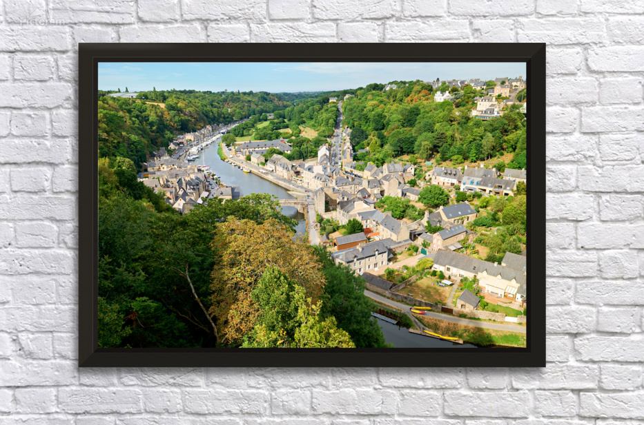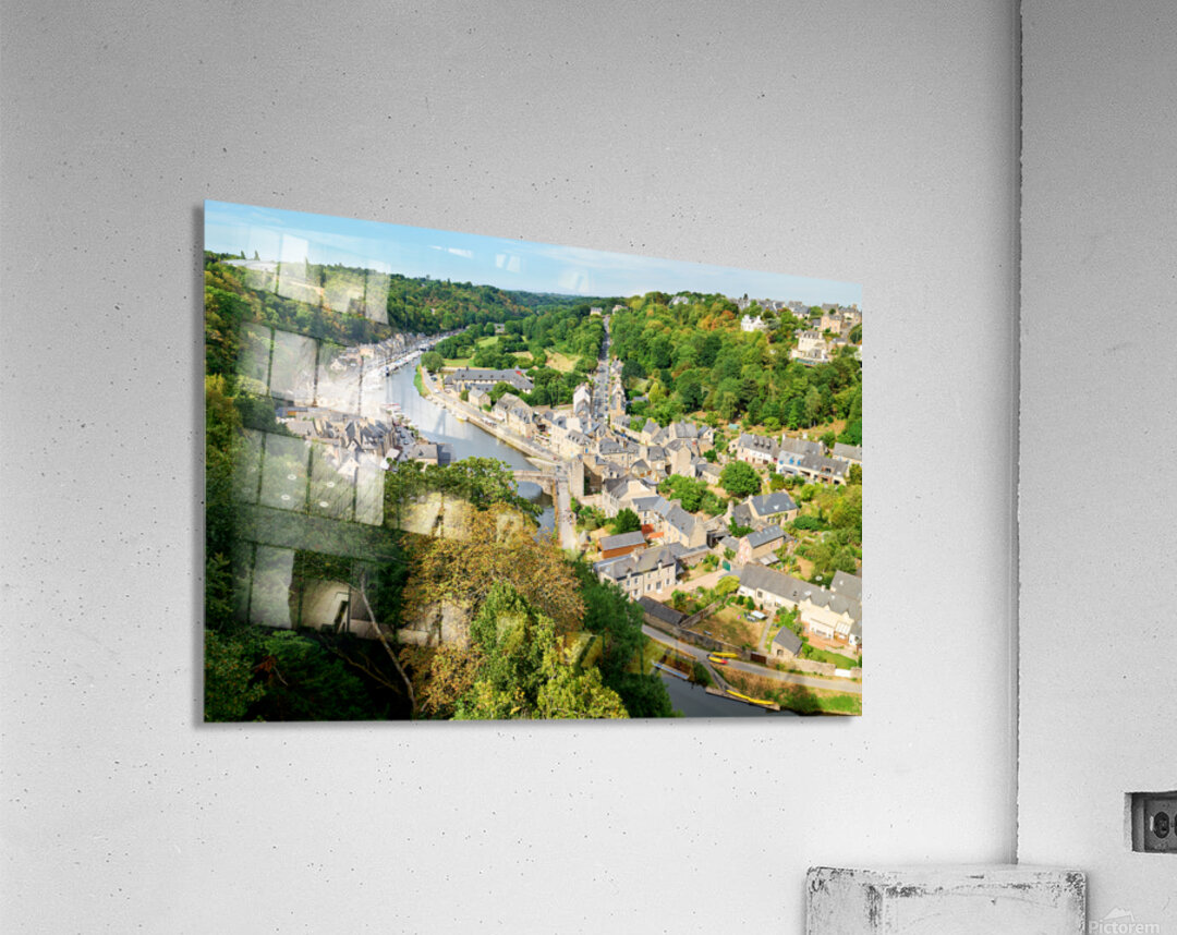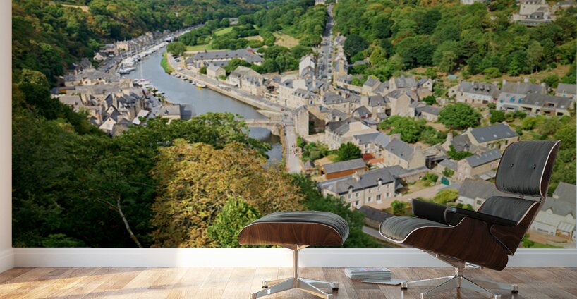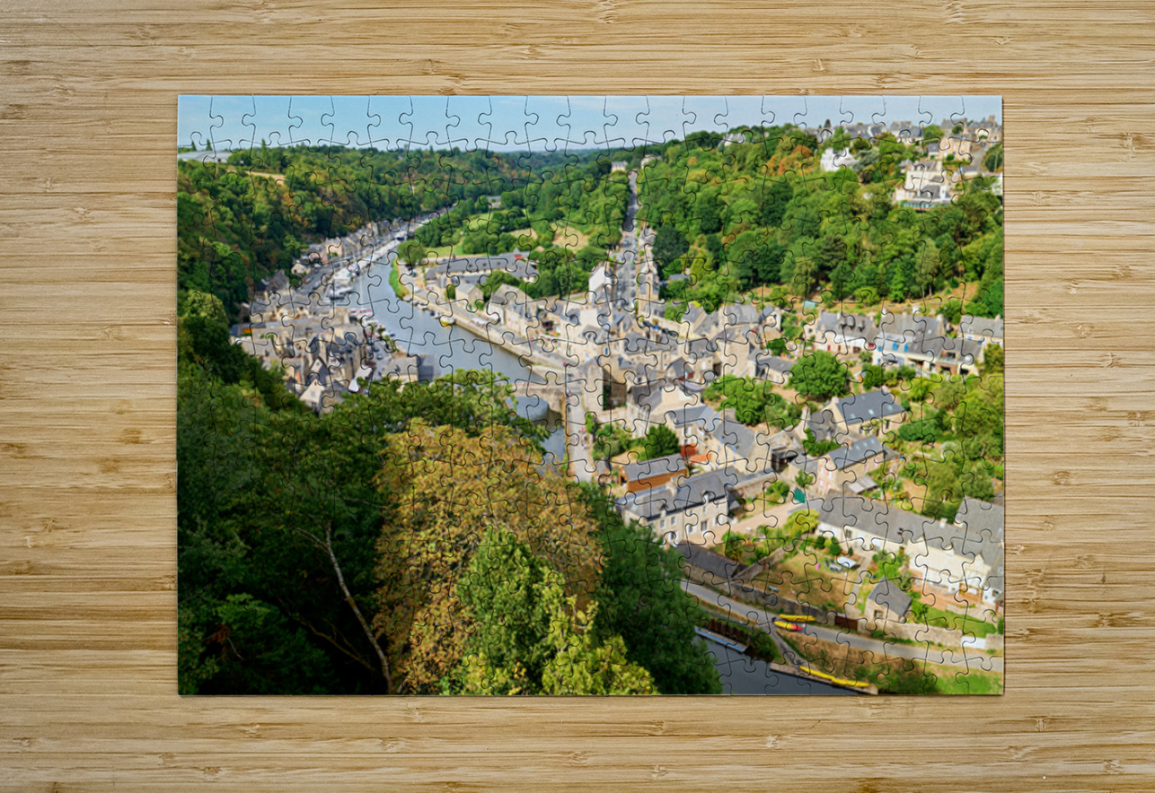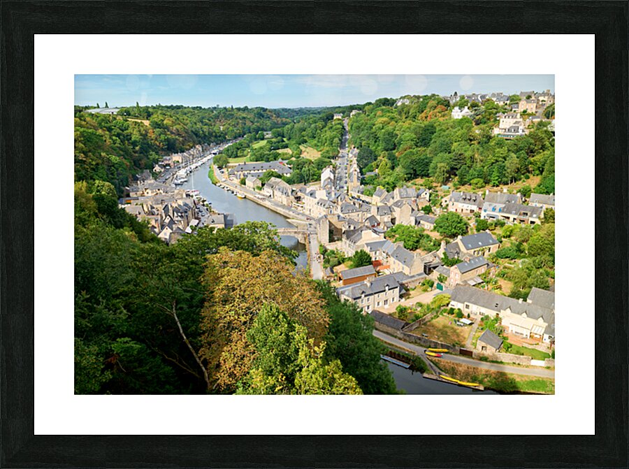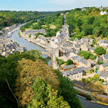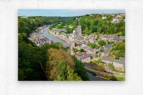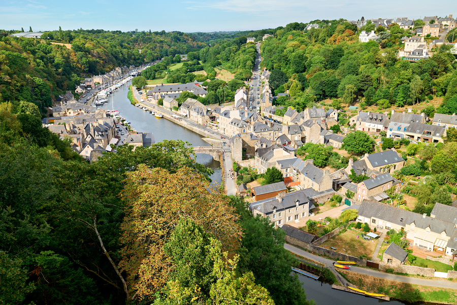 High angle view of Dinan showing buildings along La Rance river. Green trees surround the area and boats line the riverbank.