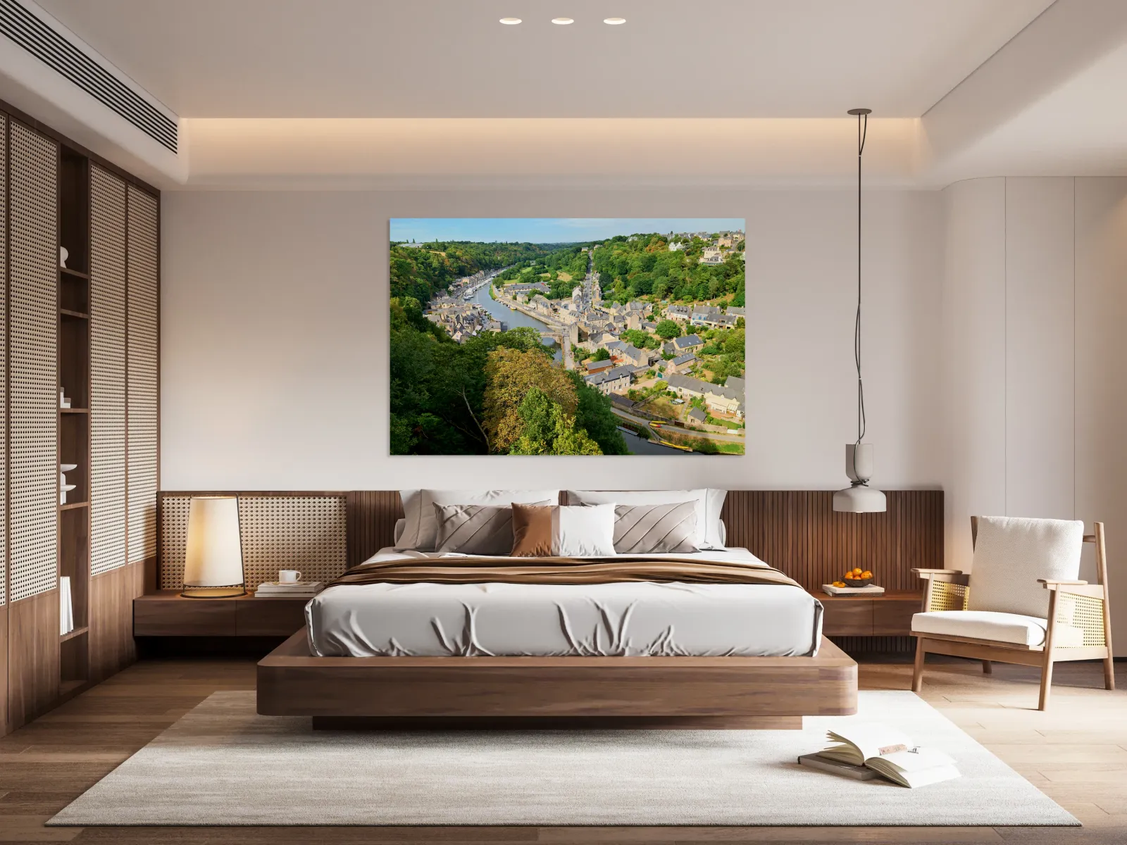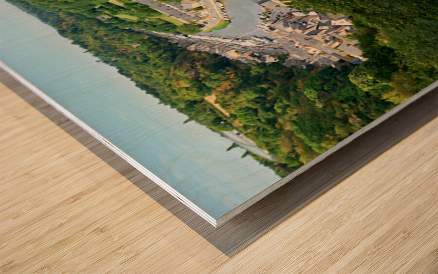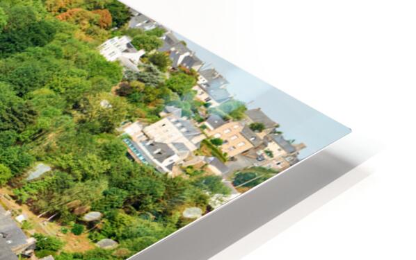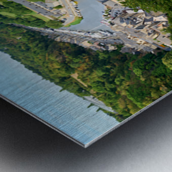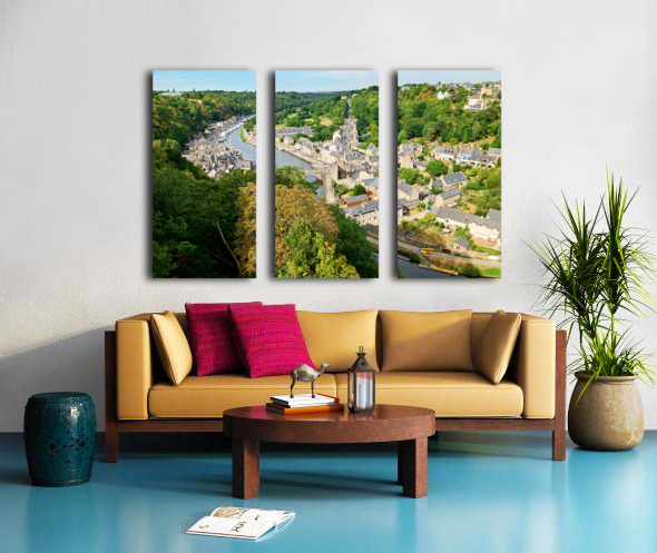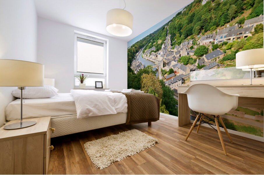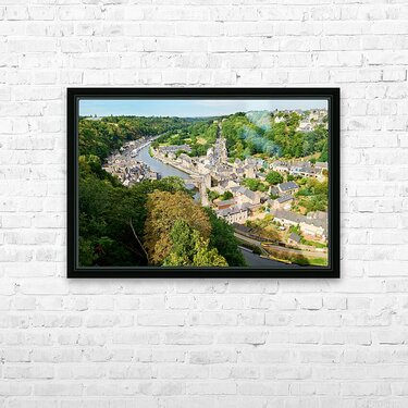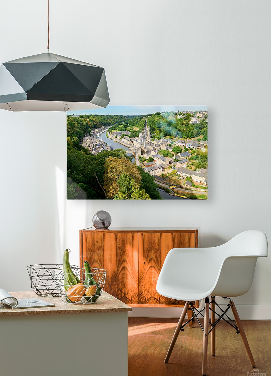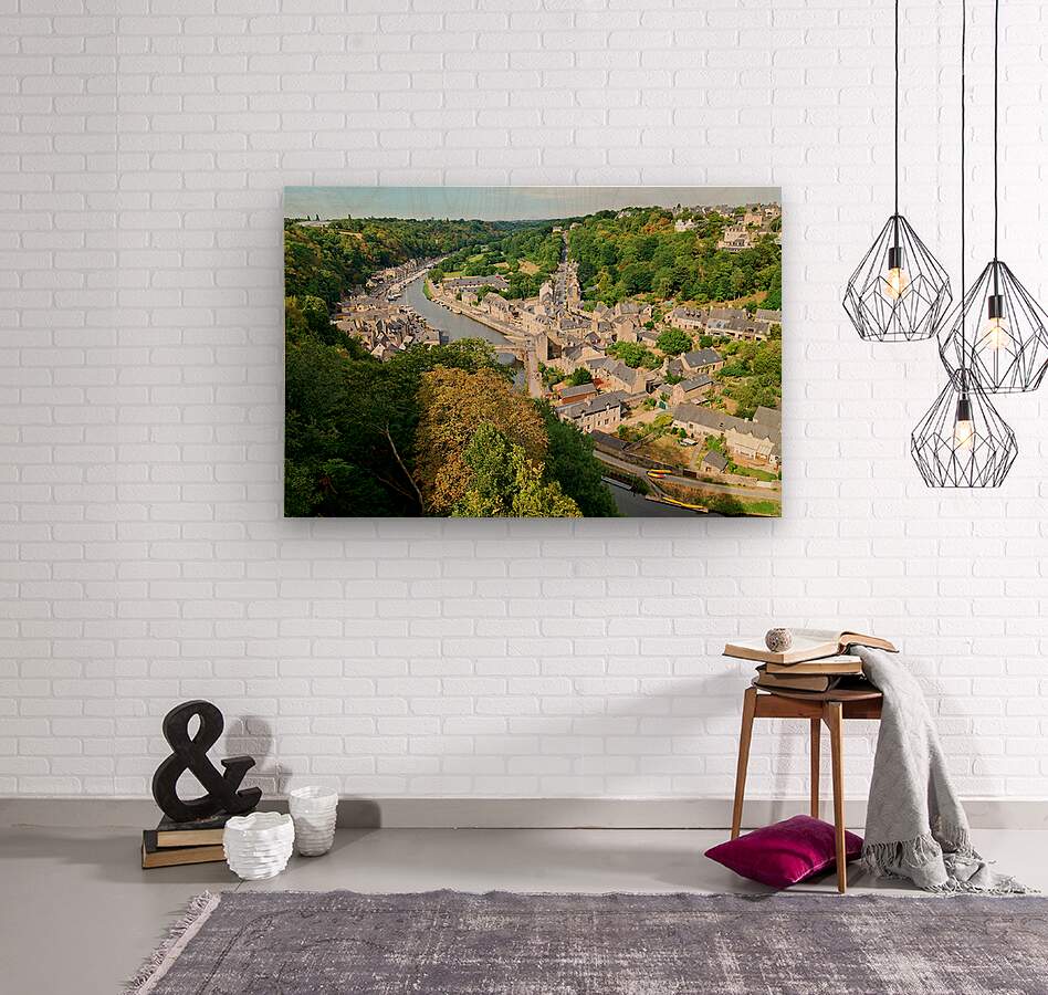 High angle view of Dinan showing buildings along La Rance river. Green trees surround the area and boats line the riverbank.
