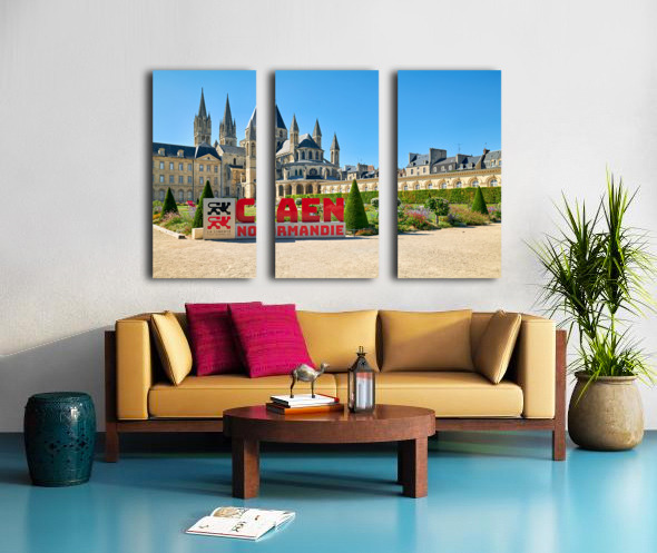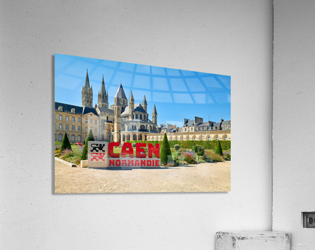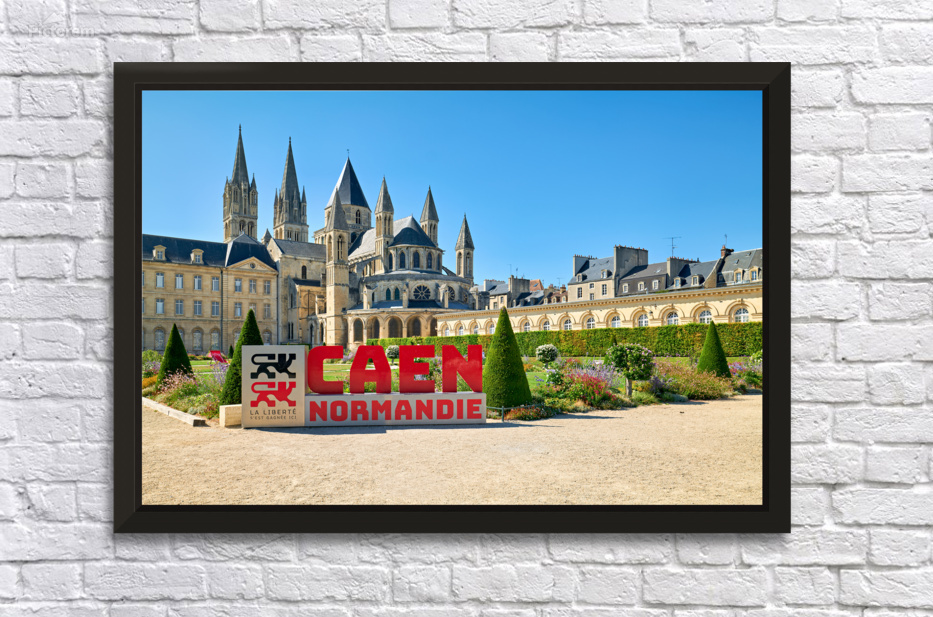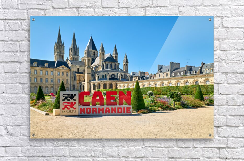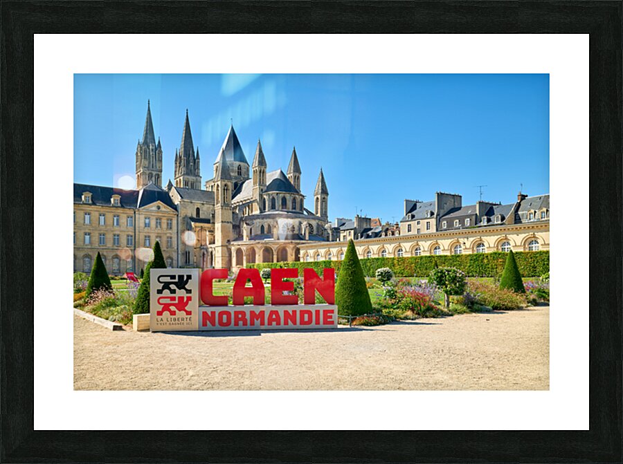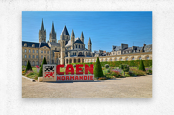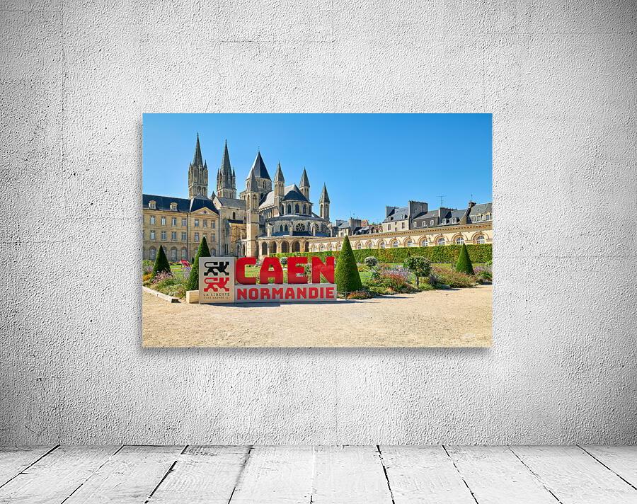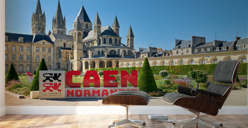 Visitors are seen enjoying the gardens and architecture of the Abbey of Saint-Etienne in Caen Normandy. The sun shines down on the historic site.