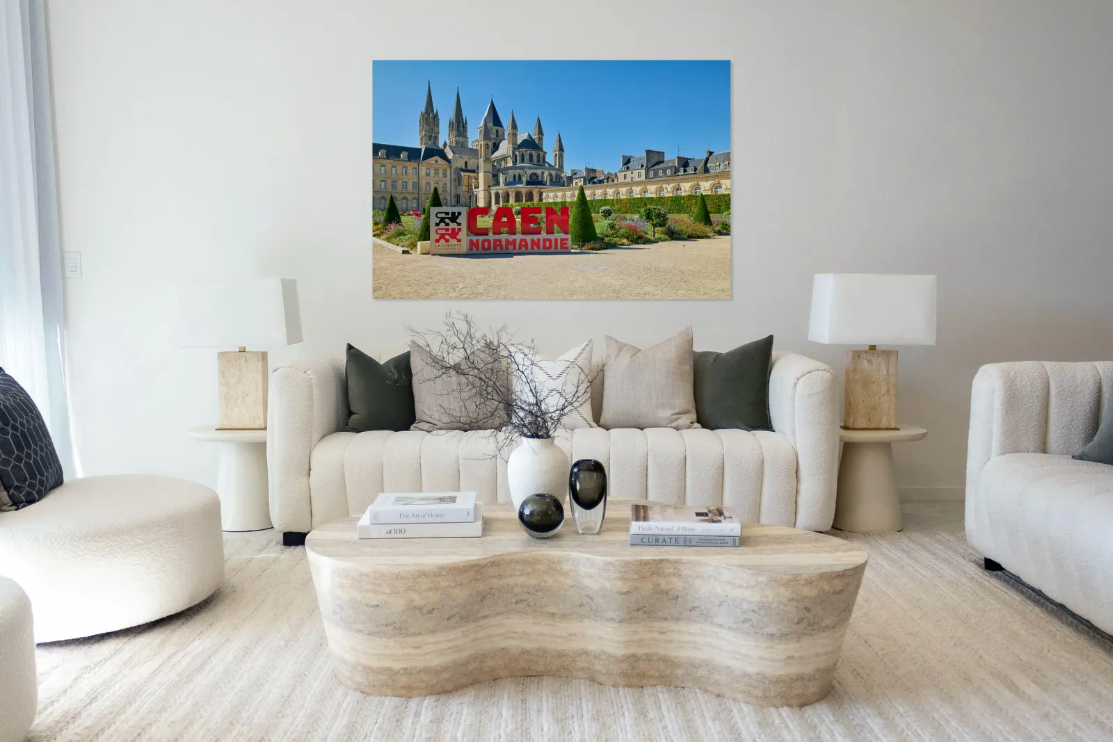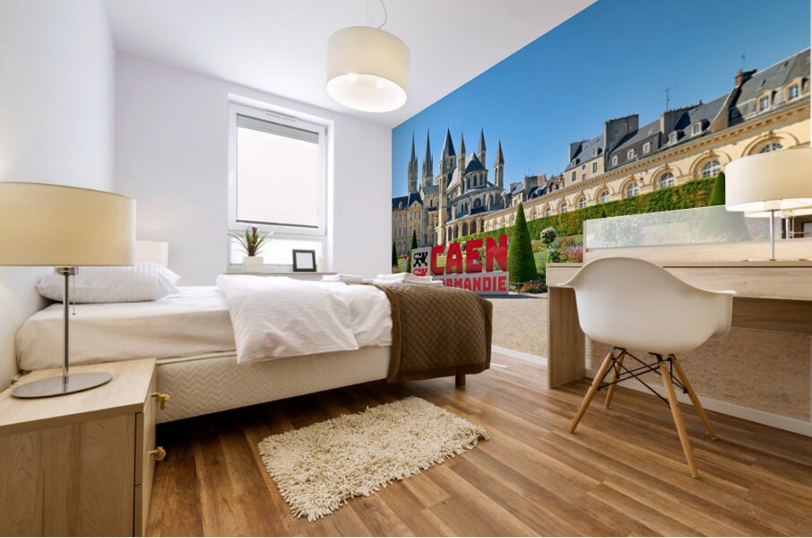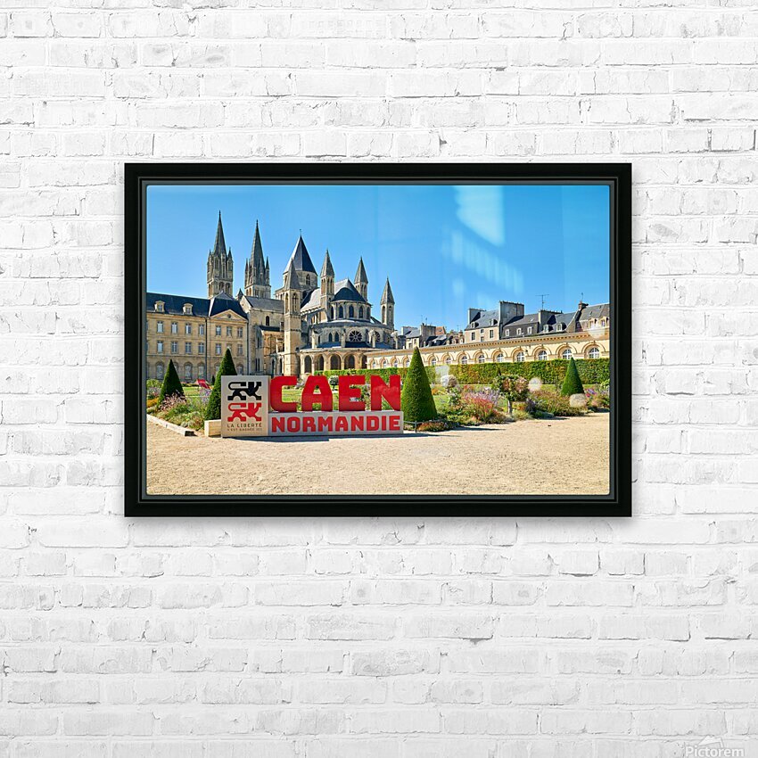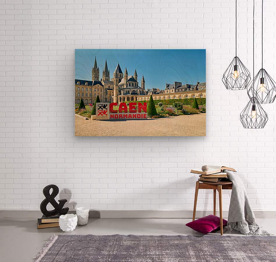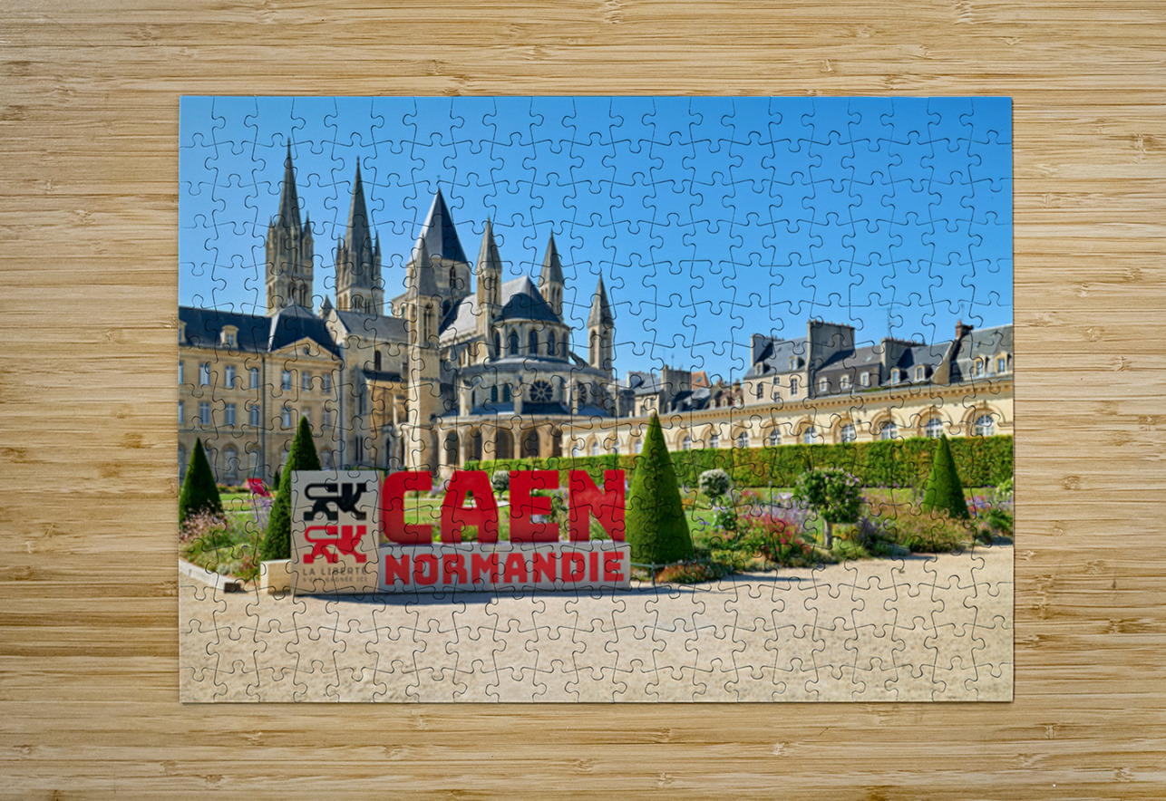 Visitors are seen enjoying the gardens and architecture of the Abbey of Saint-Etienne in Caen Normandy. The sun shines down on the historic site.