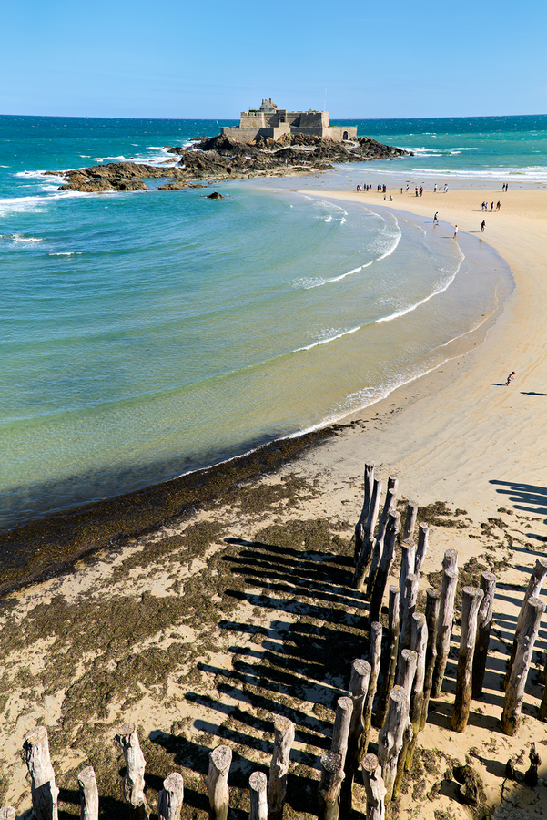 Visitors walk along the sandy beach near Fort National in Saint Malo Brittany. The sun is shining and waves are rolling in from the ocean.