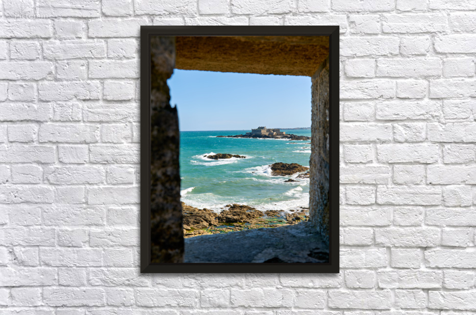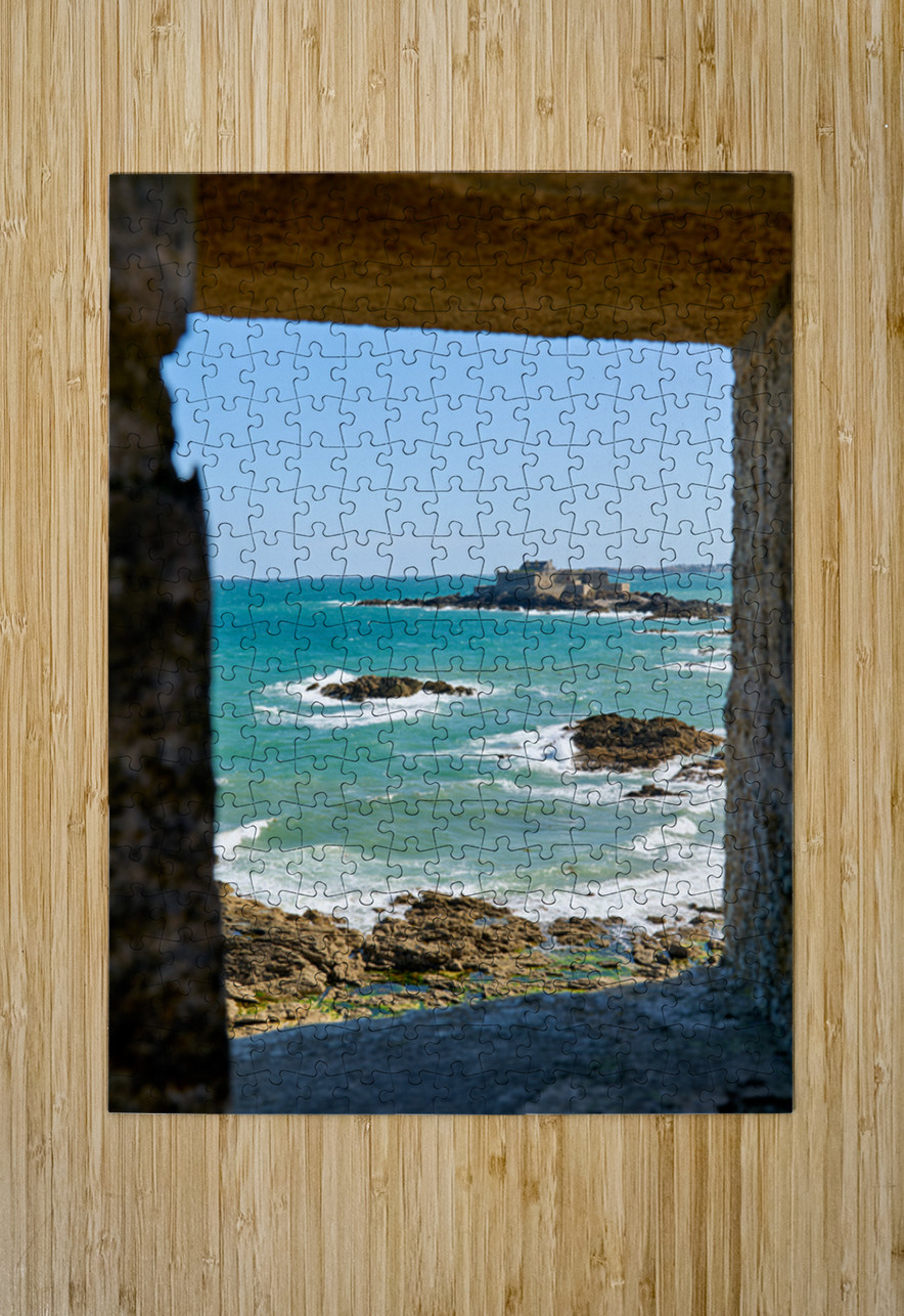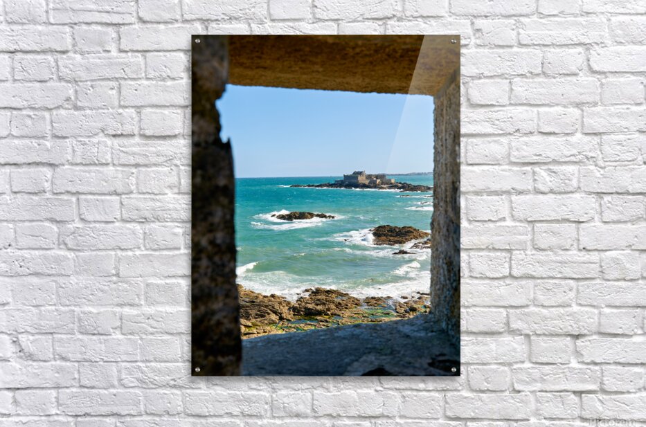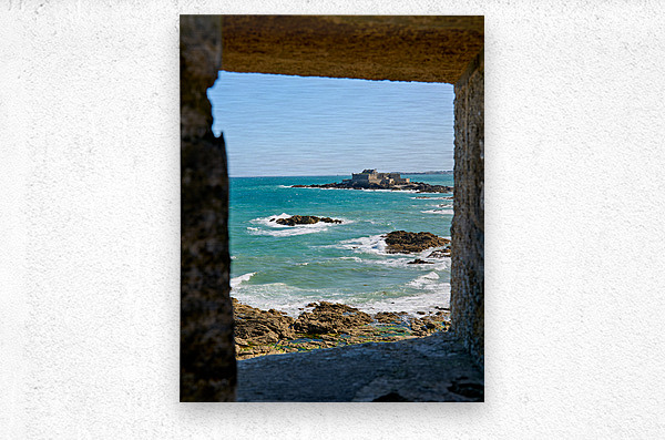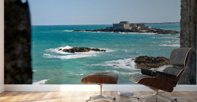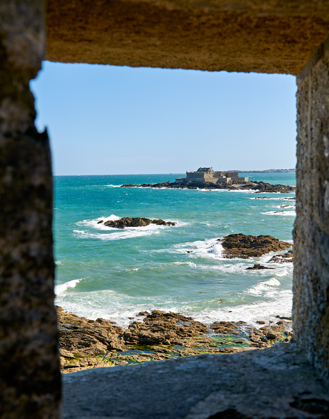 A view from a stone wall shows Fort National in Saint Malo Brittany. Waves crash on rocks as the fort stands against a clear blue sky.