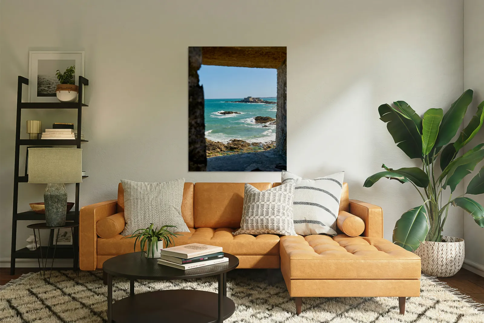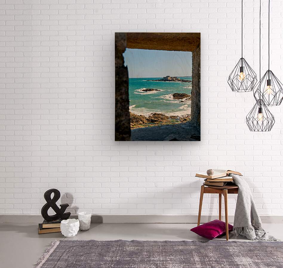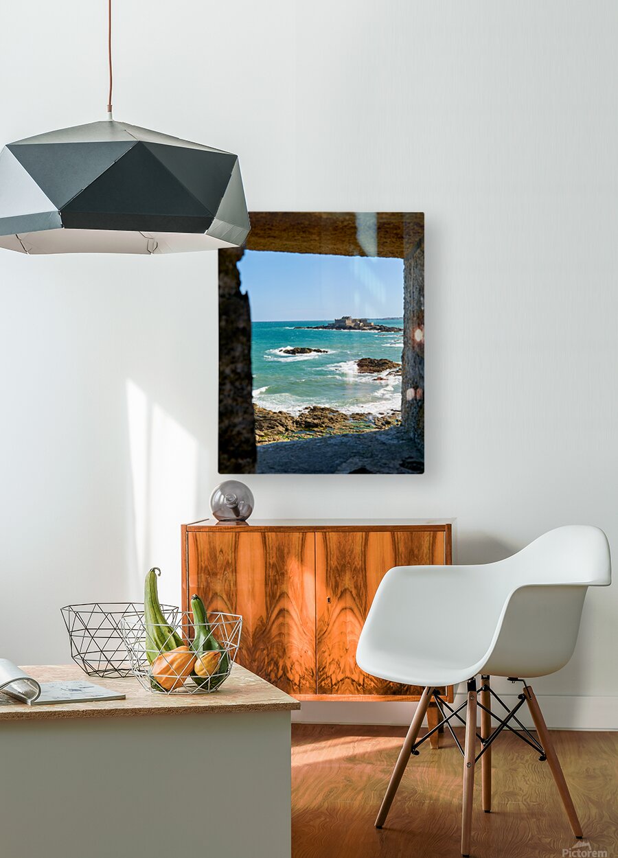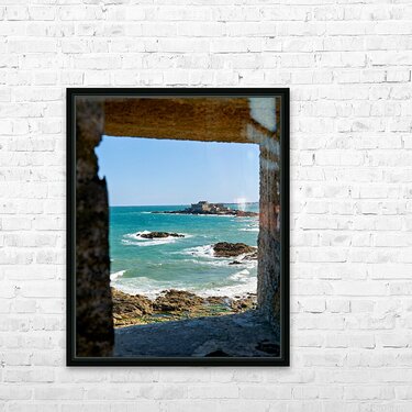 A view from a stone wall shows Fort National in Saint Malo Brittany. Waves crash on rocks as the fort stands against a clear blue sky.