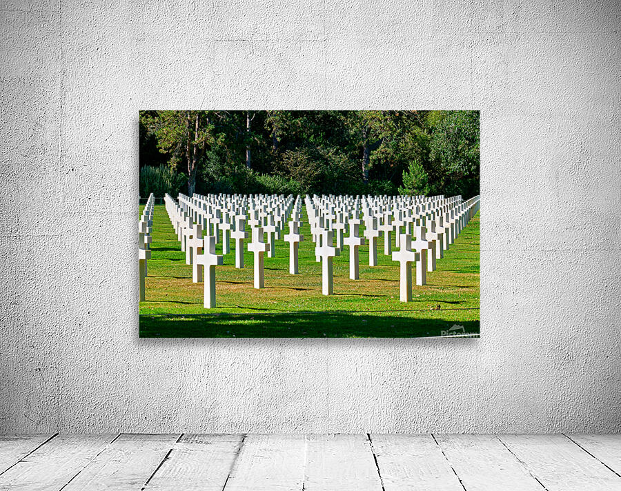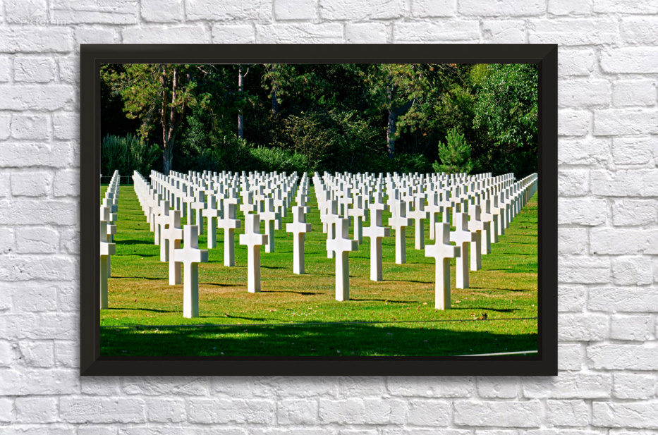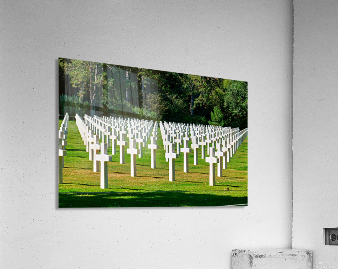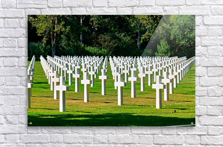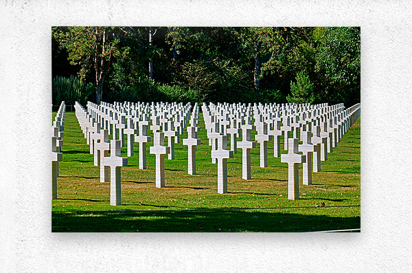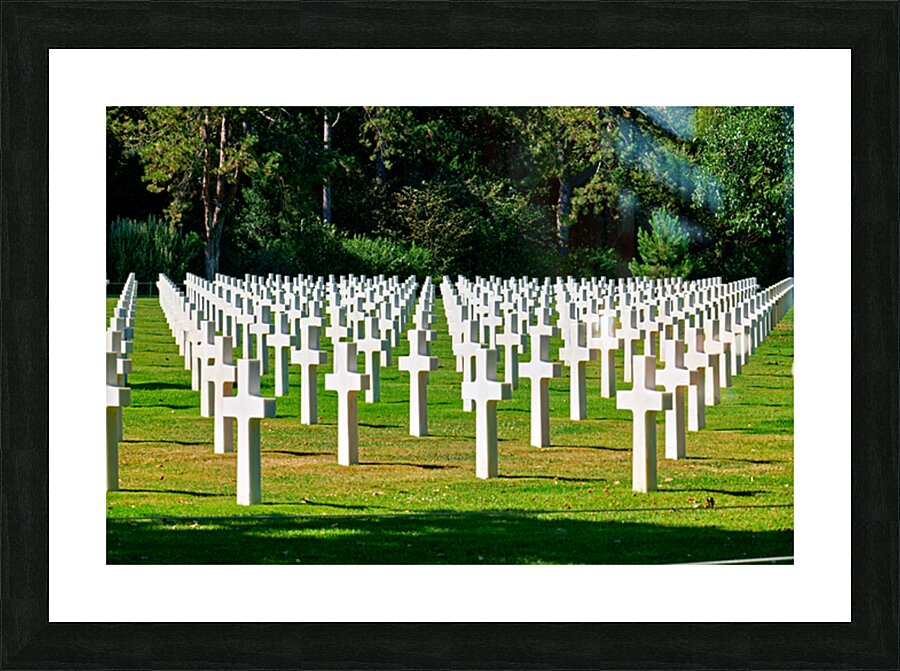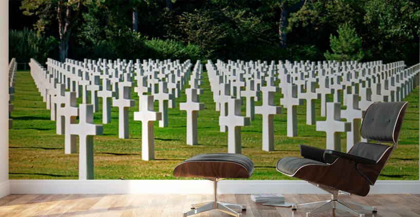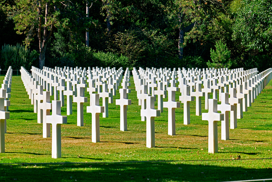 Grave markers stand in rows at Normandy American Cemetery in Colleville sur Mer honoring soldiers who fought in World War II.