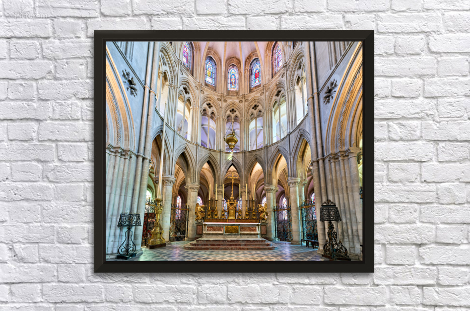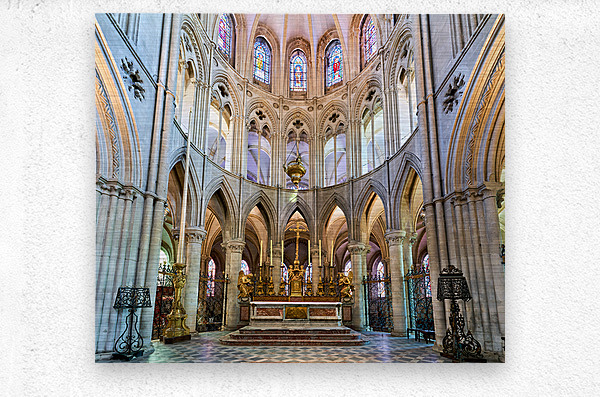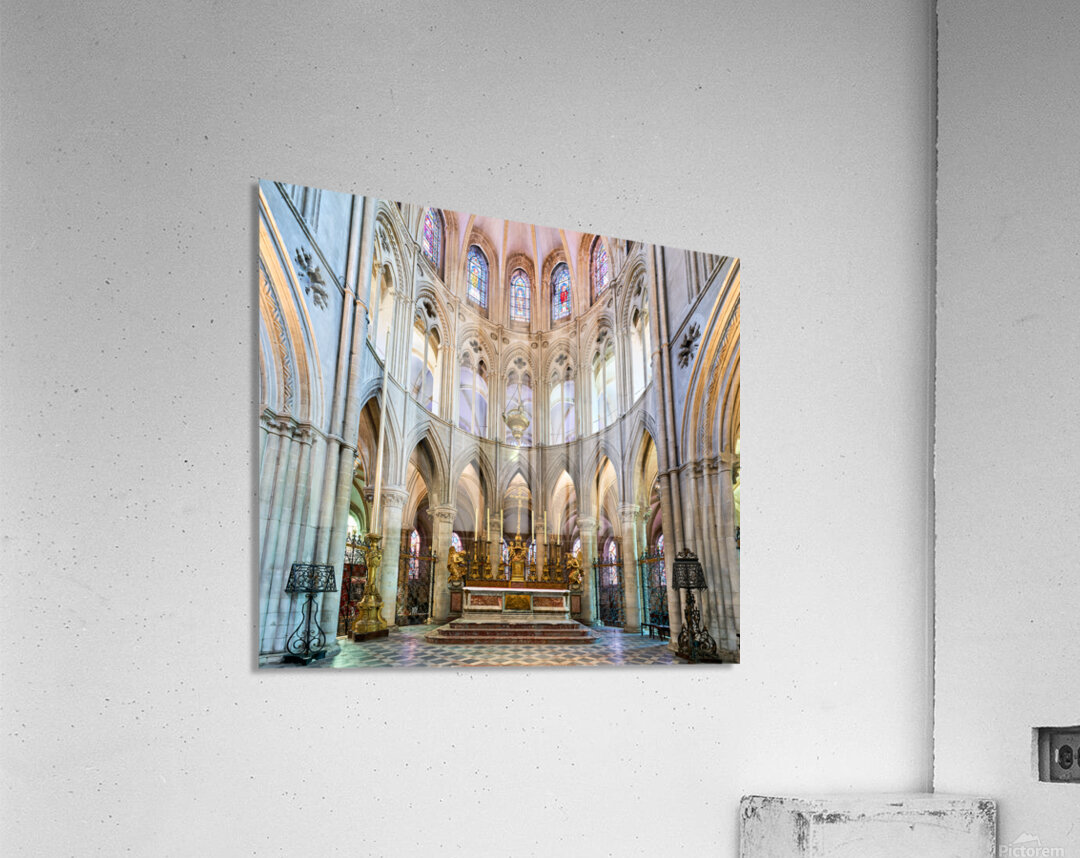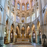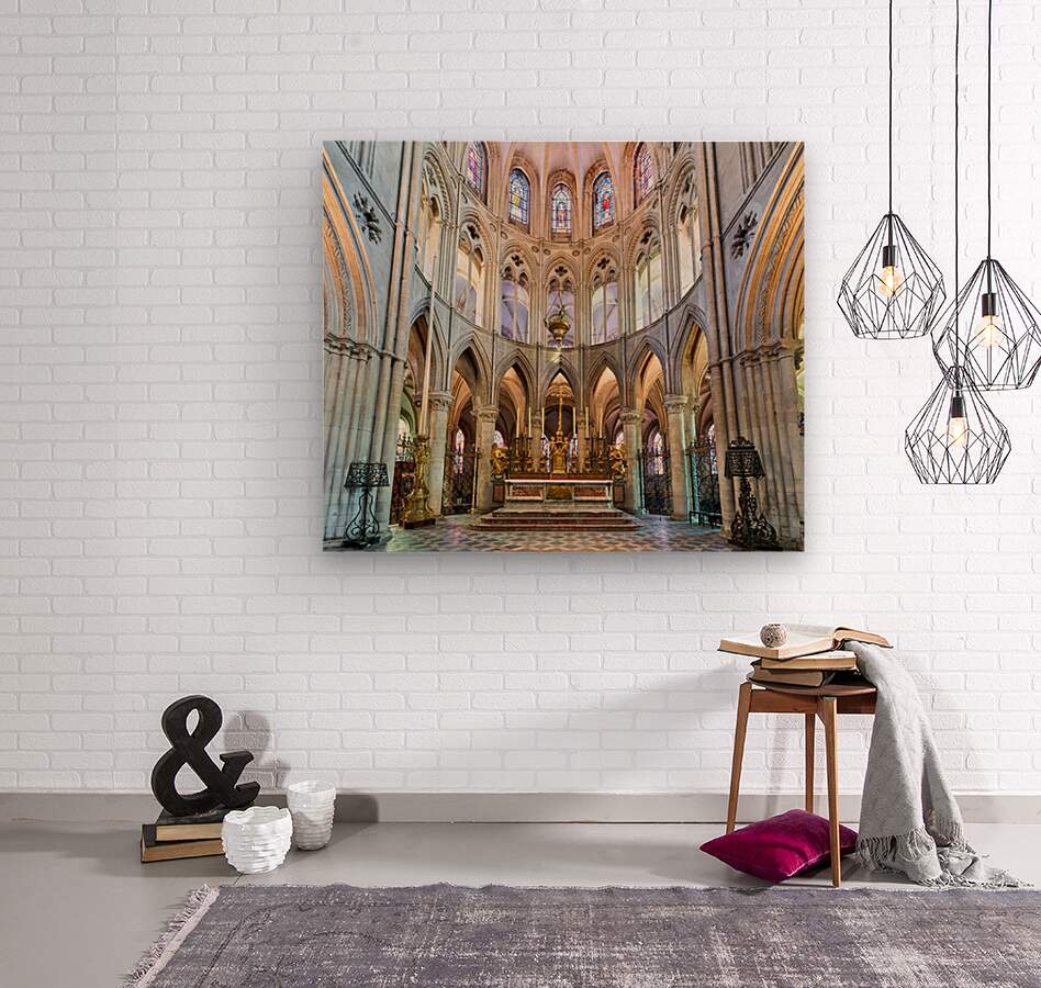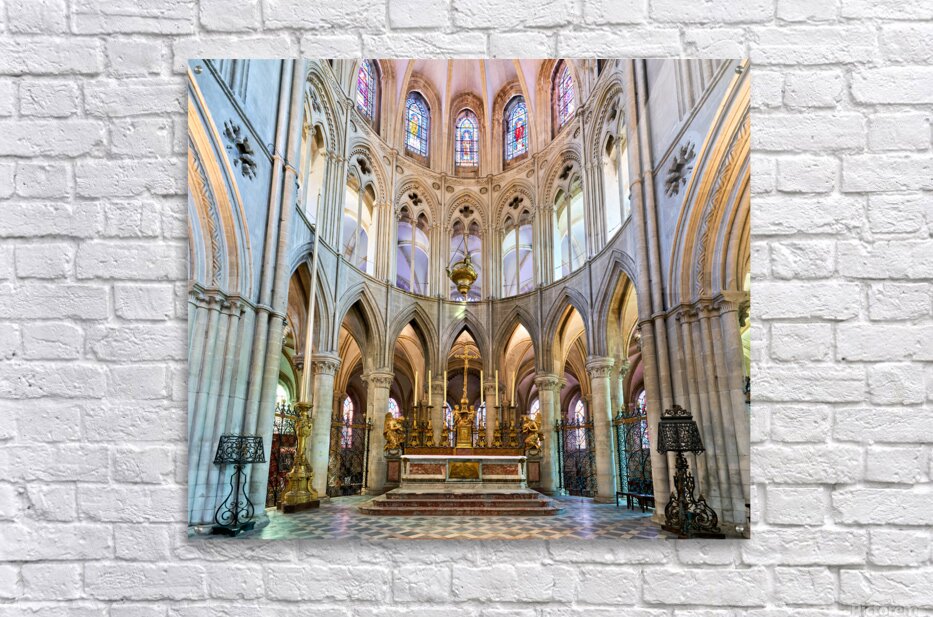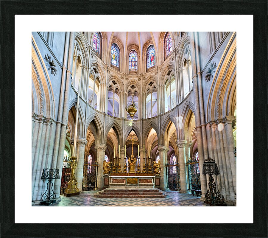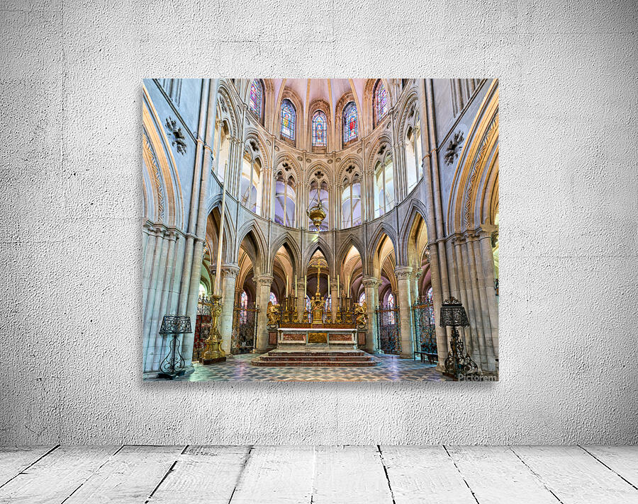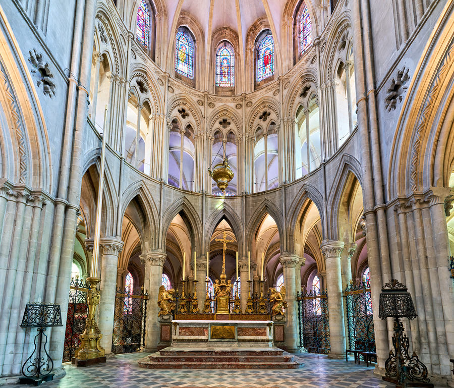 The altar is located in the Abbey of Saint-Etienne in Caen Normandy. It features tall arches and stained glass windows.