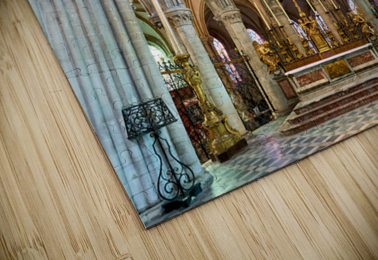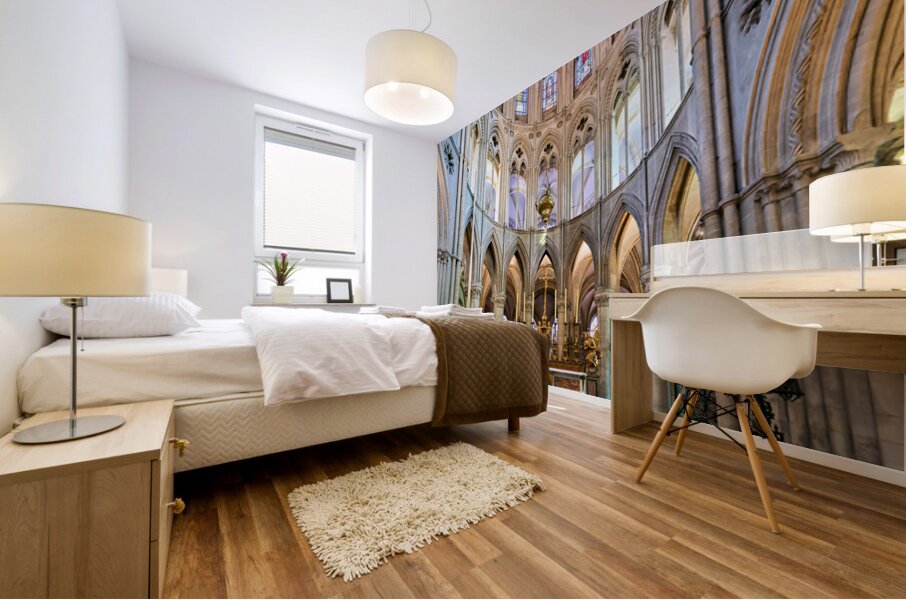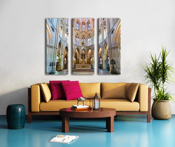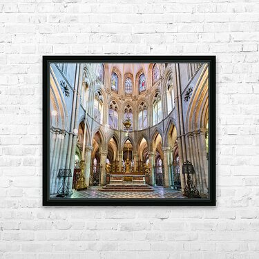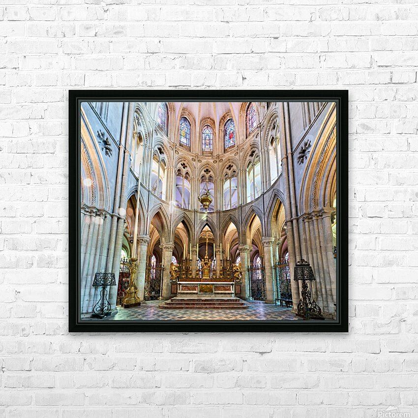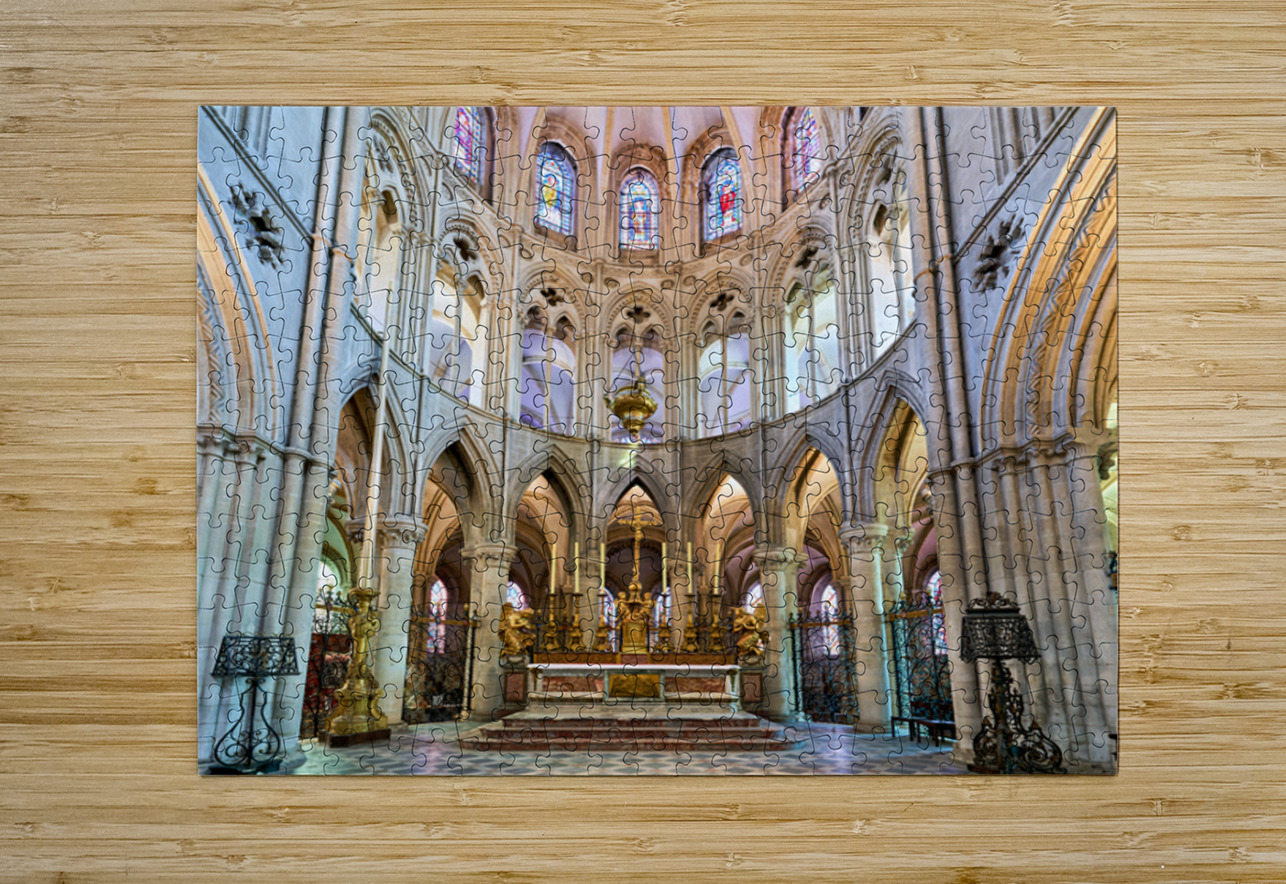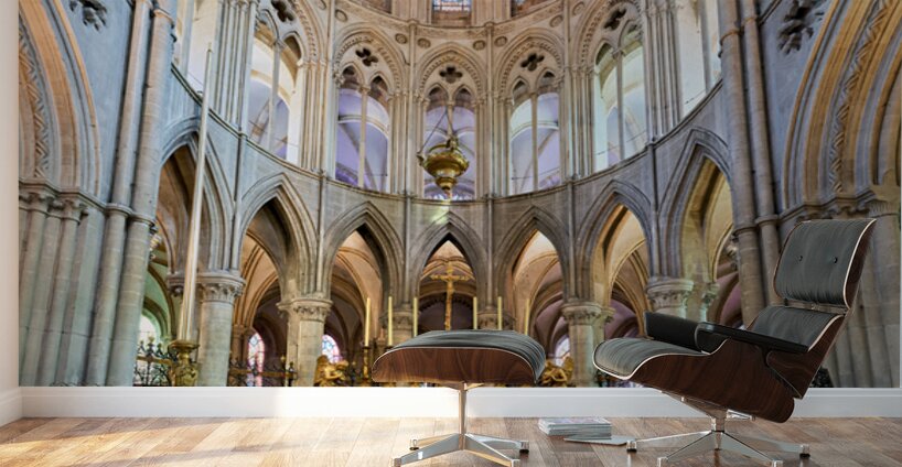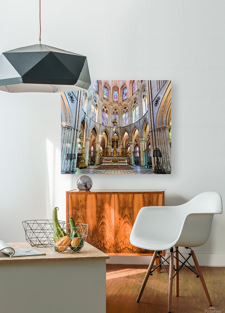 The altar is located in the Abbey of Saint-Etienne in Caen Normandy. It features tall arches and stained glass windows.