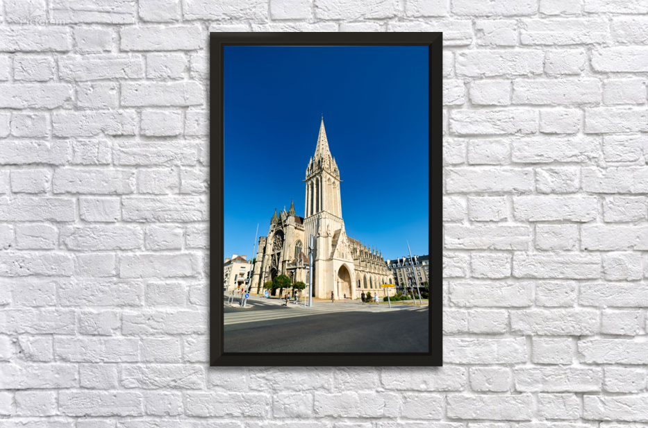 People walk near Saint Pierre church in Caen Normandy. The church displays unique architecture against a bright blue sky.
