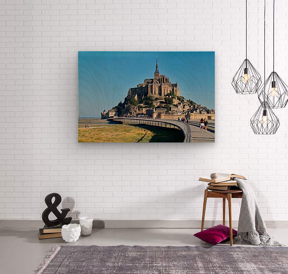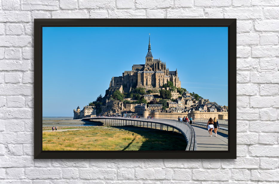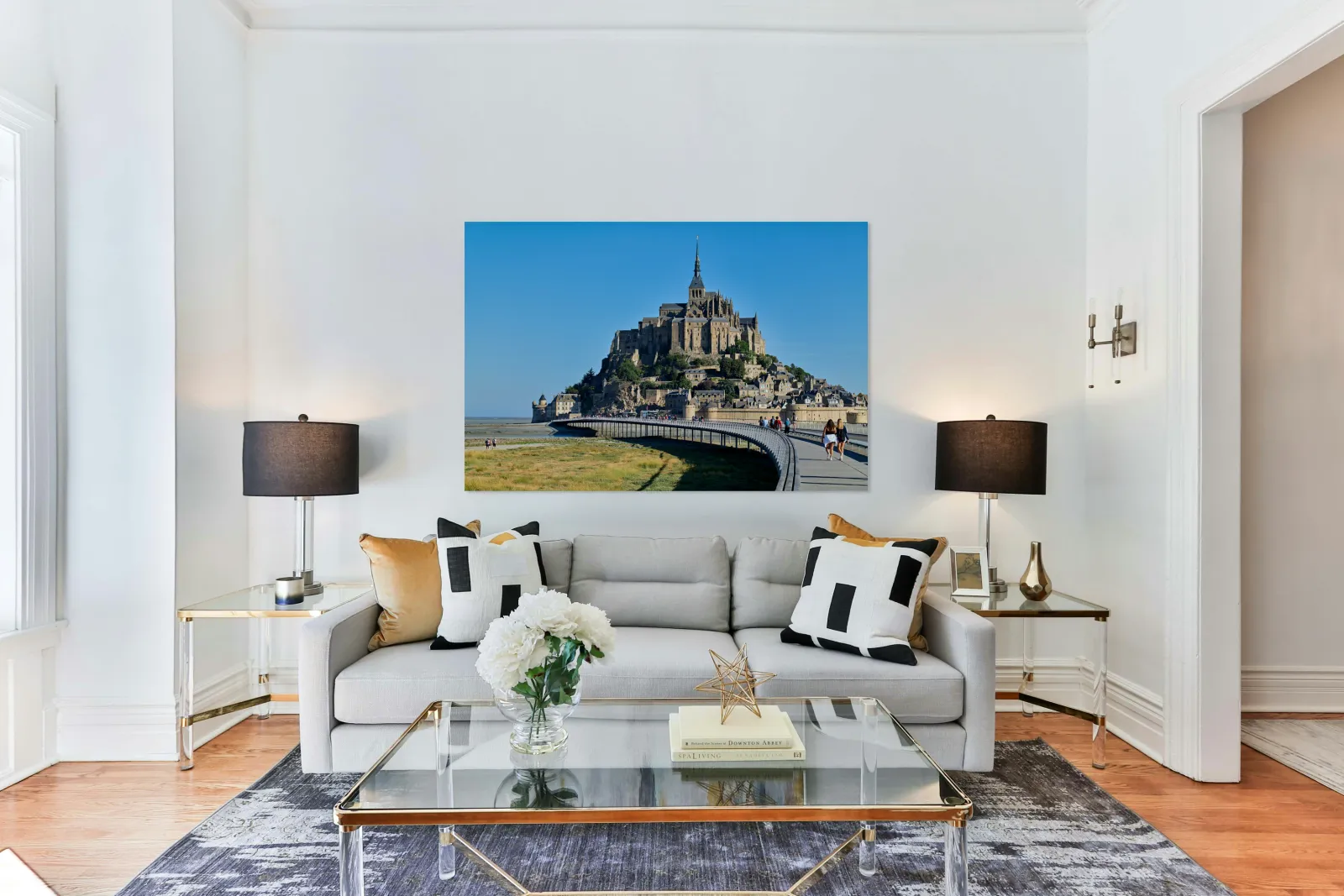 Groups of tourists walk on a path towards Mont Saint Michel in Normandy France during a sunny day. The historic site stands tall in the background.