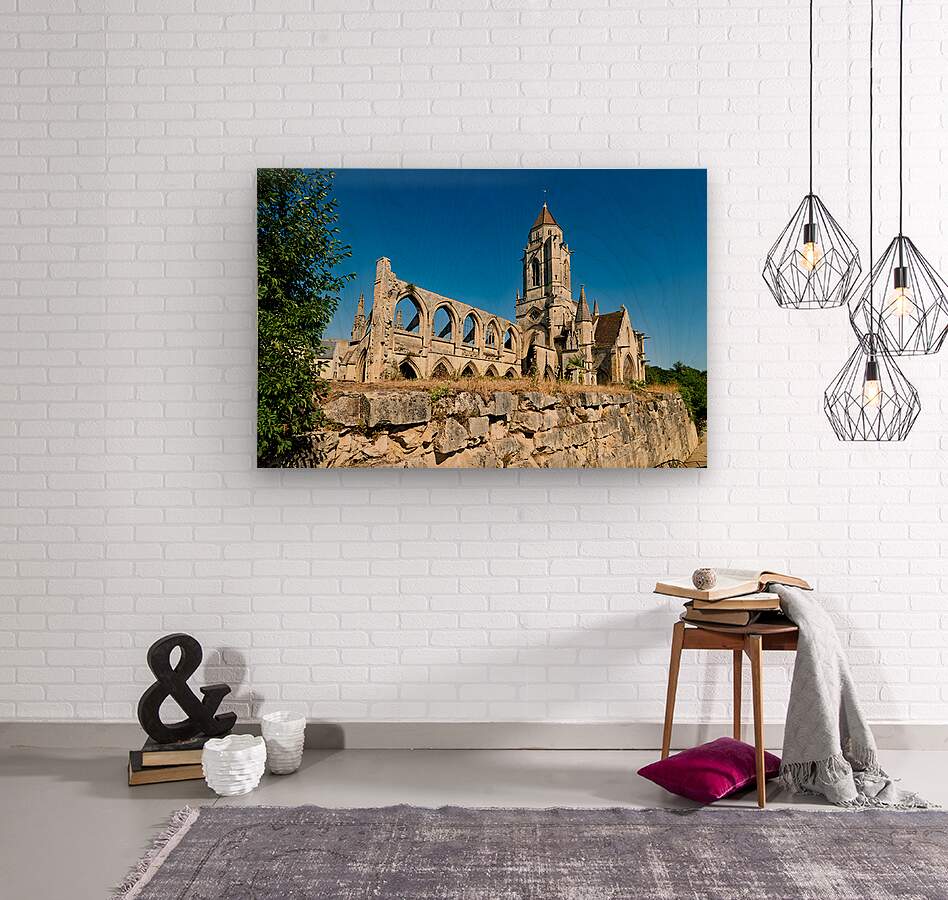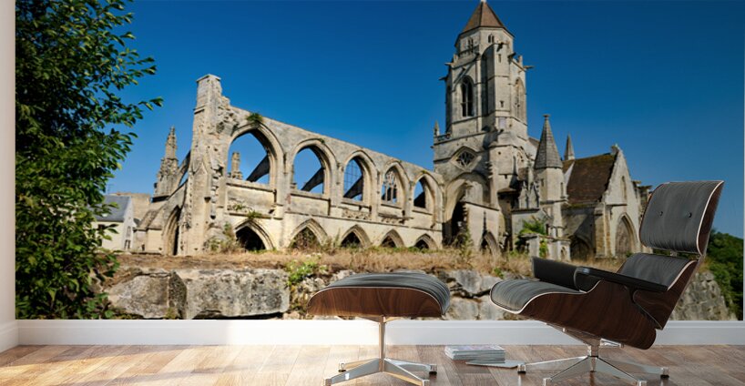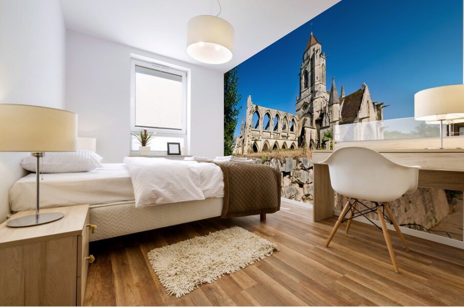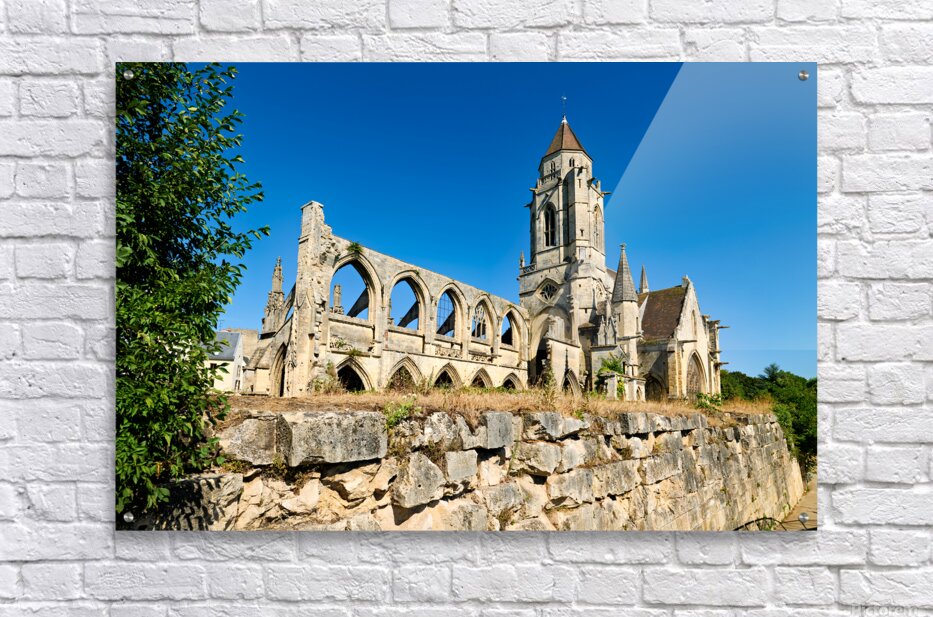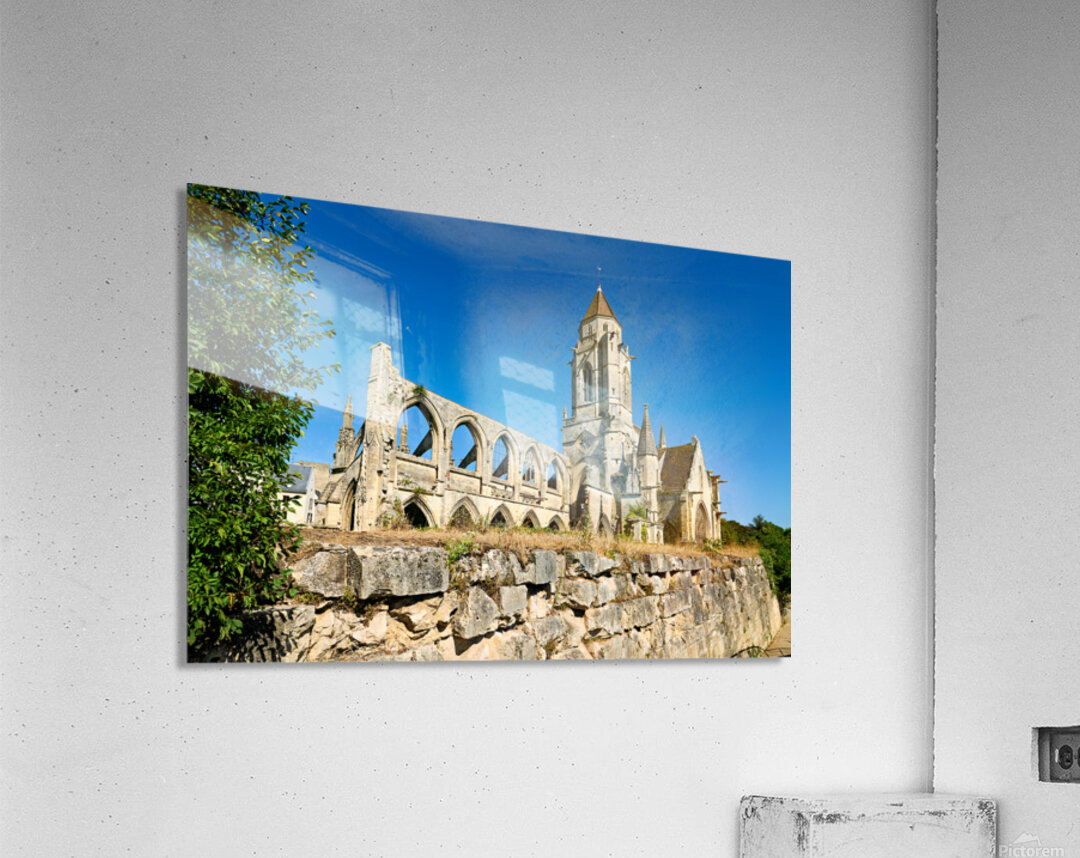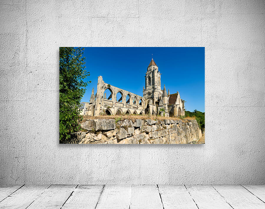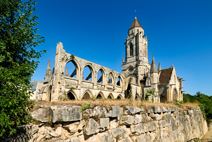 The remains of Saint Etienne le Vieux church stand in Caen France under a clear blue sky. The structure shows signs of age and history.