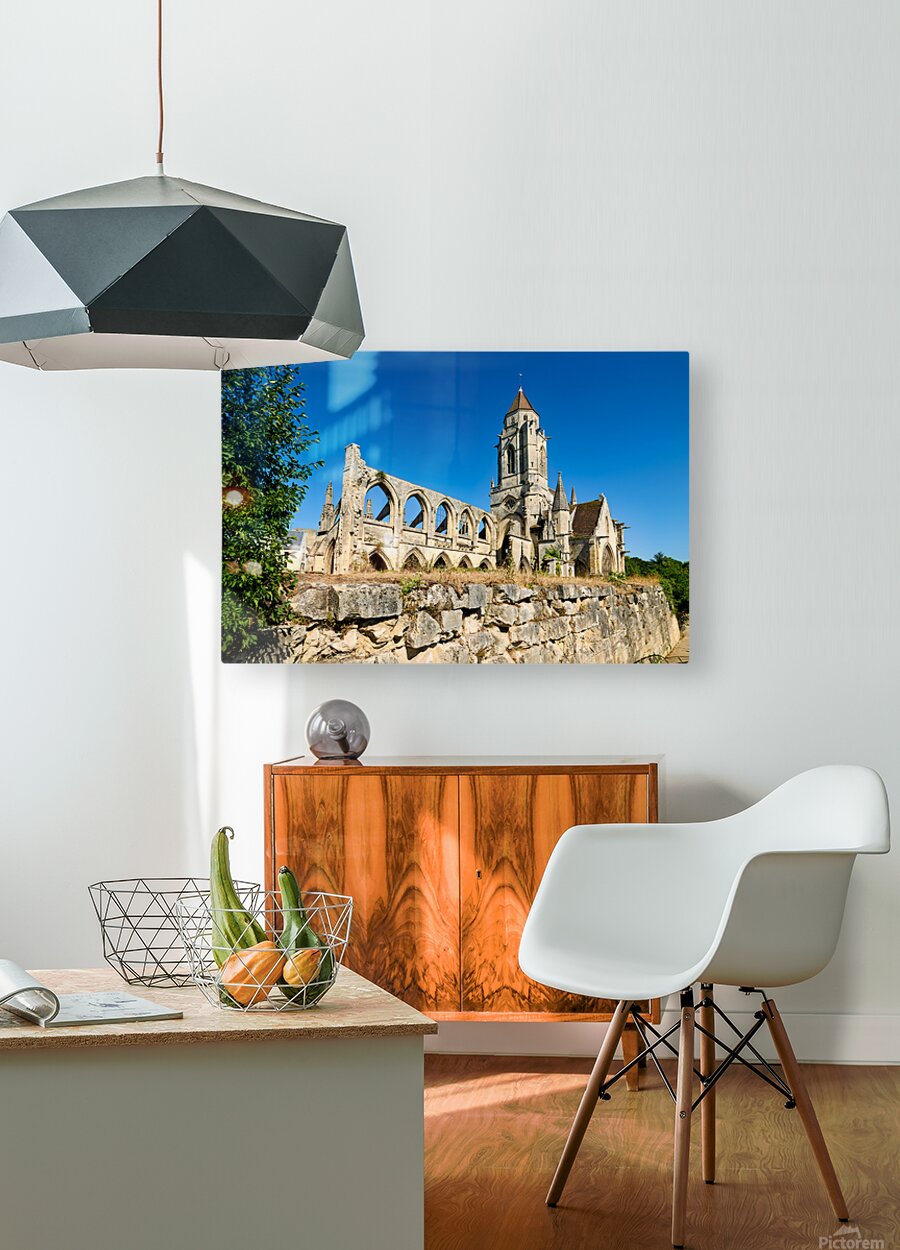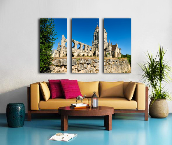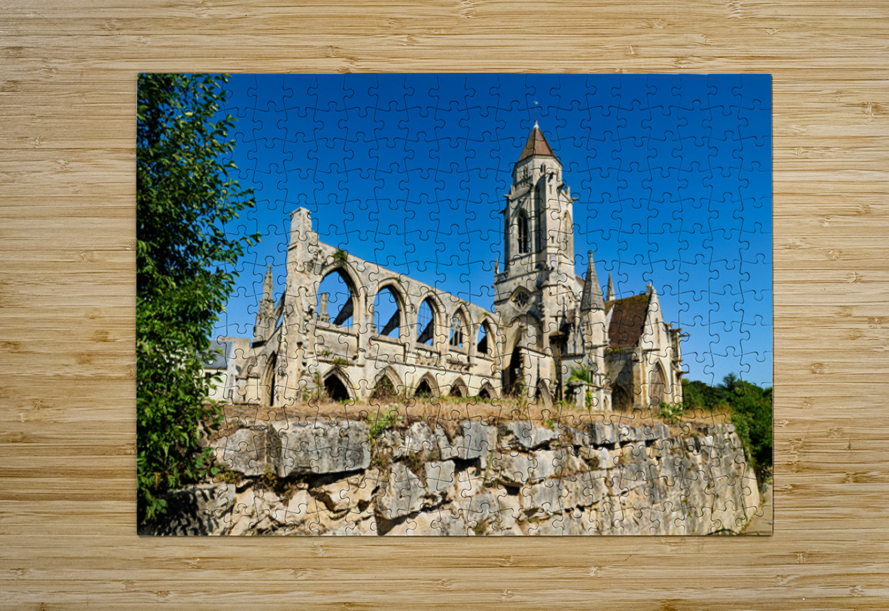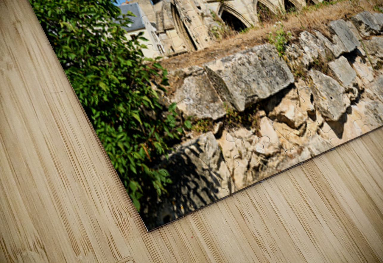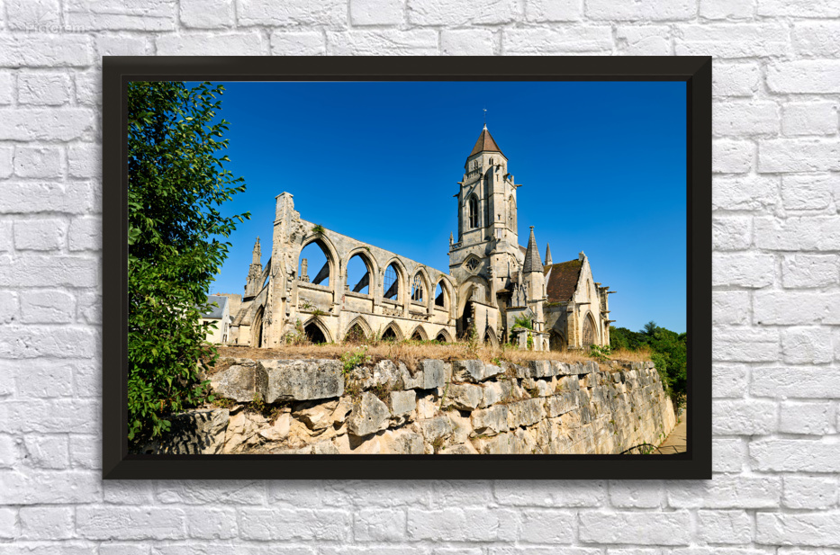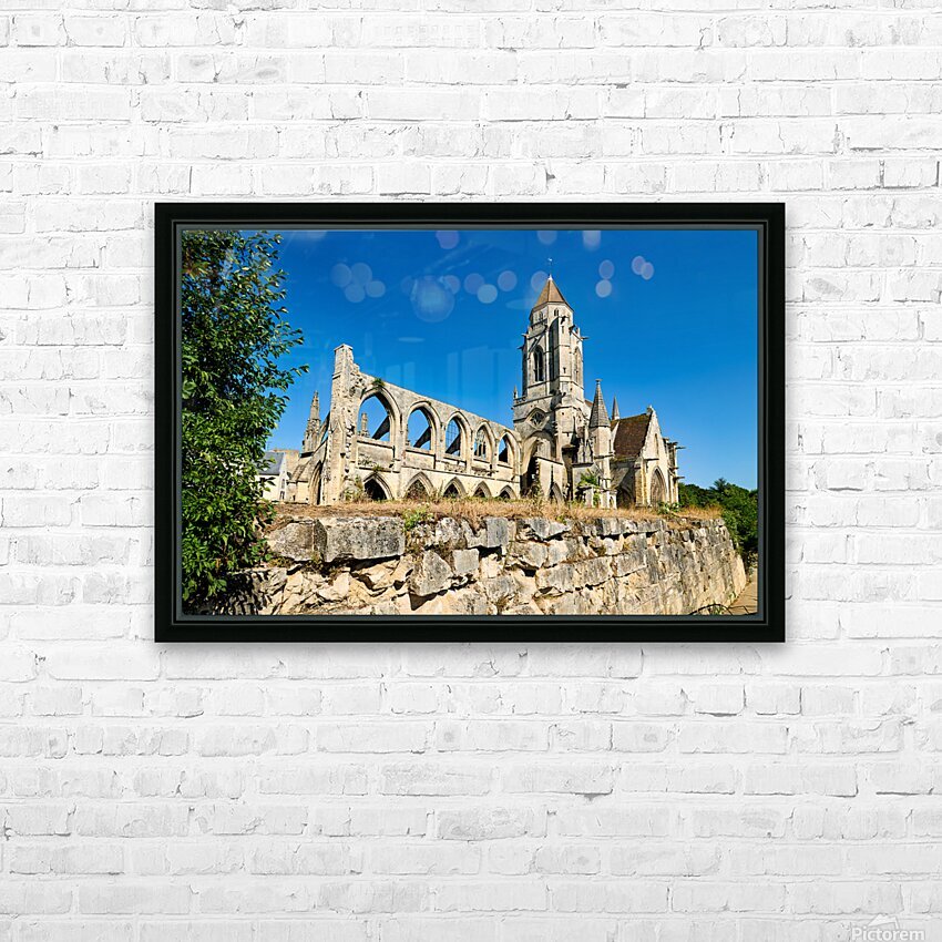 The remains of Saint Etienne le Vieux church stand in Caen France under a clear blue sky. The structure shows signs of age and history.