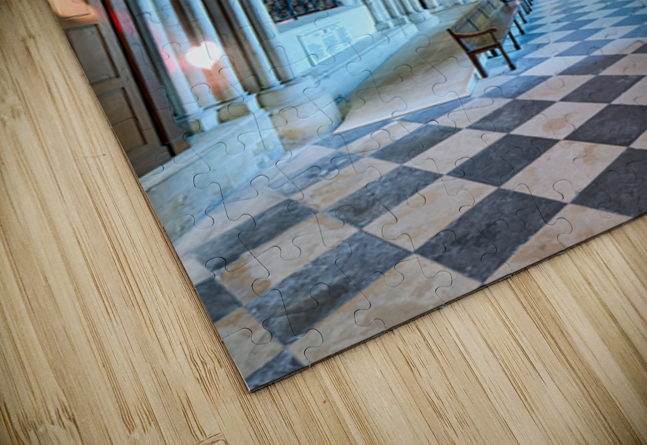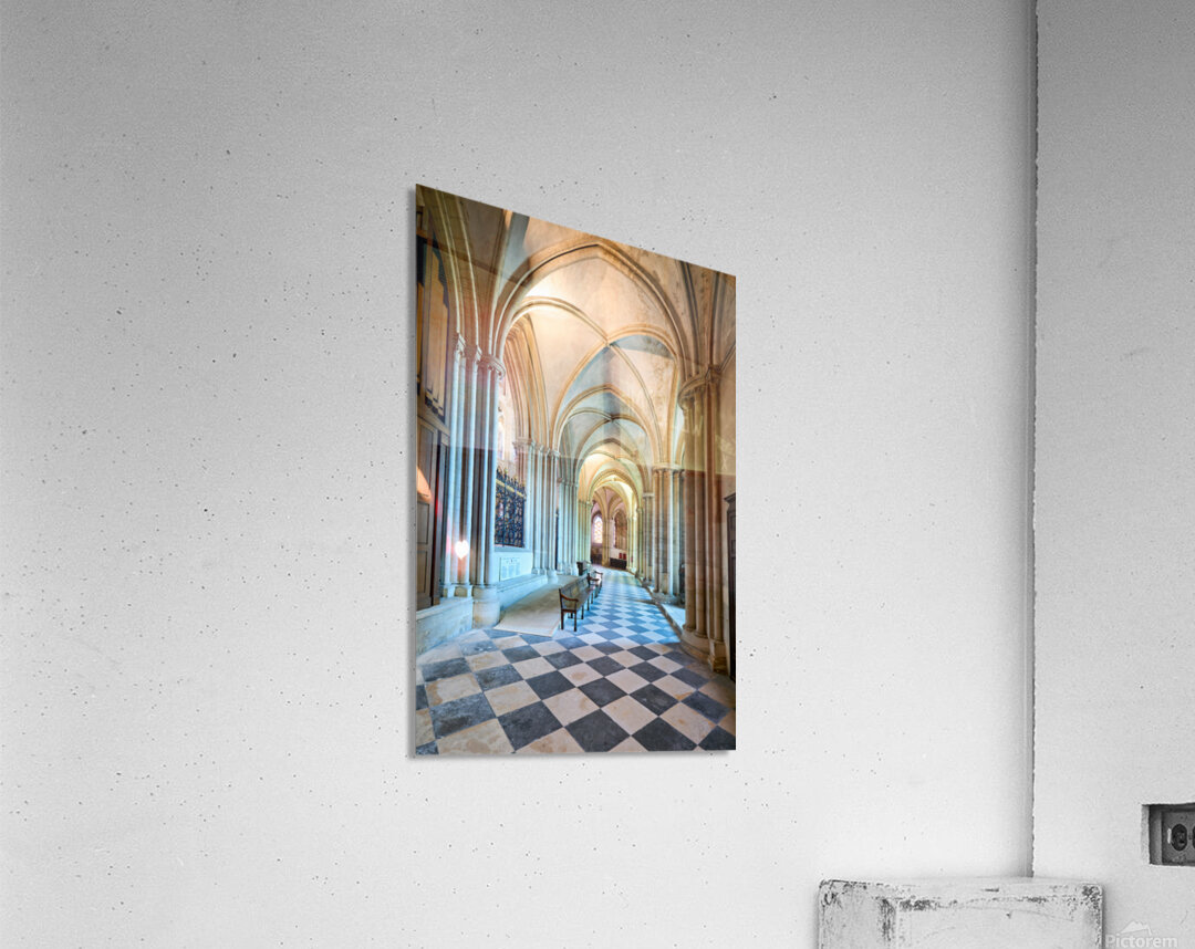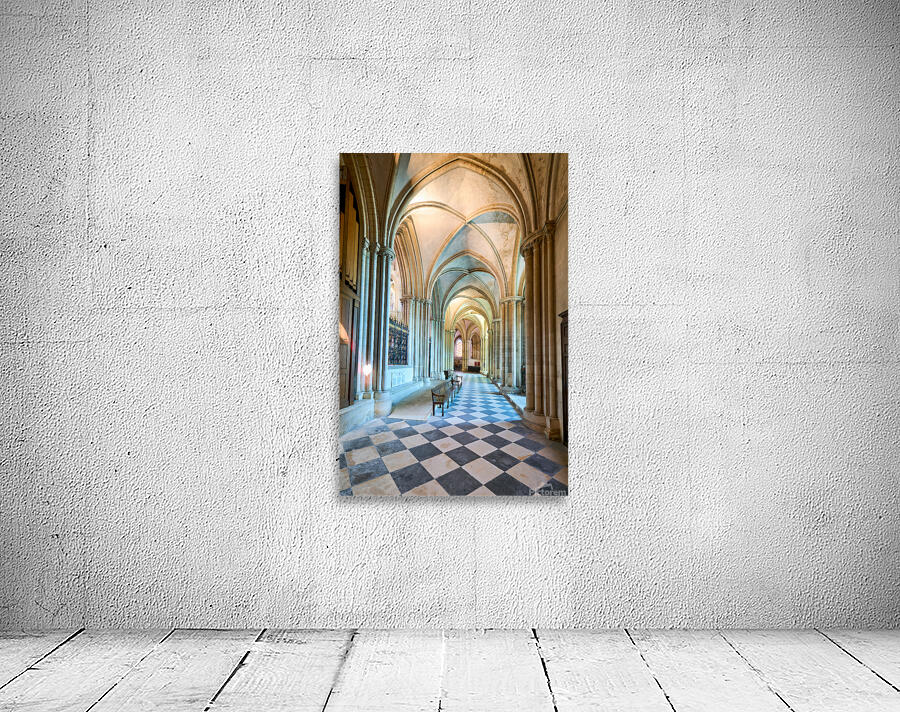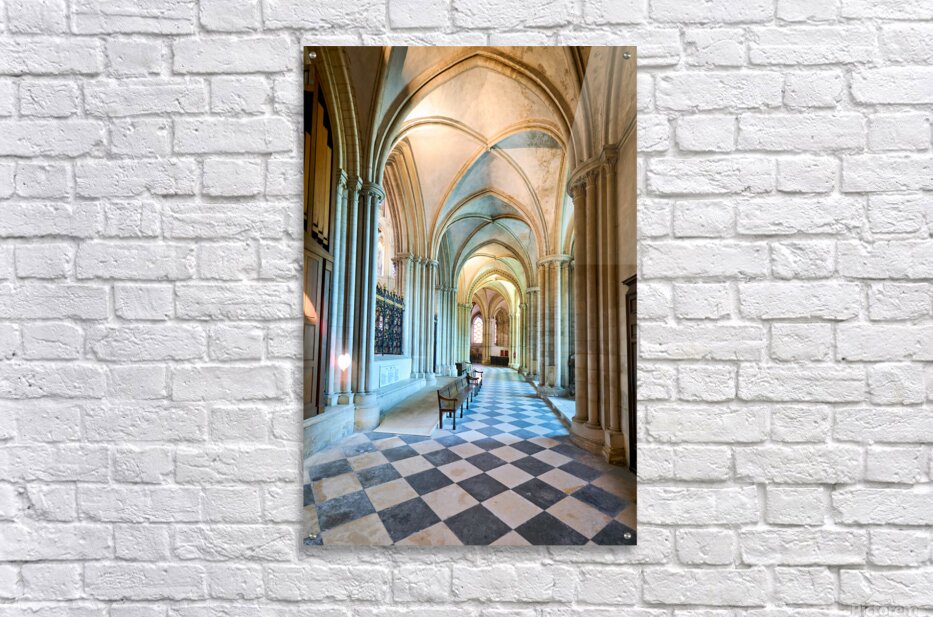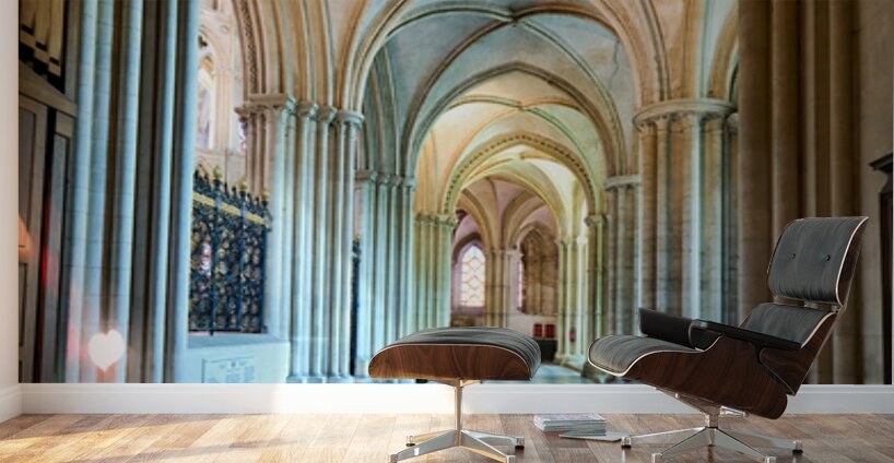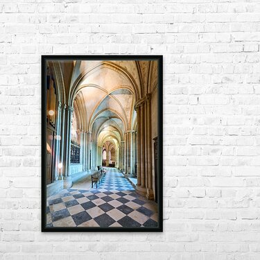 Visitors can see the stone arches and checkered floor inside the Abbey of Saint-Etienne in Caen during the day.
