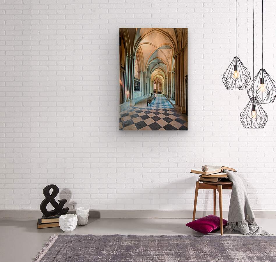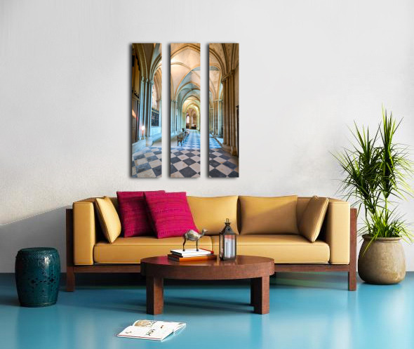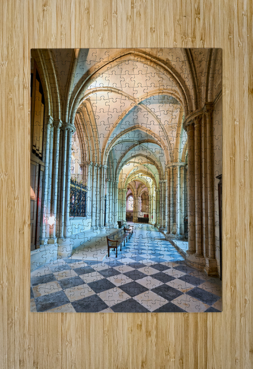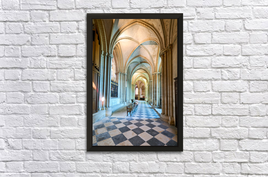 Visitors can see the stone arches and checkered floor inside the Abbey of Saint-Etienne in Caen during the day.