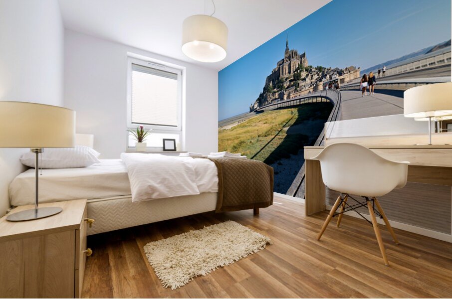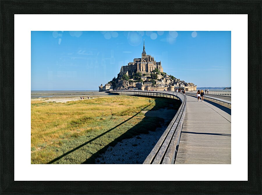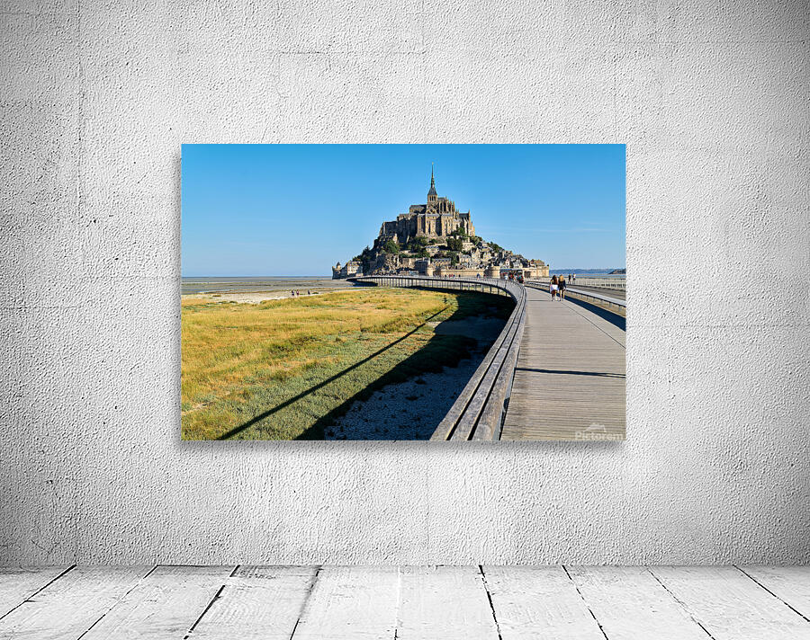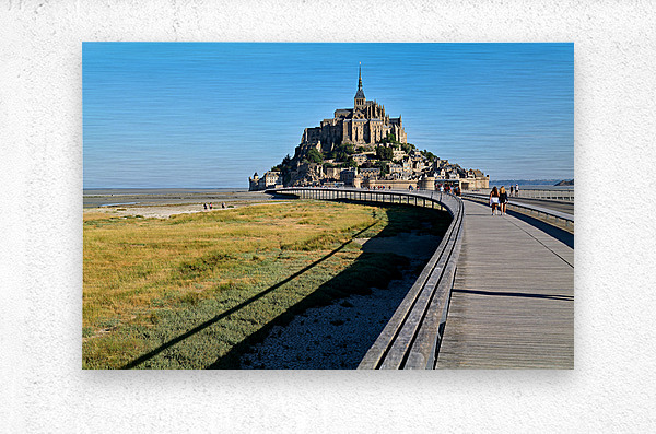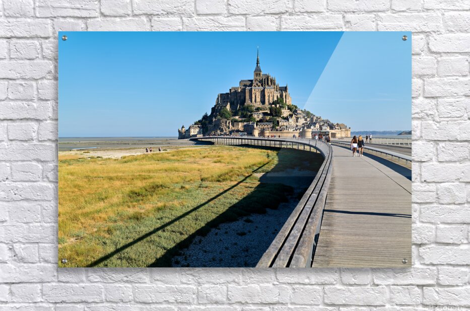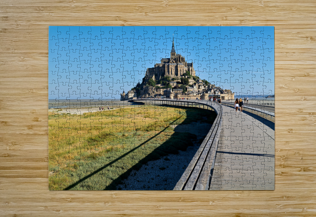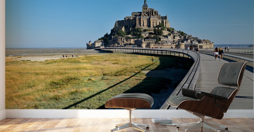 Visitors walk along the wooden bridge toward Mont Saint Michel in Normandy. The sun shines brightly as they enjoy their walk.