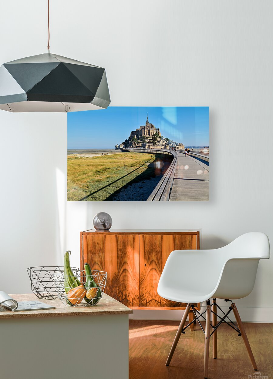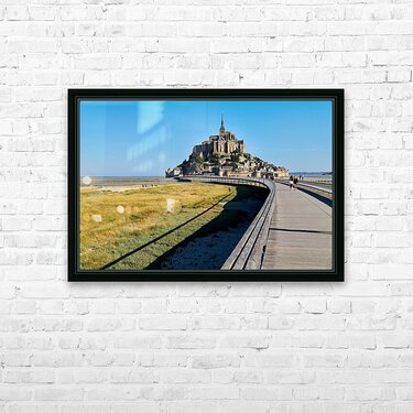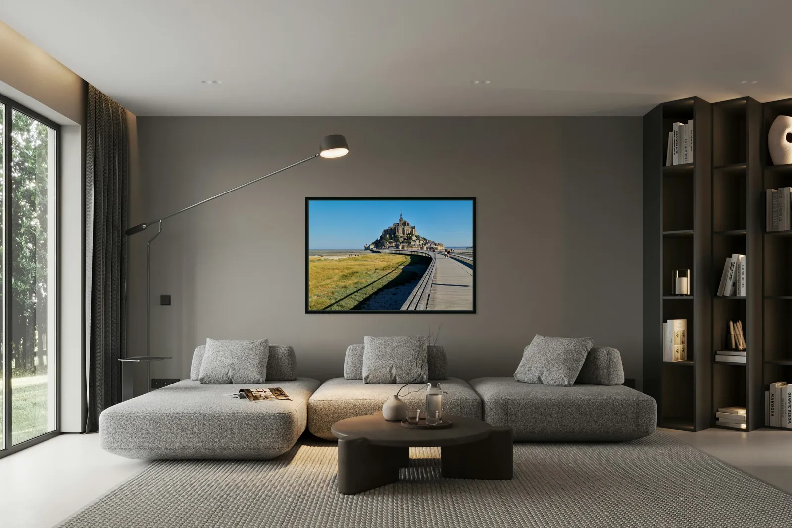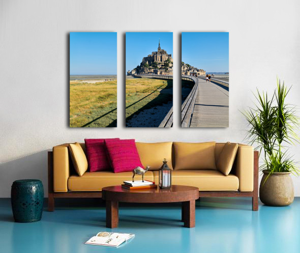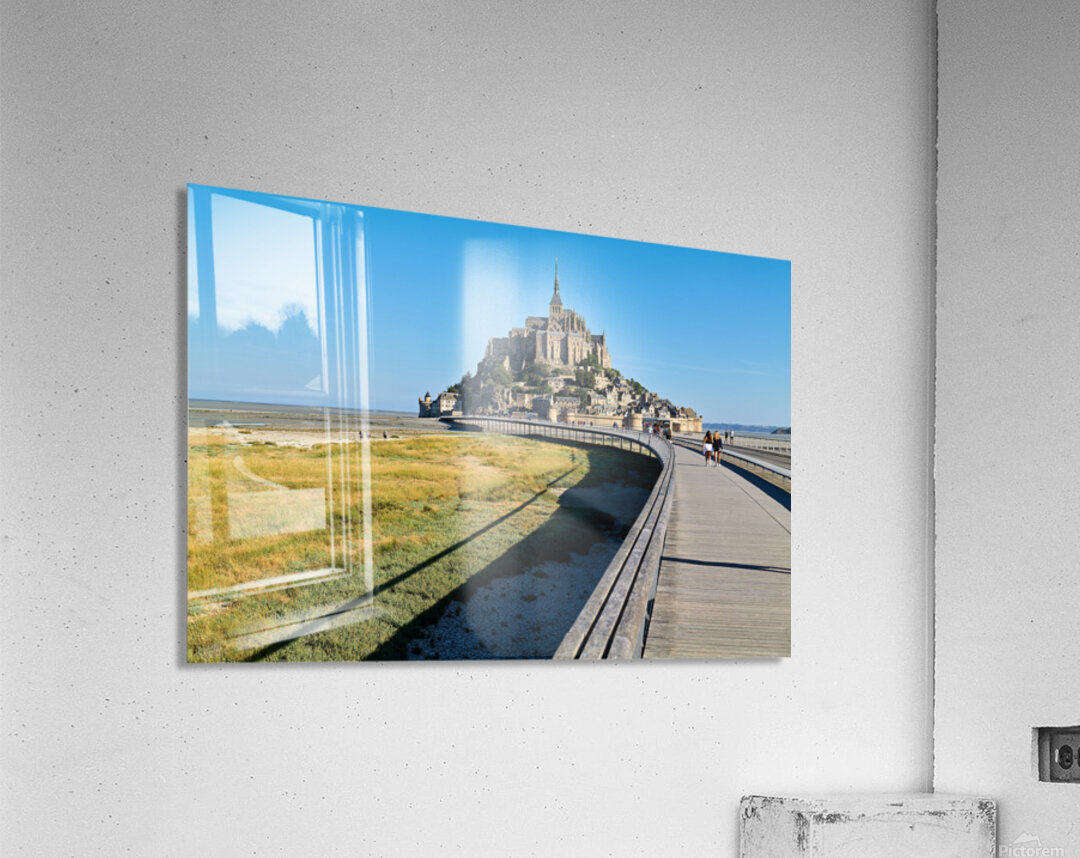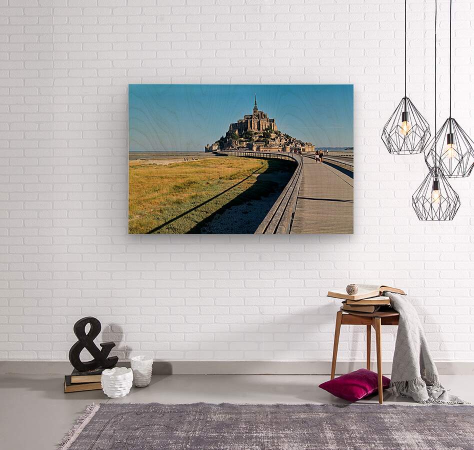 Visitors walk along the wooden bridge toward Mont Saint Michel in Normandy. The sun shines brightly as they enjoy their walk.