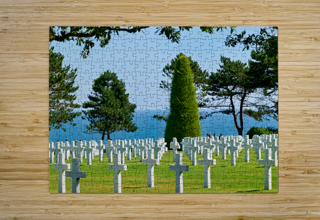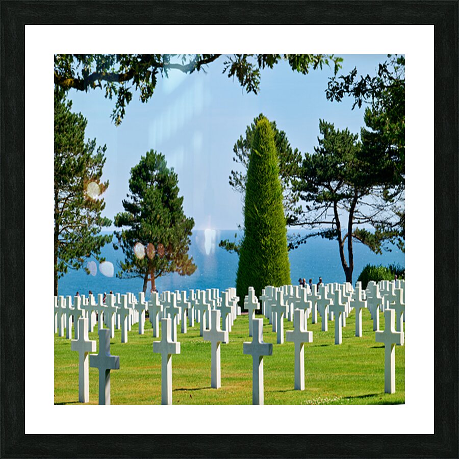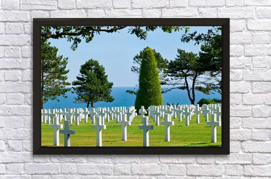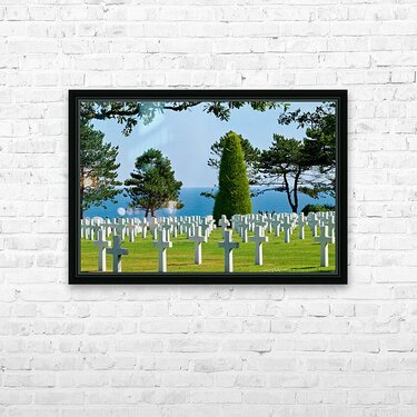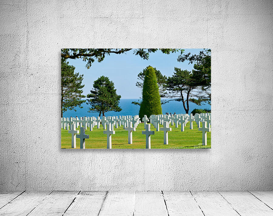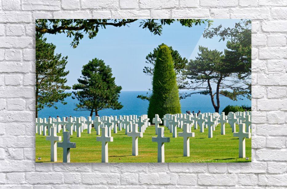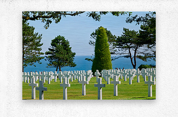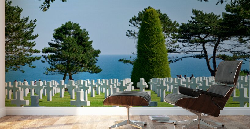 Grave markers stand in rows at the Normandy American Cemetery in Colleville sur Mer. The ocean glimmers in the background under a blue sky.